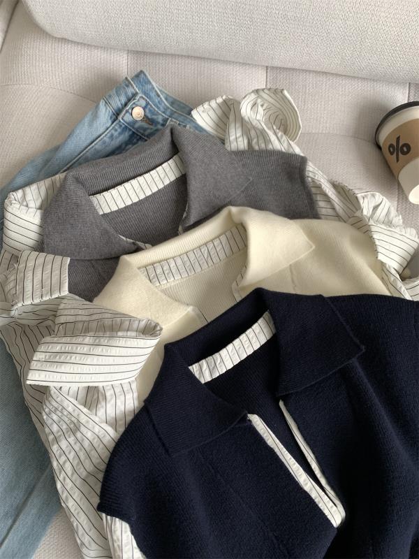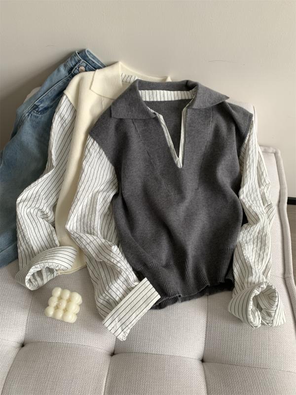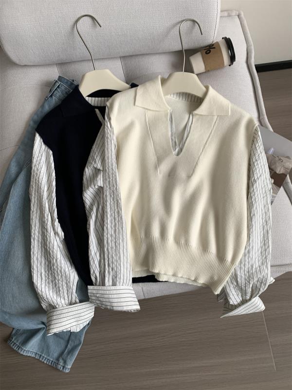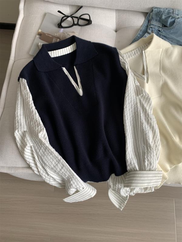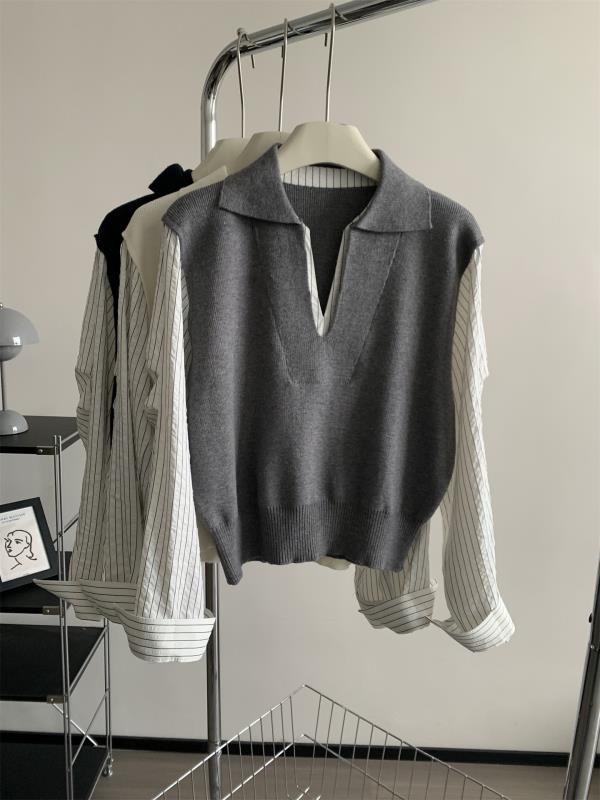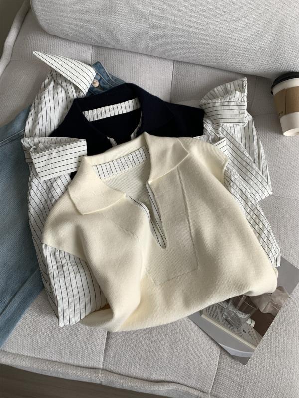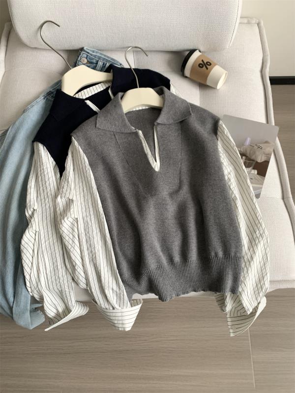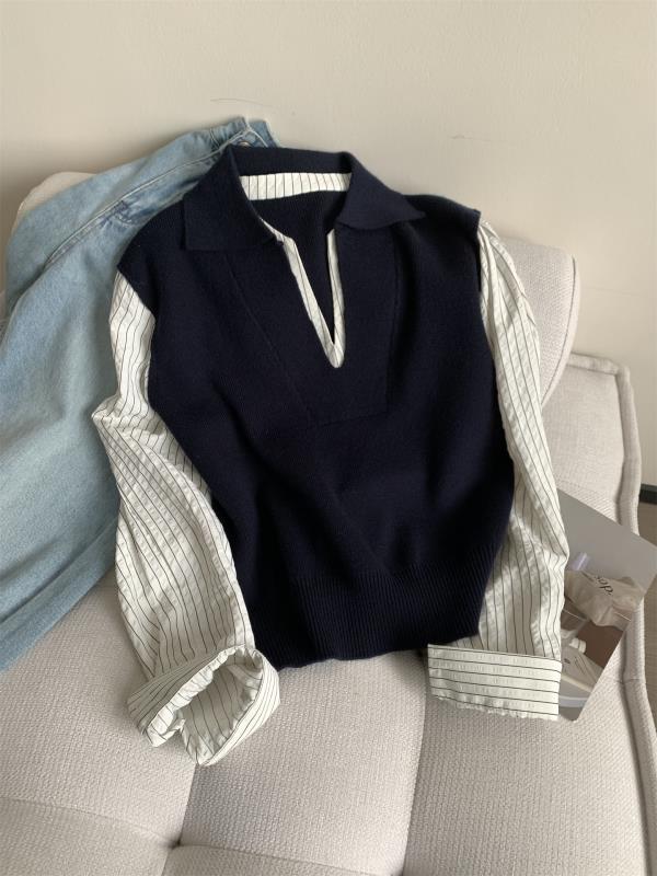 春季新品假两件拼接袖V领针织背心衬衫 洋气翻领针织上衣