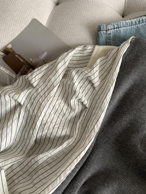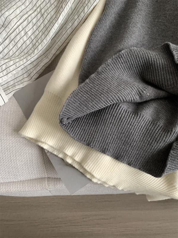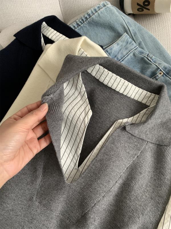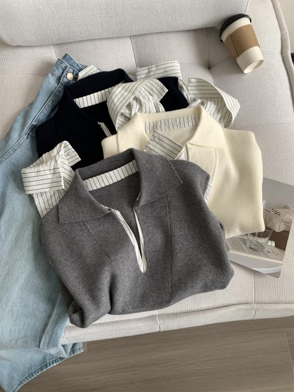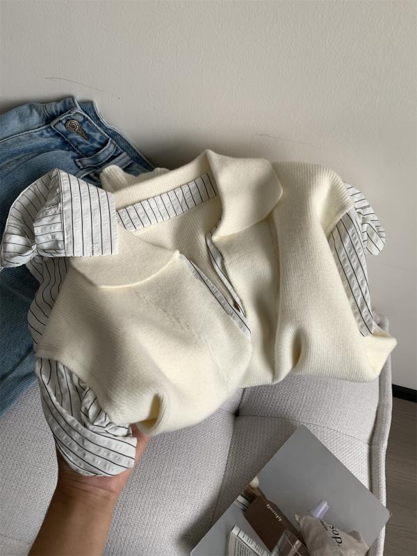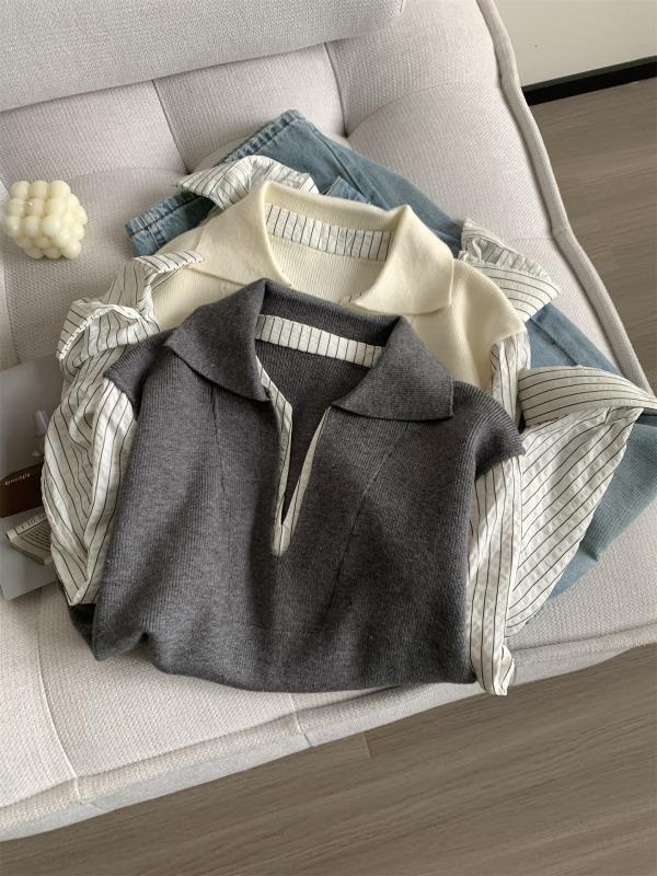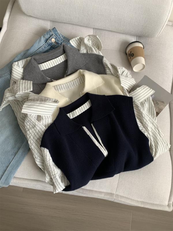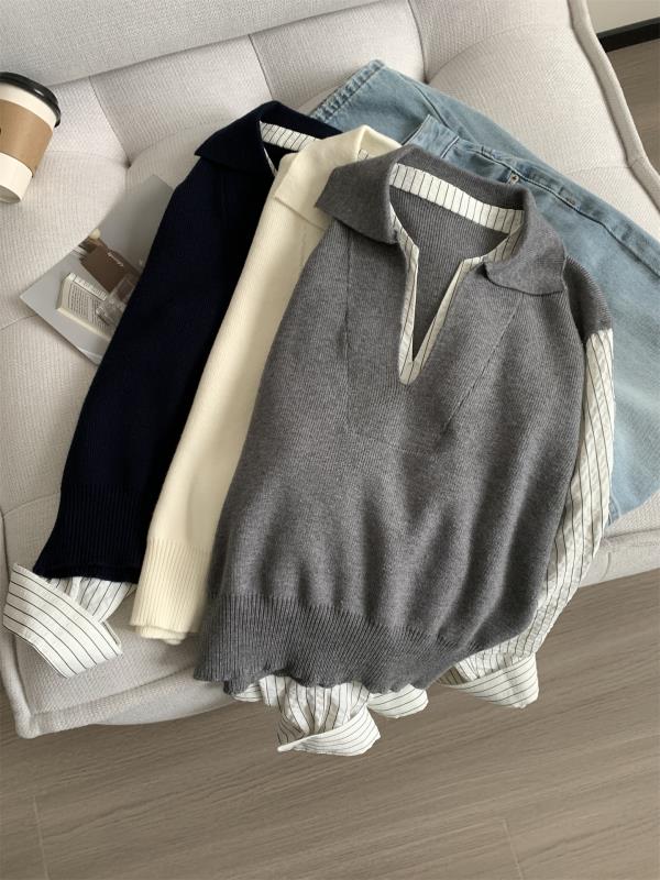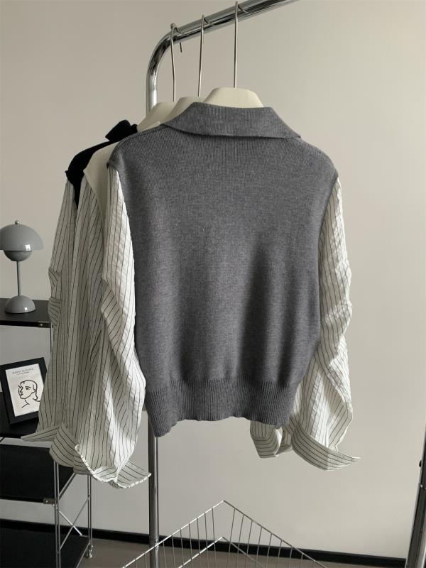 春季新品假两件拼接袖V领针织背心衬衫 洋气翻领针织上衣