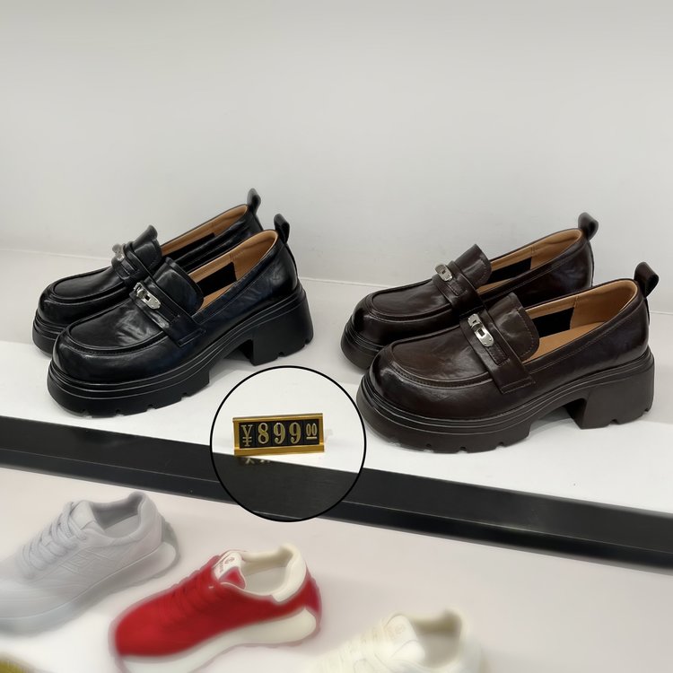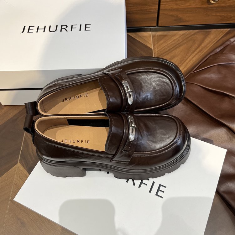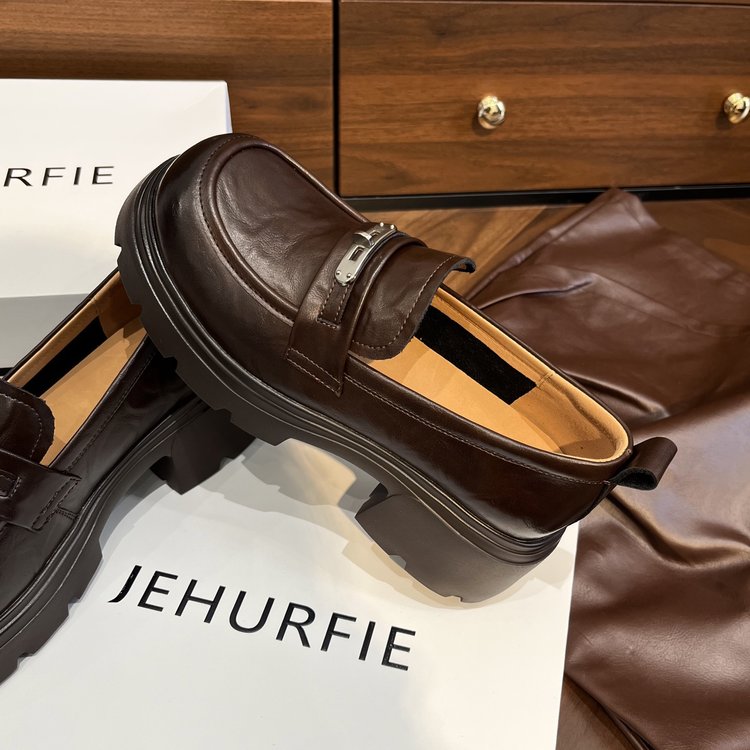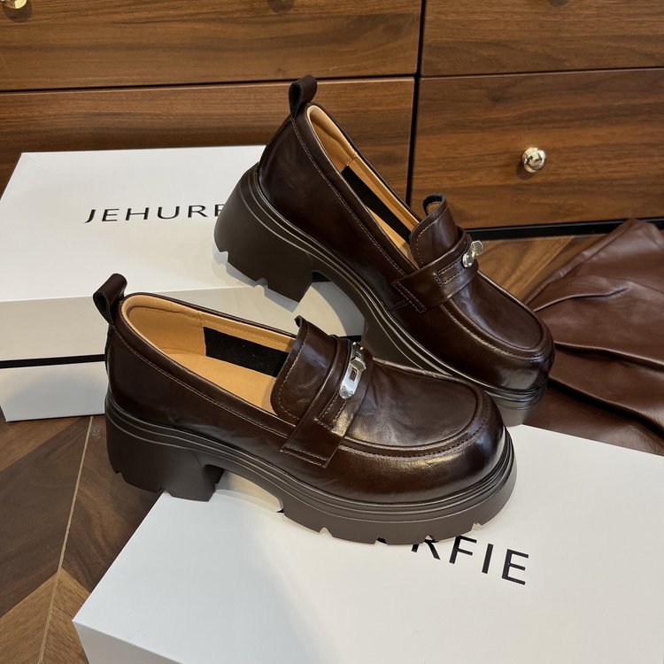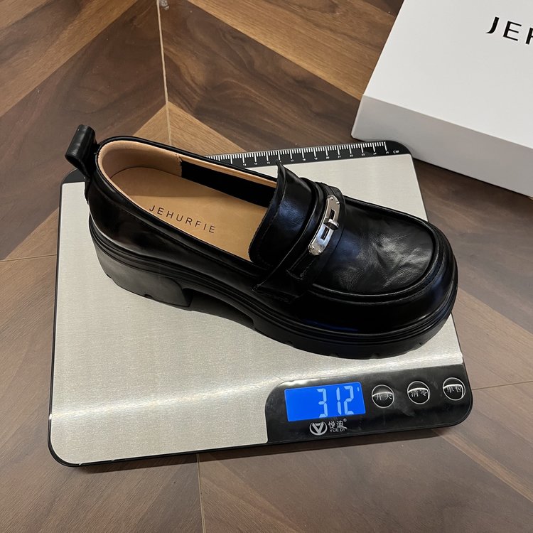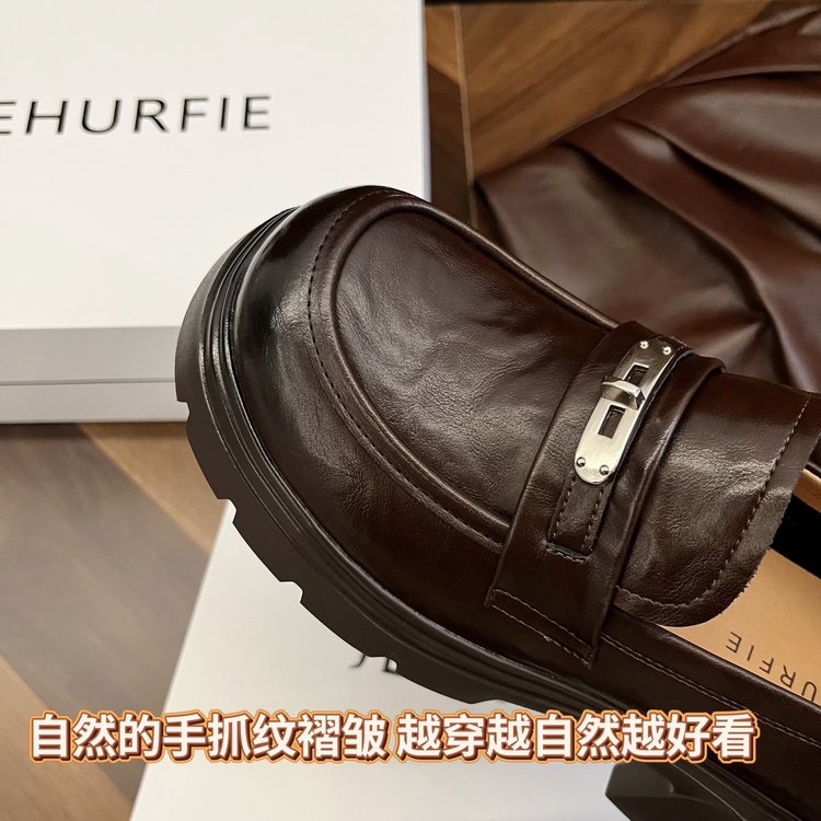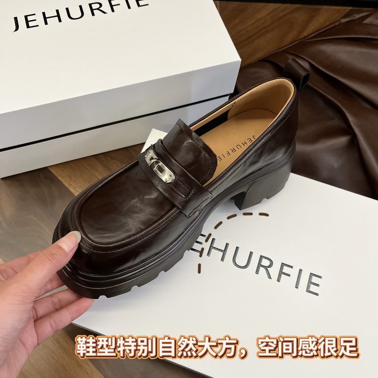 【货号】:AB26029【品牌】:JEHURFIE/纪华菲【产地】:温州【颜色】:黑色 棕色【 材质】:手抓牛皮【内里】: 单里【脚垫】:头层牛皮【鞋底】:橡胶发泡【跟高】:6CM【重量】:单只净重312g (37码)【款式】:乐福鞋【规格】: 35-40