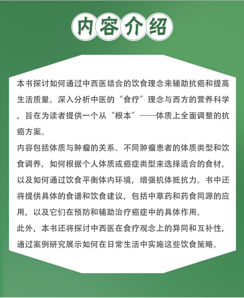 内容包括体质与肿瘤的关系、不同肿瘤患者的体质类型和饮食调养,如何根据个人体质或癌症类型来选择适合的食材,以及如何通过饮食平衡体内环境,增强机体抵抗力。书中还将提供具体的食谱和饮食建议,包括中草药和药食同源的应用,以及它们在预防和辅助治疗癌症中的具体作用。此外,本书还将探讨中西医在食疗观念上的异同和互补性,通过案例研究展示如何在日常生活中实施这些饮食策略。