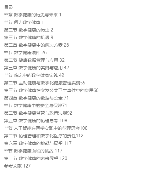 《数字健康》内容涵盖从数字健康的历史演变、当前实践到未来发展的各个方面。从数字健康硬件的创新应用到健康数据的管理与运用,再到数字技术在临床实践和公共卫生事件中的应用,《数字健康》详细介绍了数字健康技术的多面性和复杂性。此外,《数字健康》还对数字健康的数据安全问题、政策法规以及伦理挑战进行了深入探讨,提出了对策和建议,为读者呈现一个多维度的认知框架。