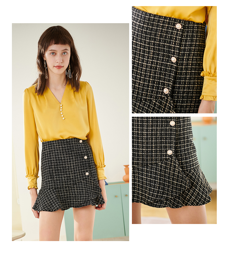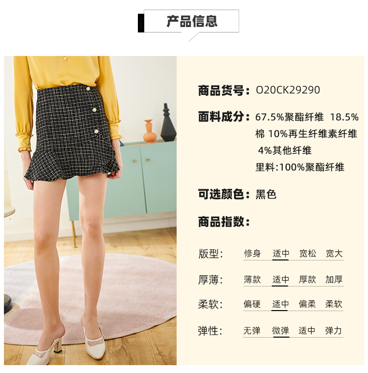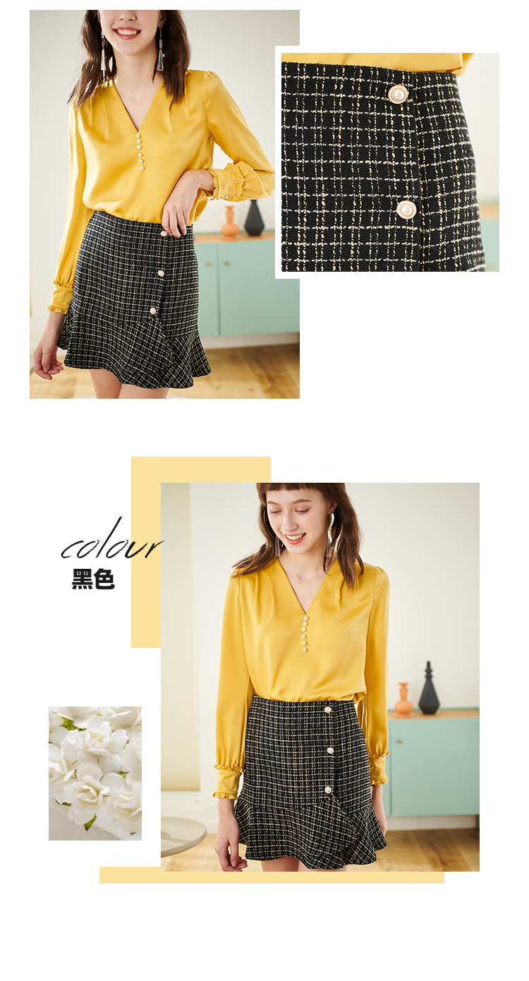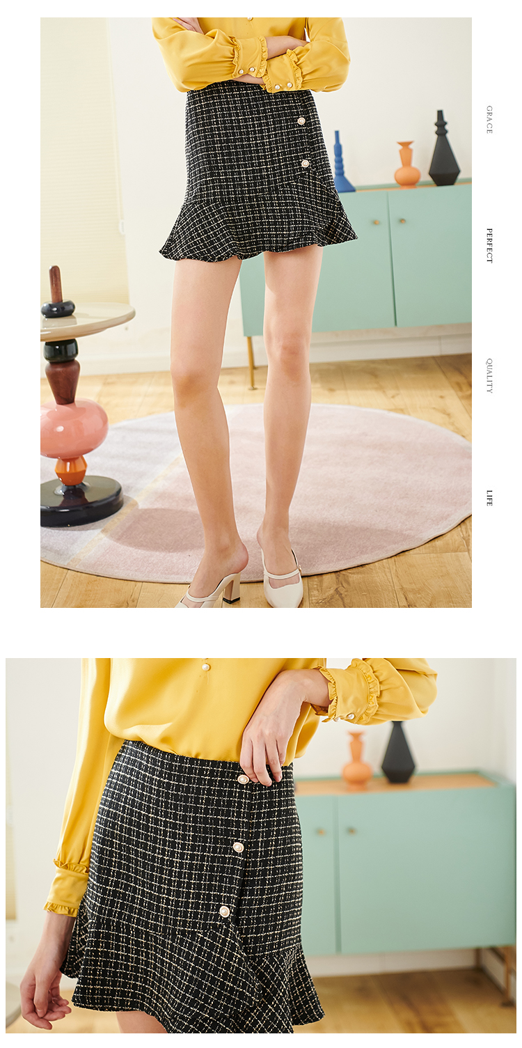 欧芮儿春新款高腰显瘦格子半身裙女小香风短裙不规则鱼尾裙