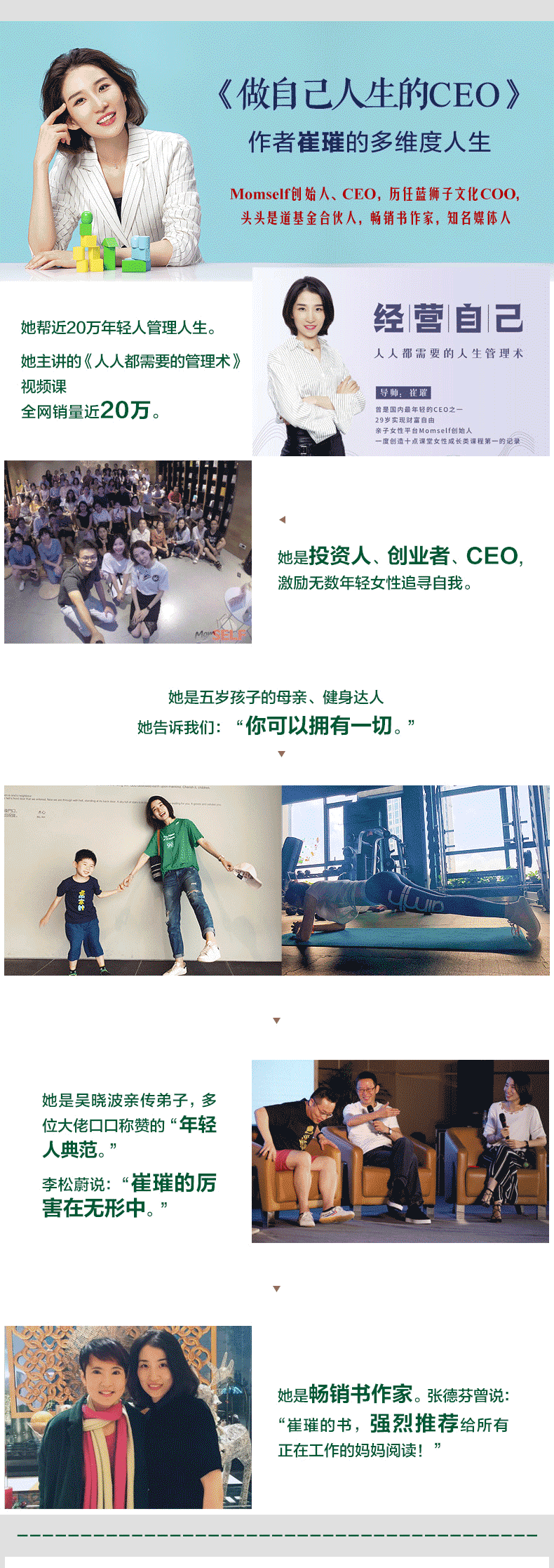 10年间她从爱哭的职场小白,到年轻的CEO,再到投资合伙人,公司创始人,崔璀跟你讲述她10年来的所得所想——12堂人人需要的人生管理术。