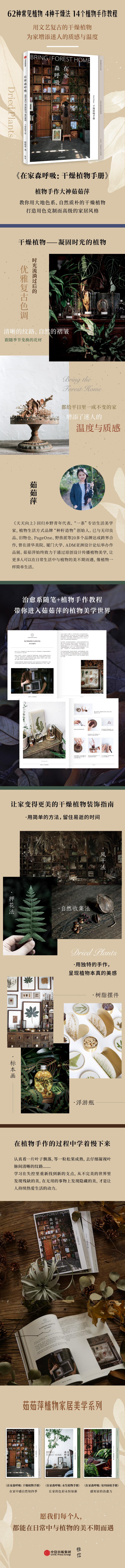 让家变得更美的干燥植物装饰指南。风干法、押花法、自然收集法,用简单的方法,留住易逝的时间;标本画、树脂摆件、浮游瓶,用独特的手作,呈现植物本真的美感。