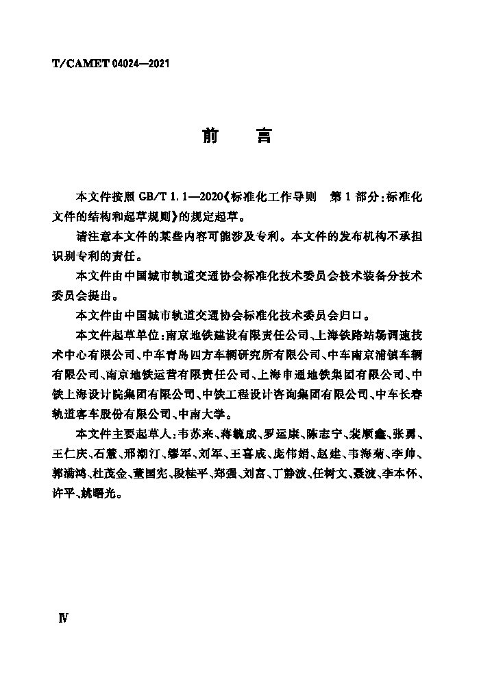 本规范由南京地铁建设有限责任公司、上海铁路站场调速技术中心有限公司、中车青岛四方车辆研究所有限公司、中车南京浦镇车辆有限公司、南京地铁运营有限责任公司、上海申通地铁集团有限公司、中铁上海设计院集团有限公司、中铁工程设计咨询集团公司、中车长春轨道客车股份有限公司、中南大学等单位,按照GB/T 1.1—2020《标准化工作导则 第1部分:标准化文件的结构和起草规则》的规定起草,由中国城市轨道交通协会标准化技术委员会归口。