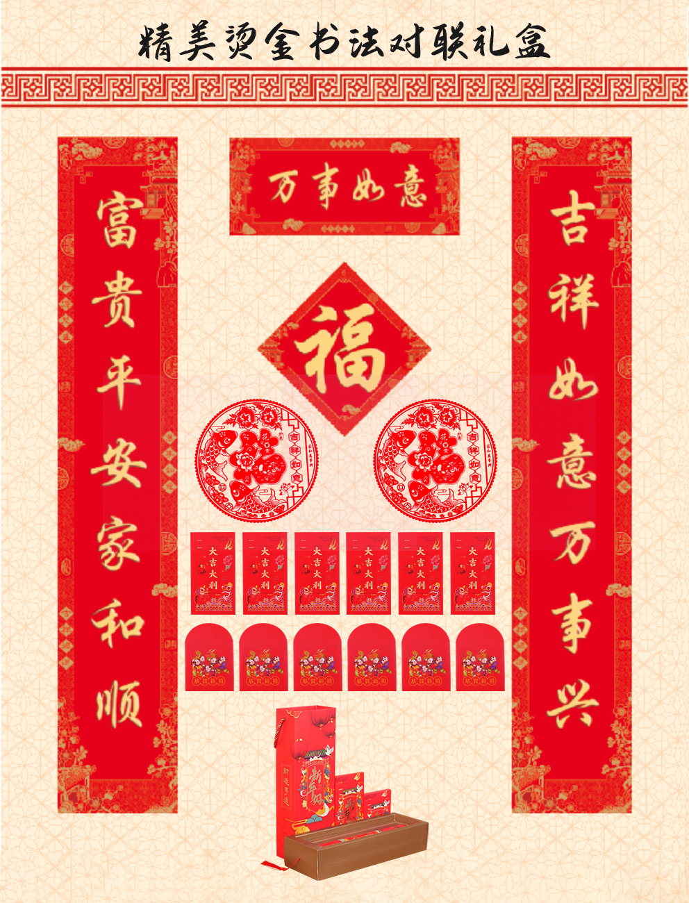 内含:特种纸烫金对联1副,窗花2张,福字1张,大红包6个,小红包6个。