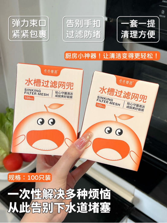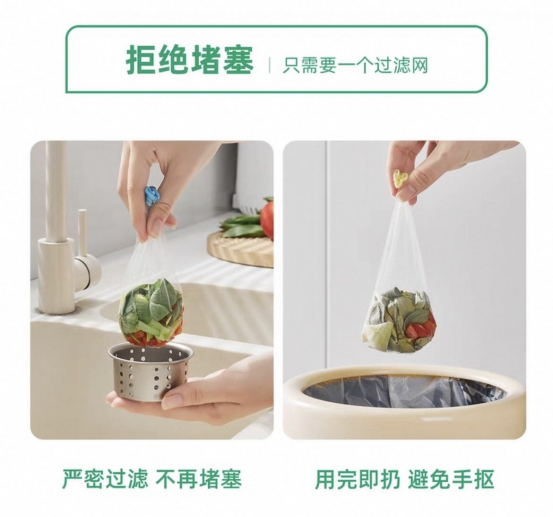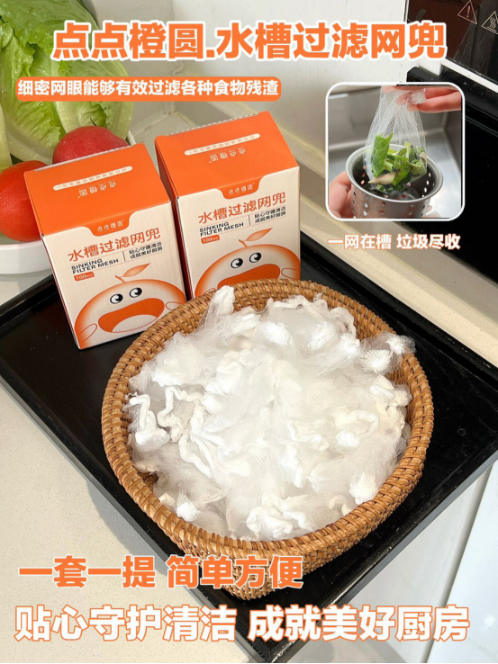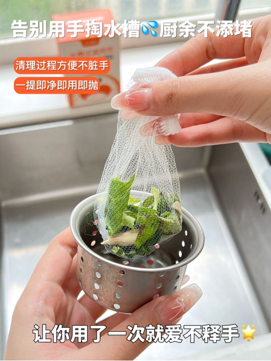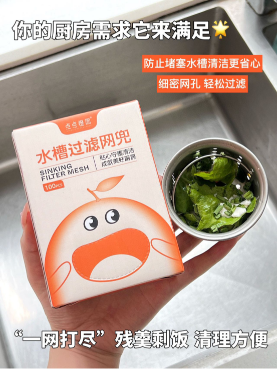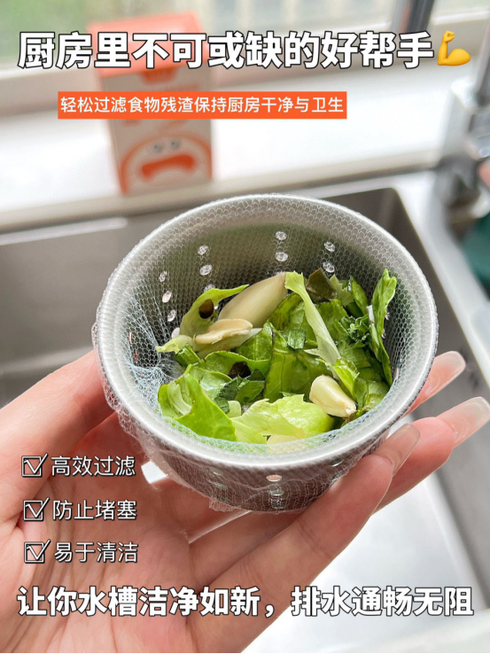 厨房清洁新助手 高效便捷 水槽过滤网兜,轻松过滤食物残渣 让厨房排水畅通无阻 在烹饪美食的同时 不再为清理水槽而烦恼 轻轻一拉,残渣尽除 让厨房更加整洁有序