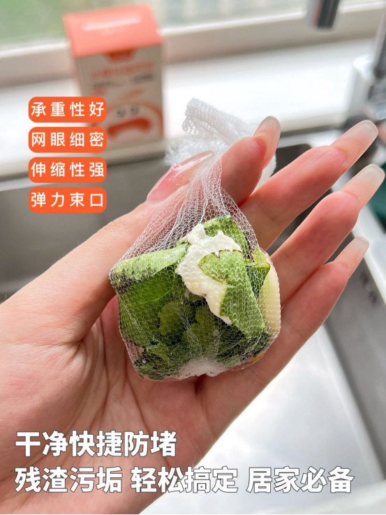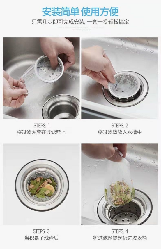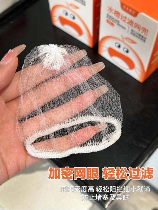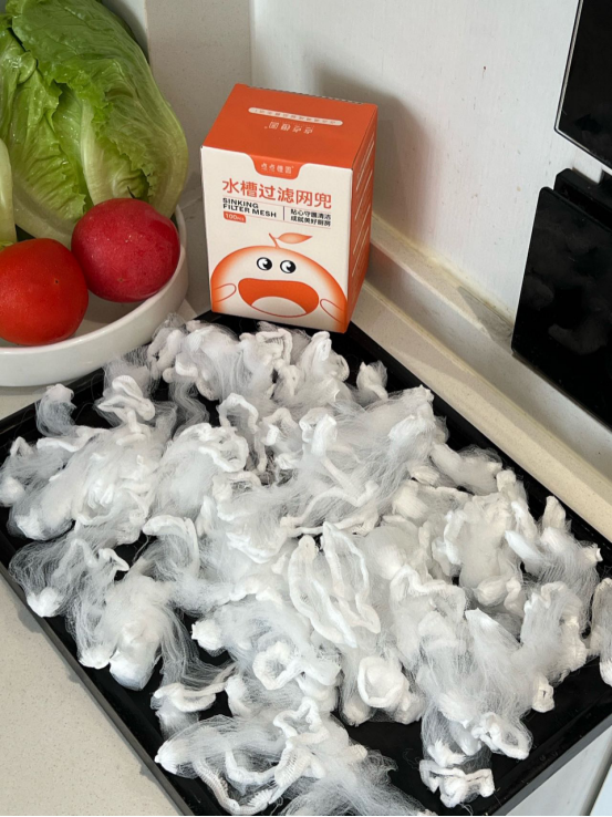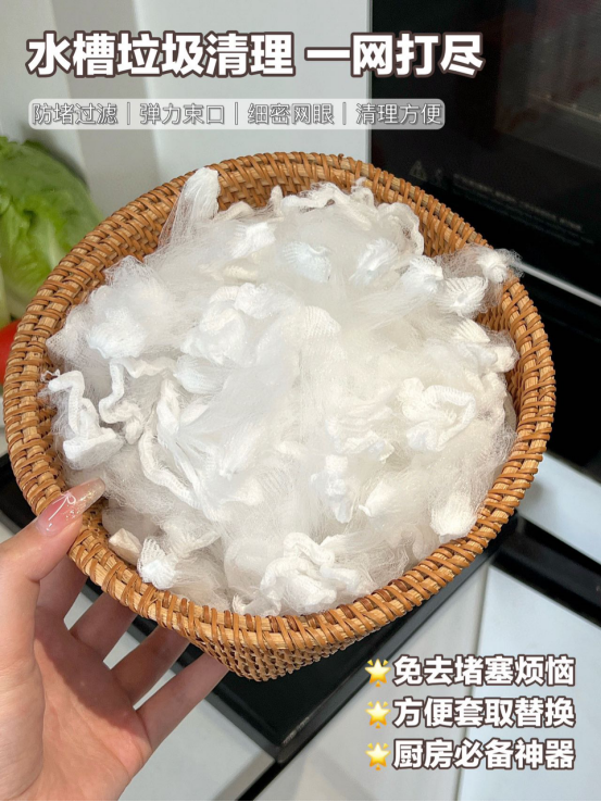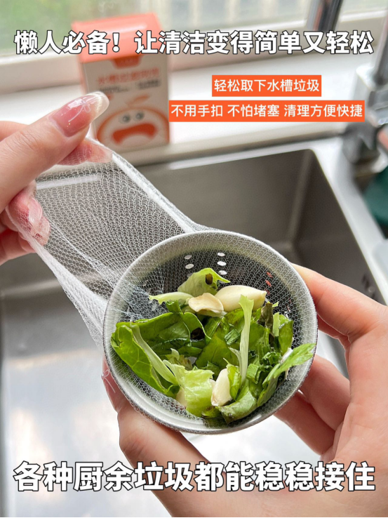 有了这个水槽过滤网兜,只要把它放在水槽的漏斗上, 就能拦截住食物残渣、茶叶、毛发等细小的垃圾。这样一来, 垃圾就不会流进下水道,也不会堵塞管道。 用过的过滤网只要轻轻一提一拉,就可以把垃圾提出来, 扔掉后再放回去,非常方便。而且,它的网眼很细密, 能有效过滤掉细小的垃圾,确保水槽干净整洁。