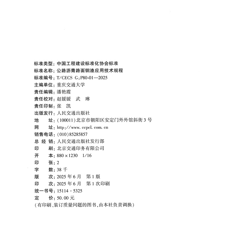 书名:公路沥青路面钢渣应用技术规程(T/CECS G:P80-01—2025)