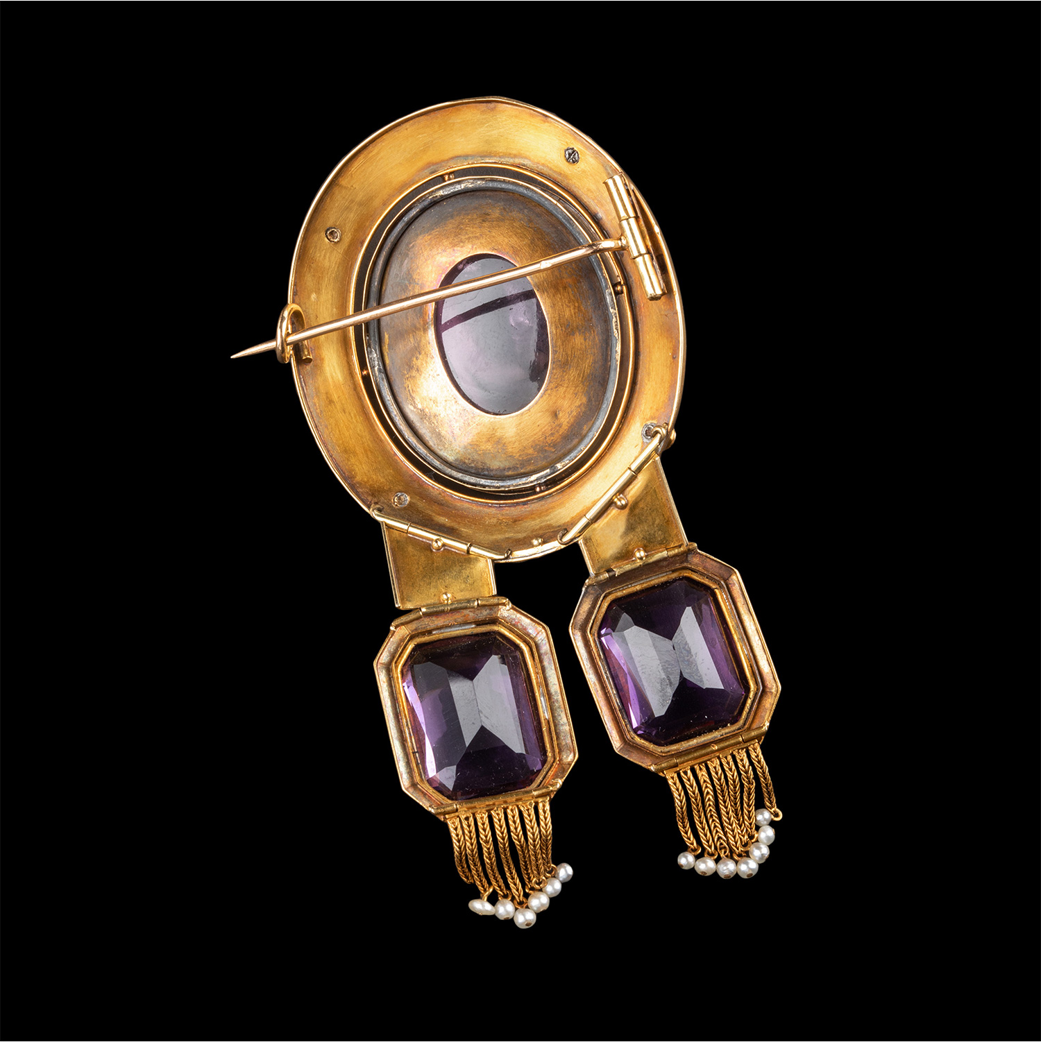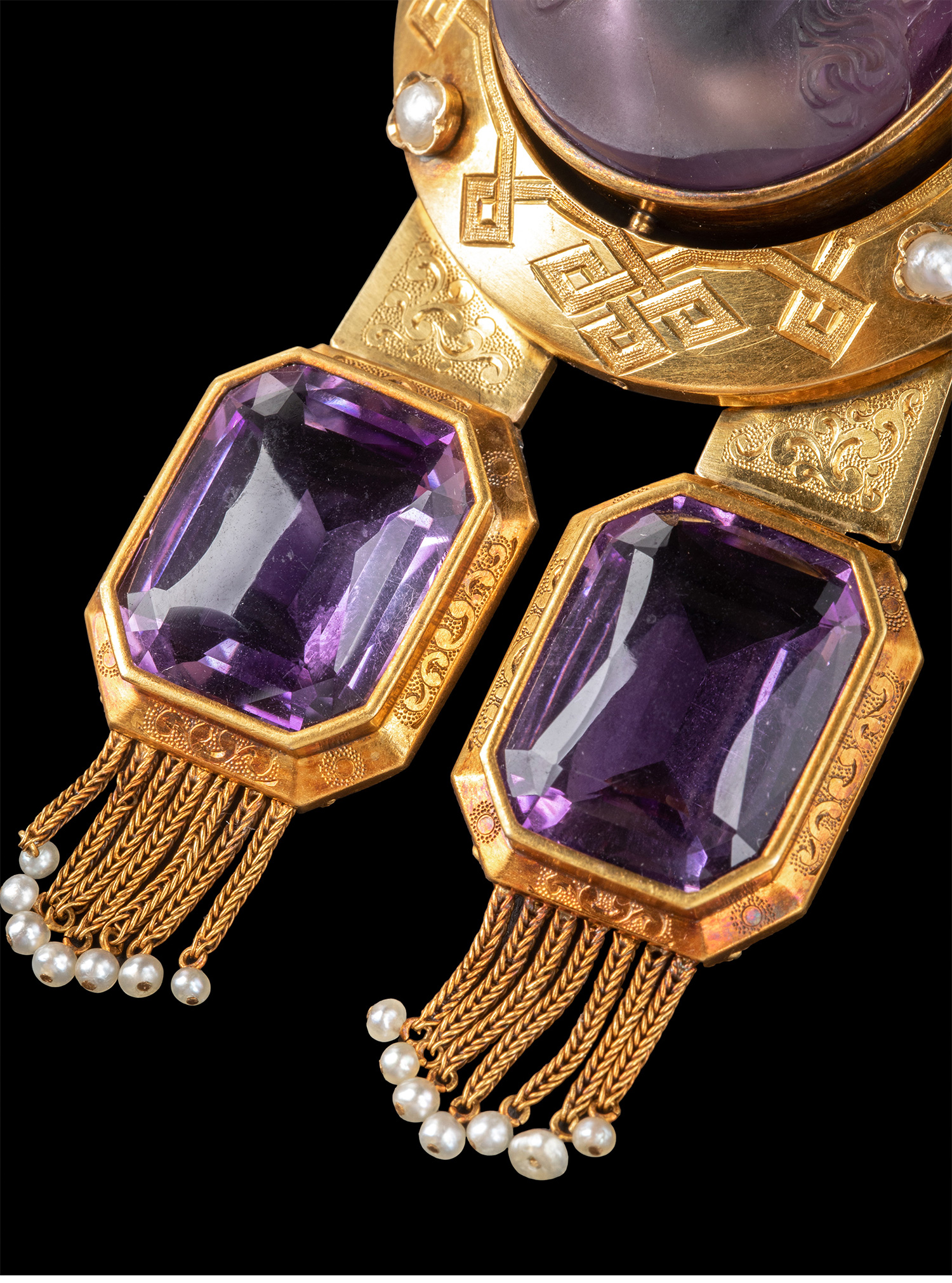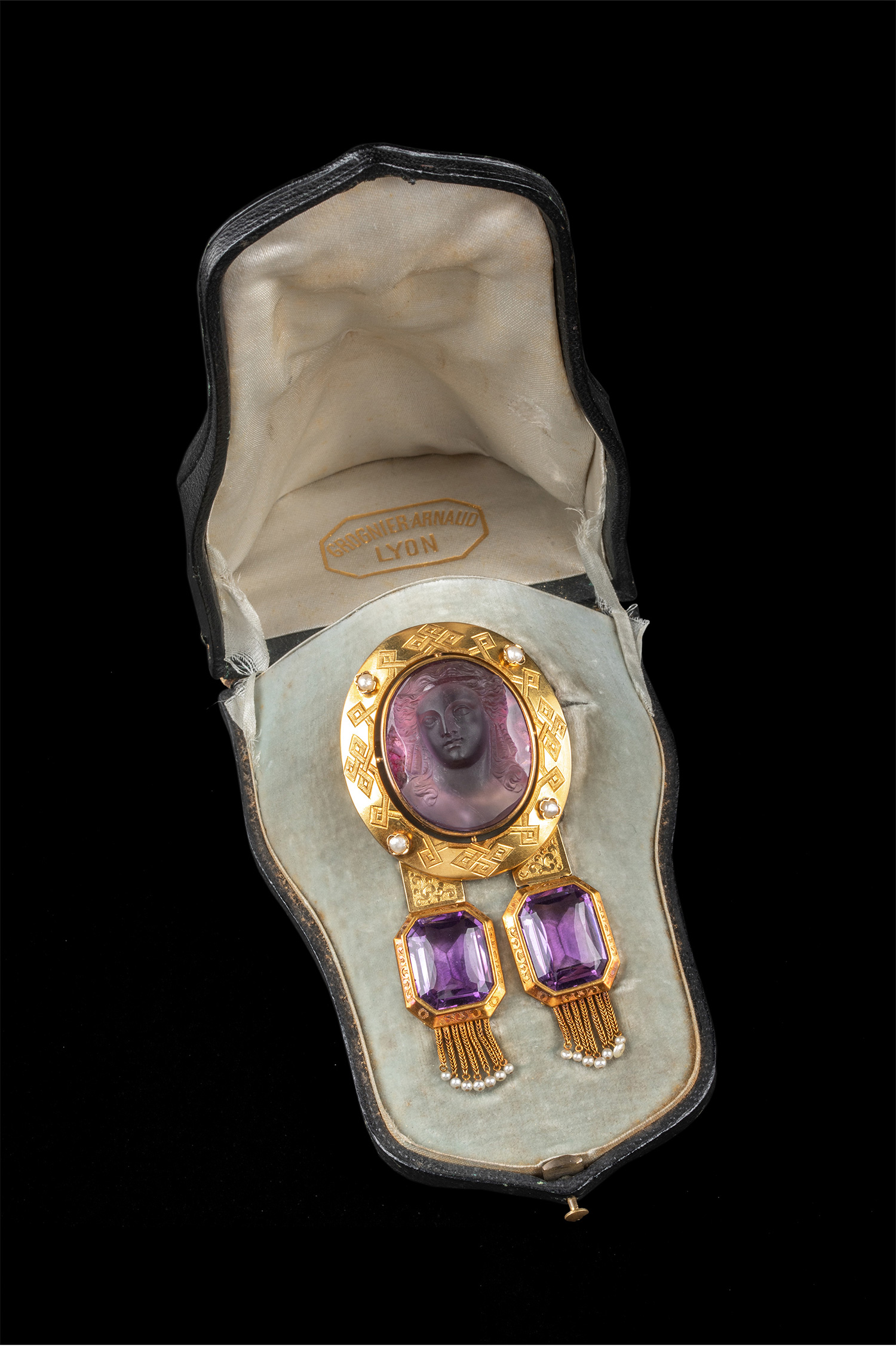 19世纪法国拿破仑三世时期出品18K黄金镶嵌紫水晶卡梅奥浮雕珍珠流苏装饰胸针 带原盒