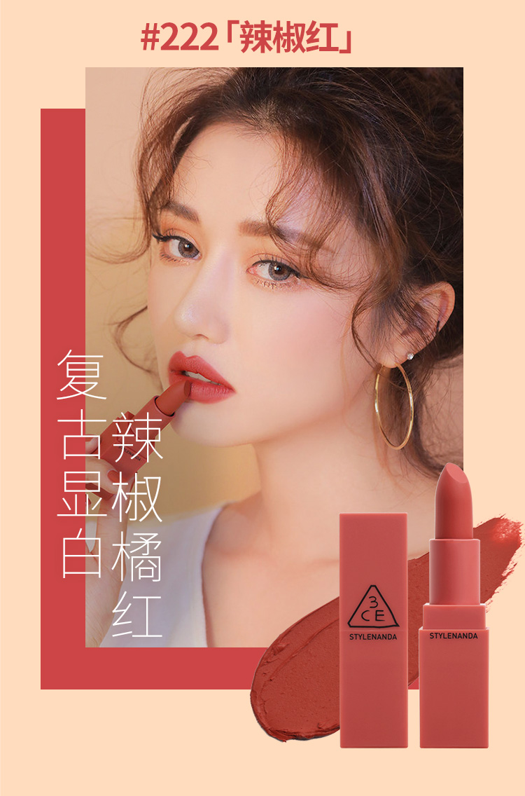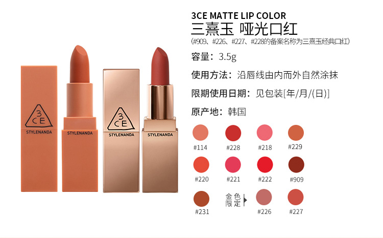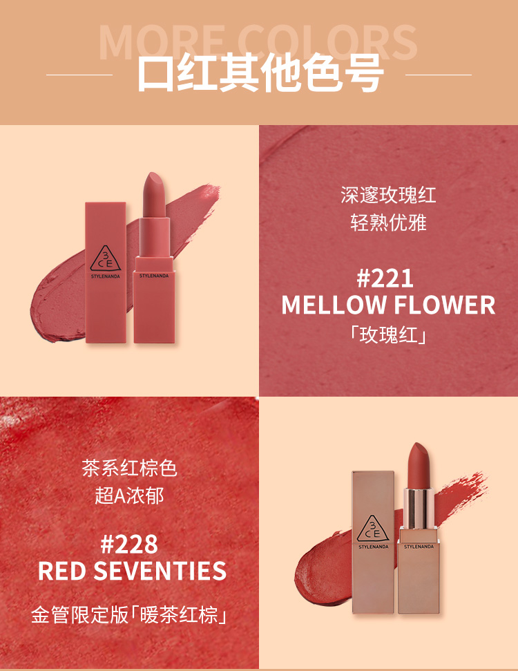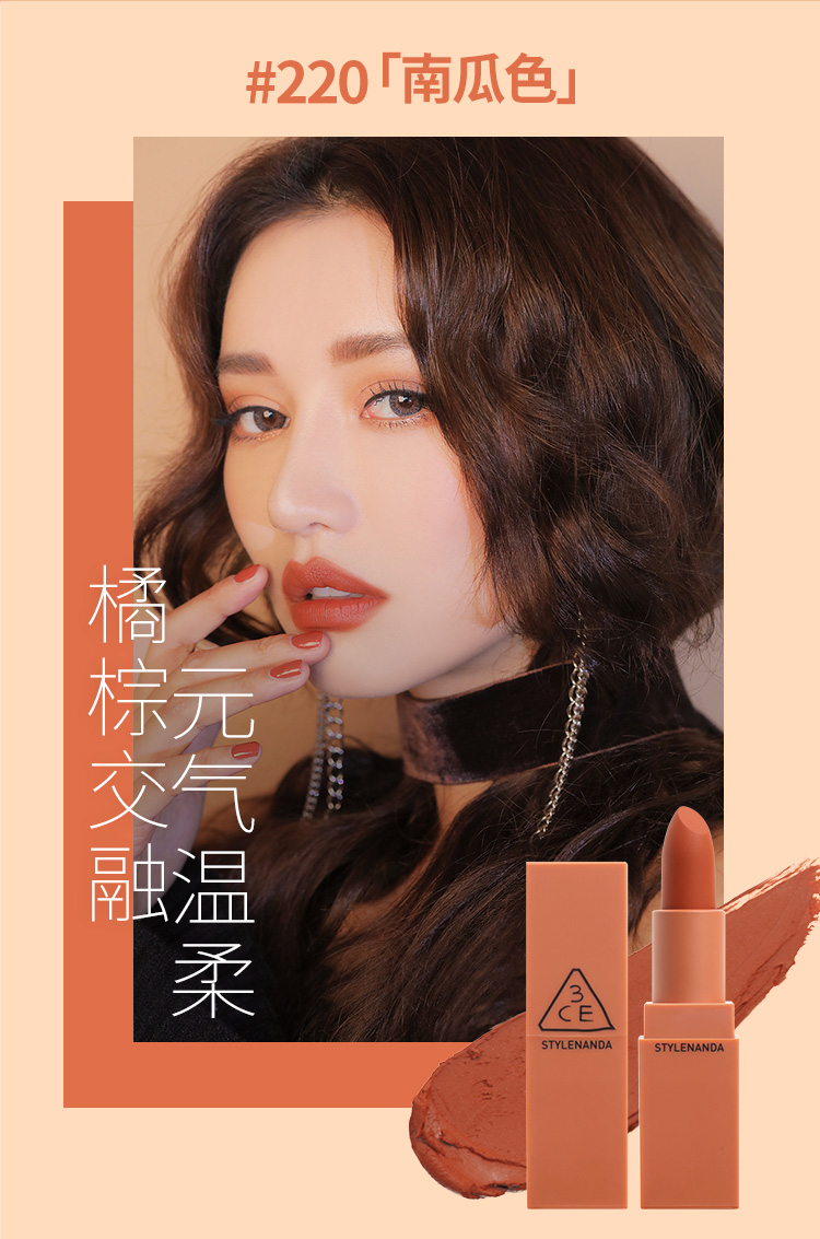 【中欧班列精选】韩国3CE方管丝绒雾面哑光口红唇膏3.5g /支 220#221#115#116#909#