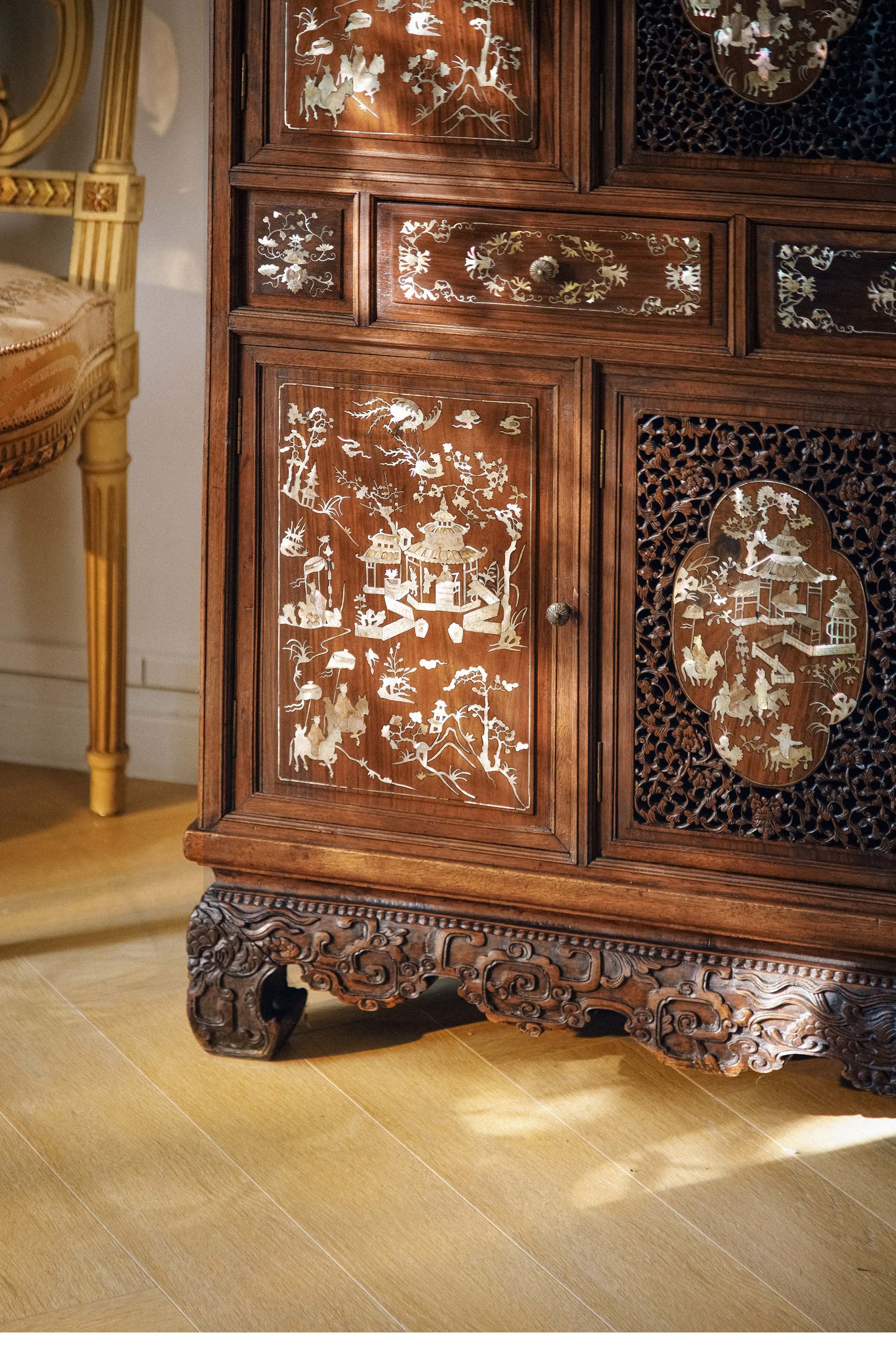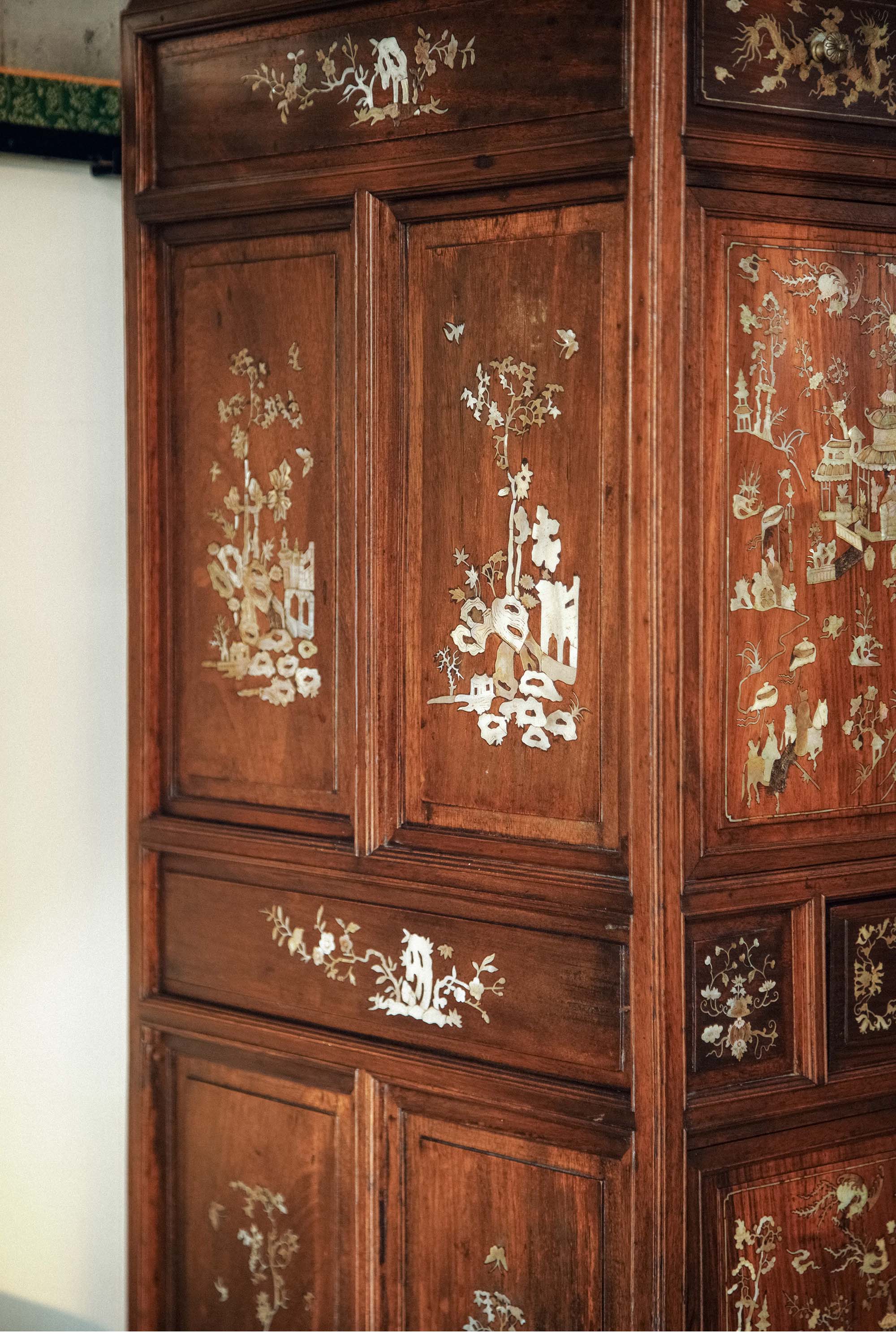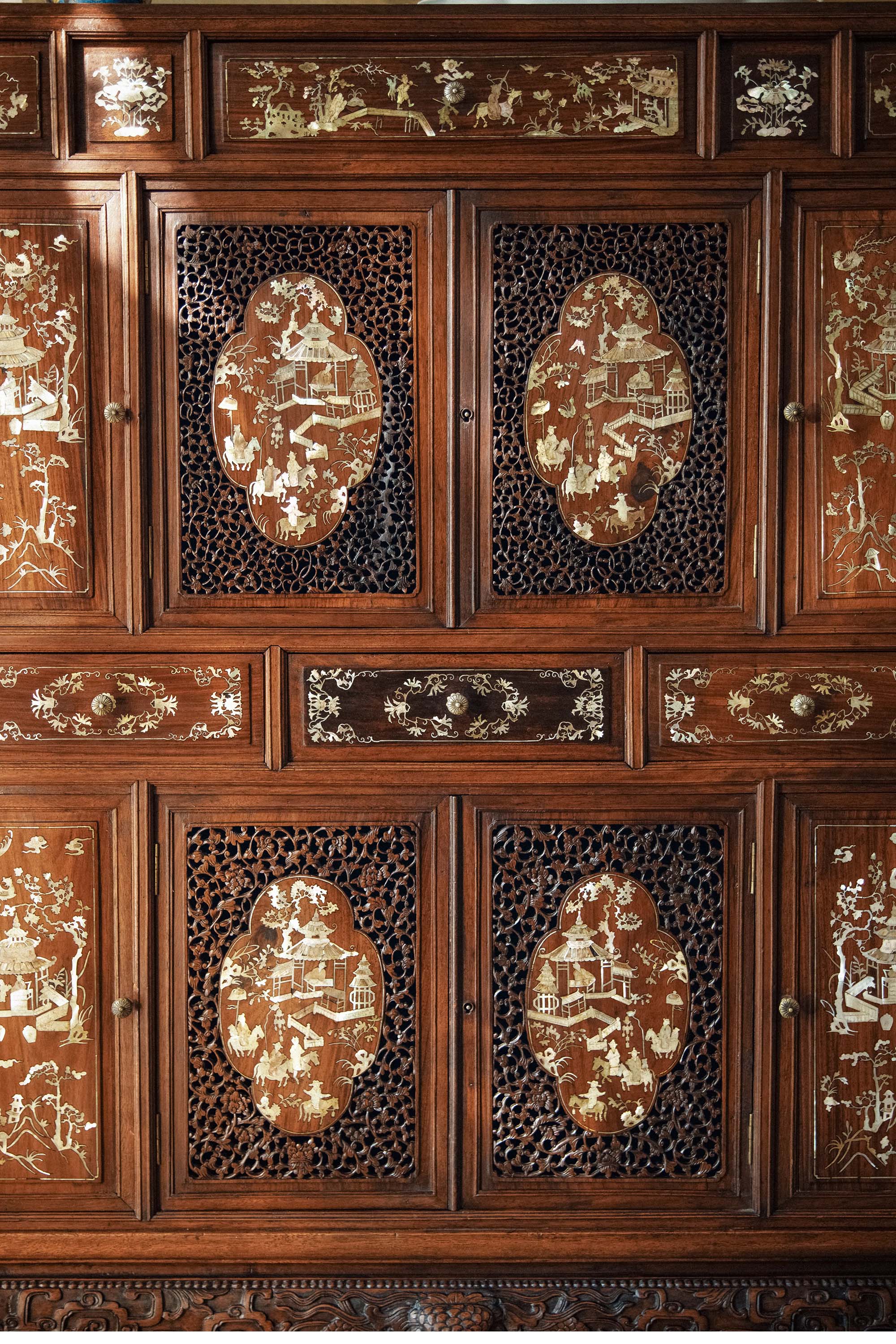 19世纪末亚洲出品传统亭台人物主题螺钿镶嵌边柜