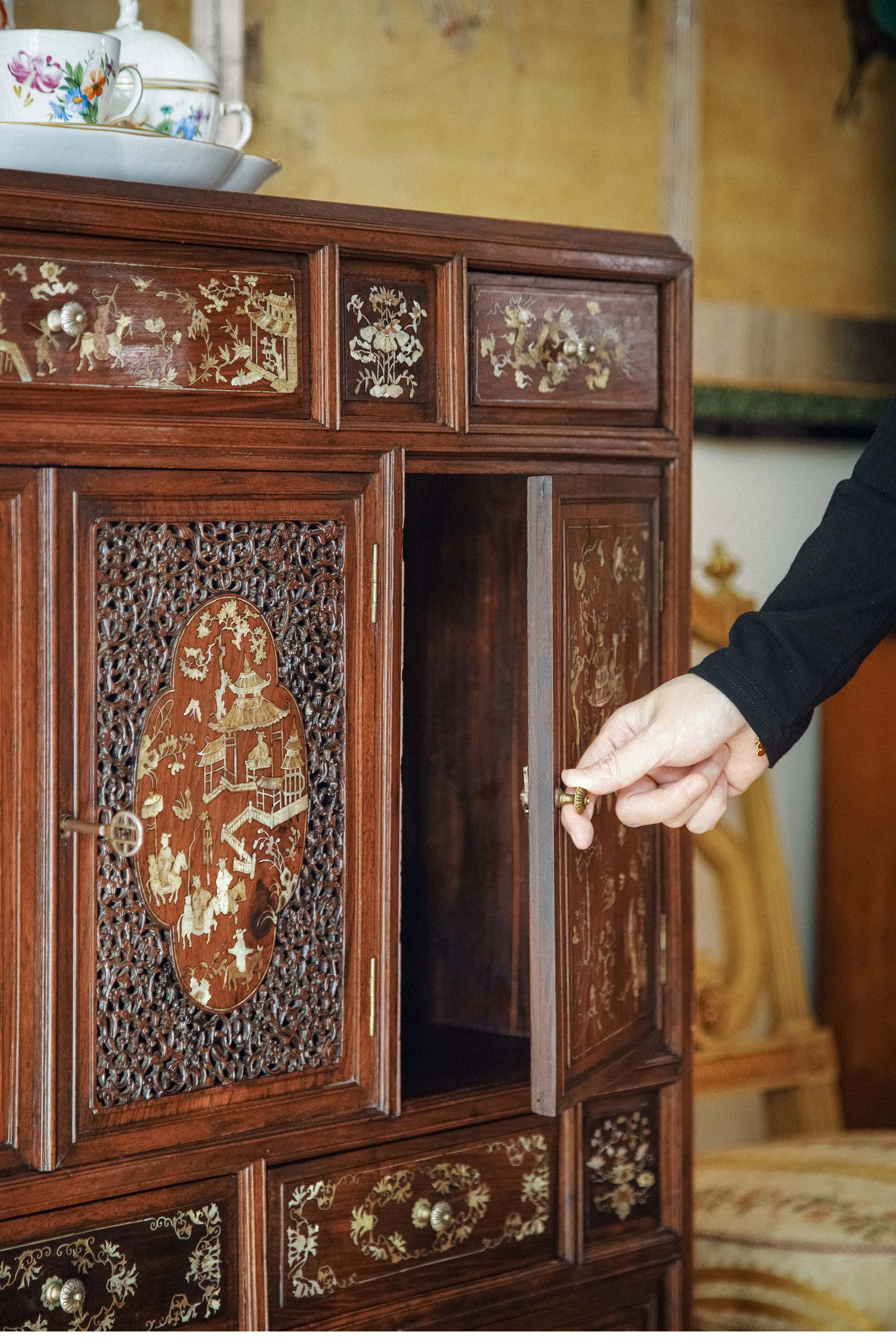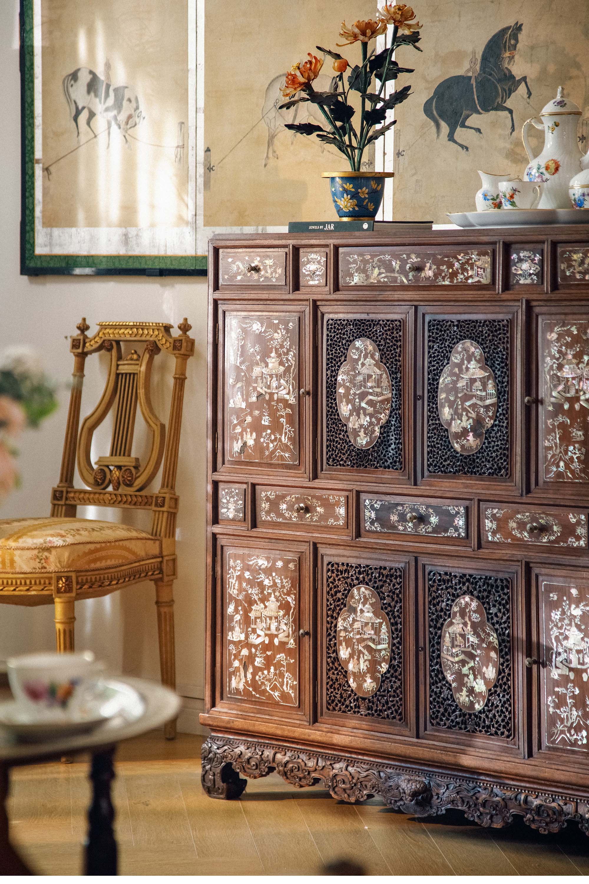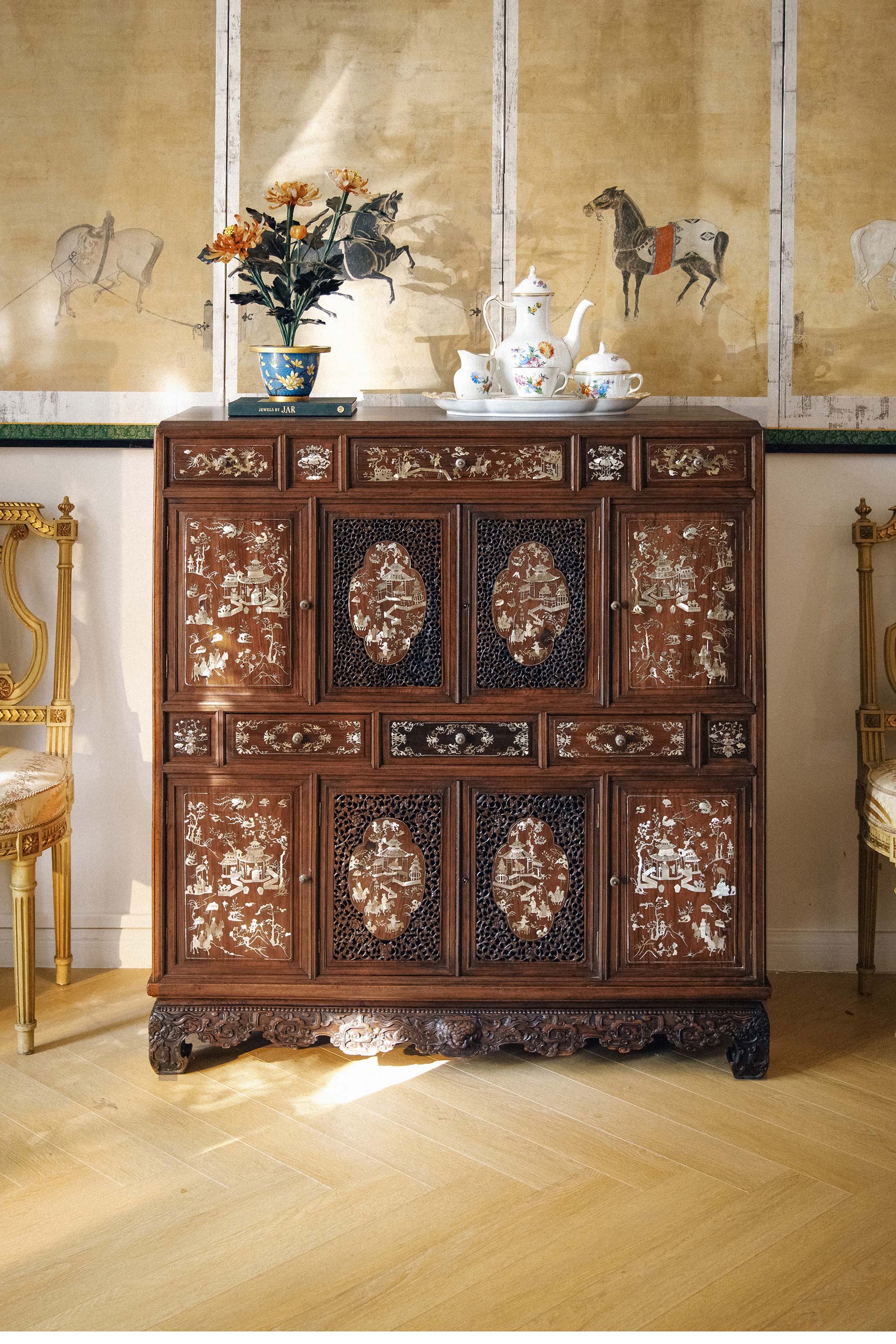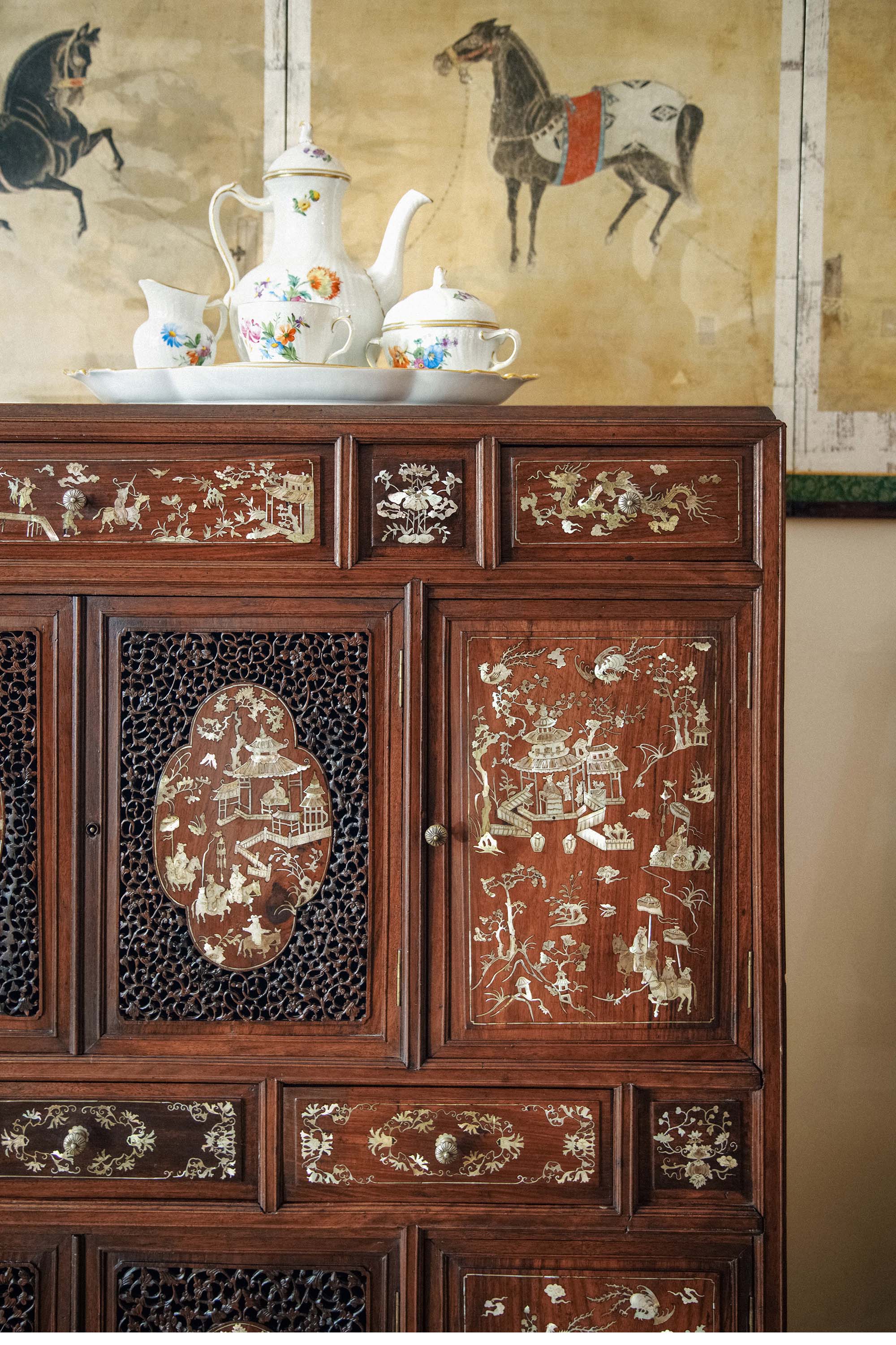 19世纪末亚洲出品传统亭台人物主题螺钿镶嵌边柜