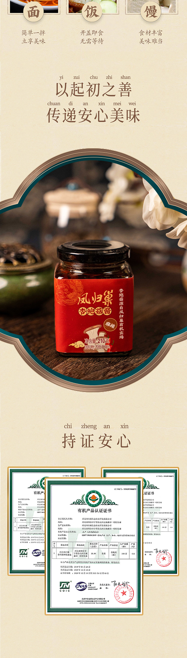甄选凤归巢优质有机杏鲍菇为杏鲍菇酱的原料,专业厨师团队千百次研制调味,秘制配方精心制作而成,味道鲜美独特。保持蘑菇营养成分,锁住鲜香,锁住营养。有机杏鲍菇不添加防腐剂、催生素等化学添加剂。