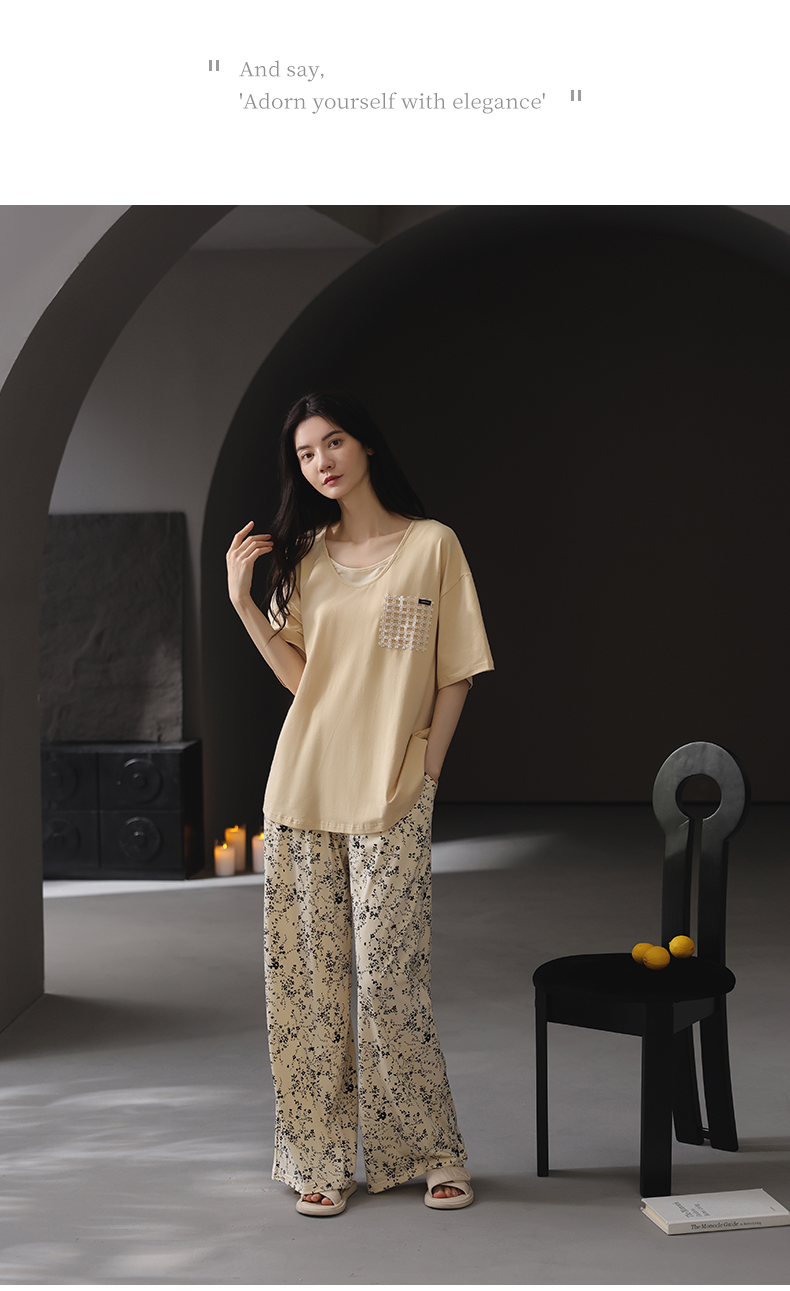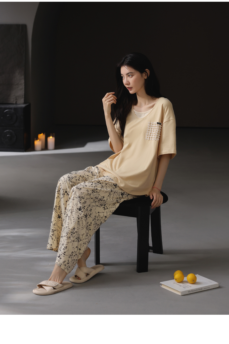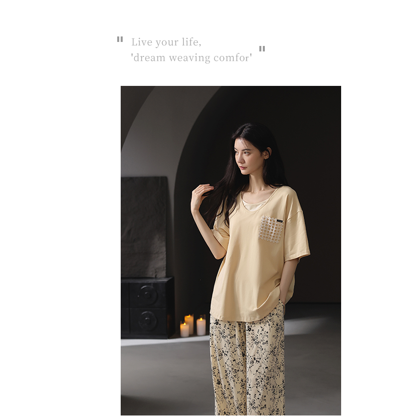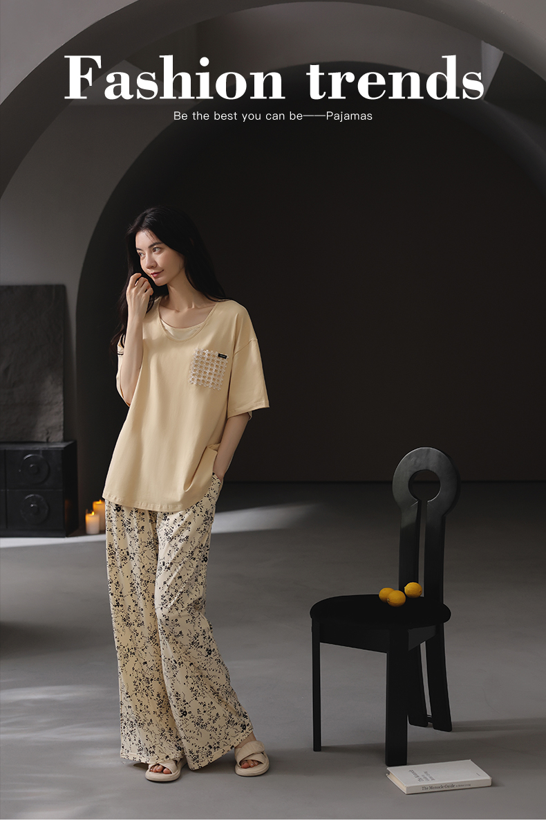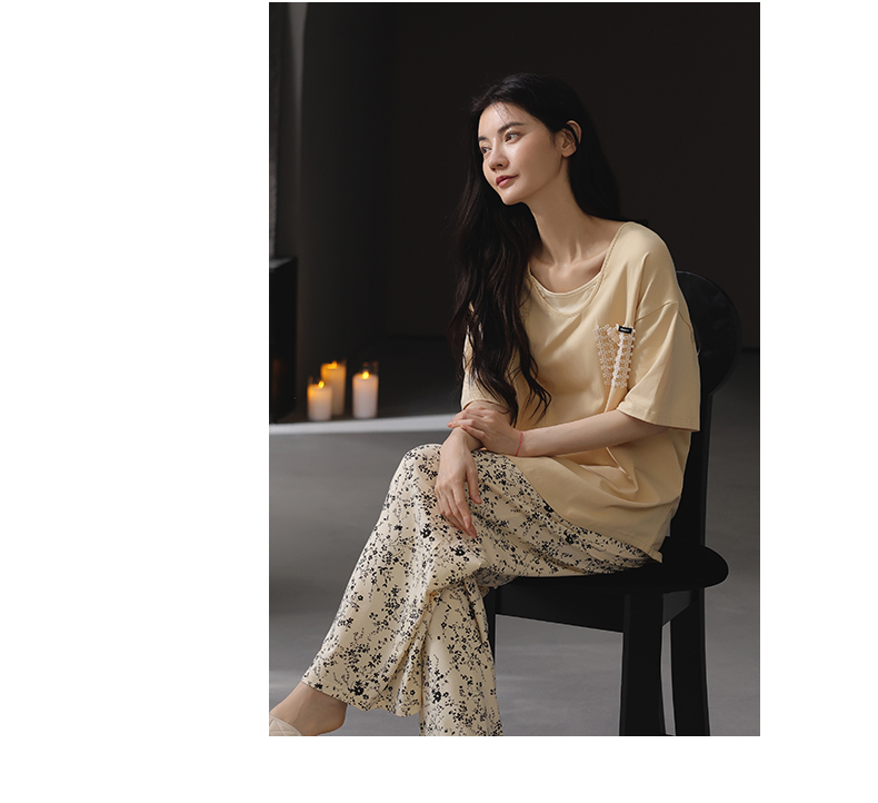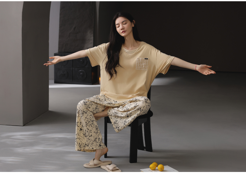 可人儿带胸垫睡衣夏季凉感莫代尔女士家居服短袖长裤套装可外穿