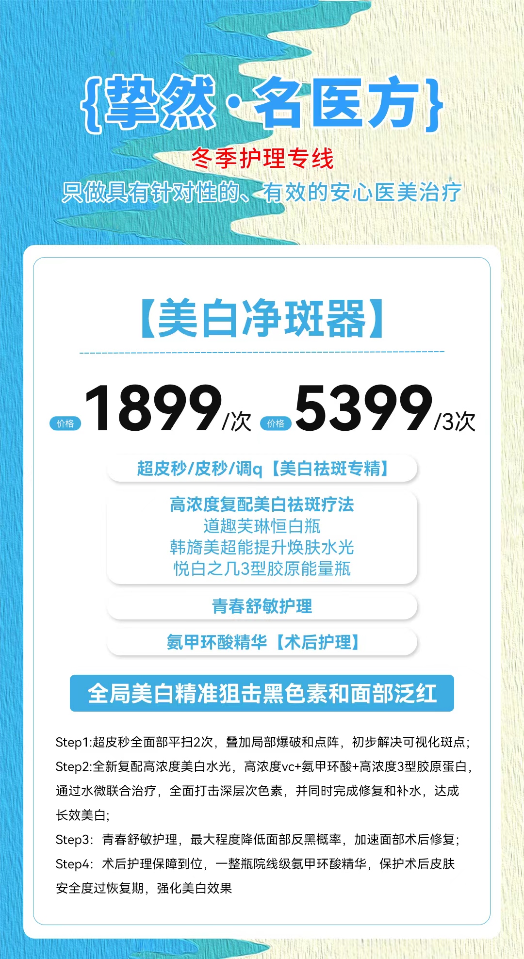 Step2: 全新复配高浓度美白水光,高浓度vc+氨甲环酸+高浓度3型胶原蛋白,通过水微联合治疗,全面打击深层次色素,并同时完成修复和补水,达成长效美白;