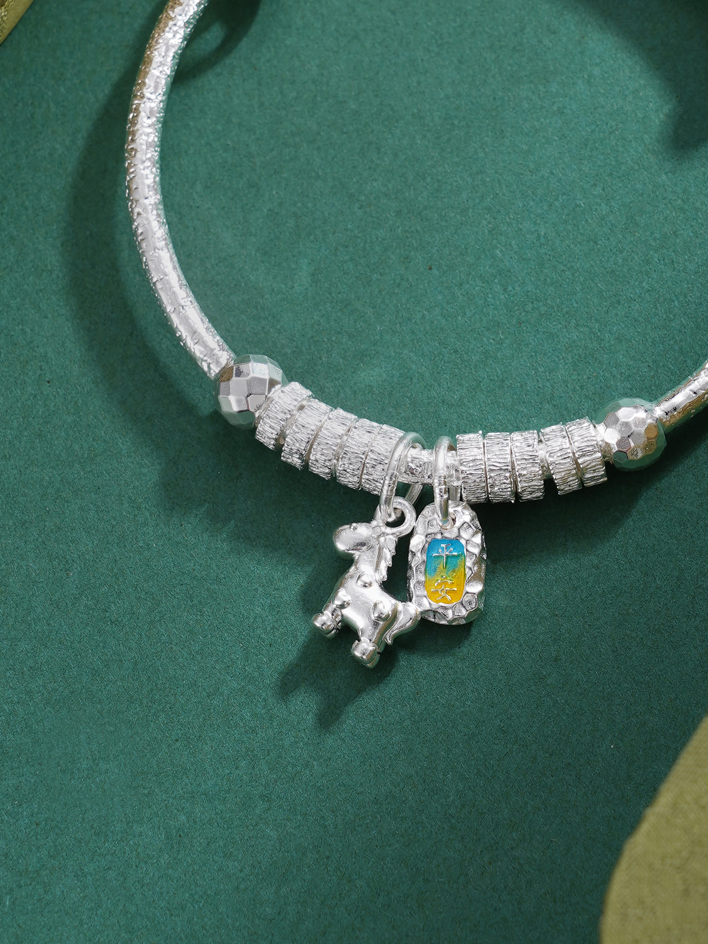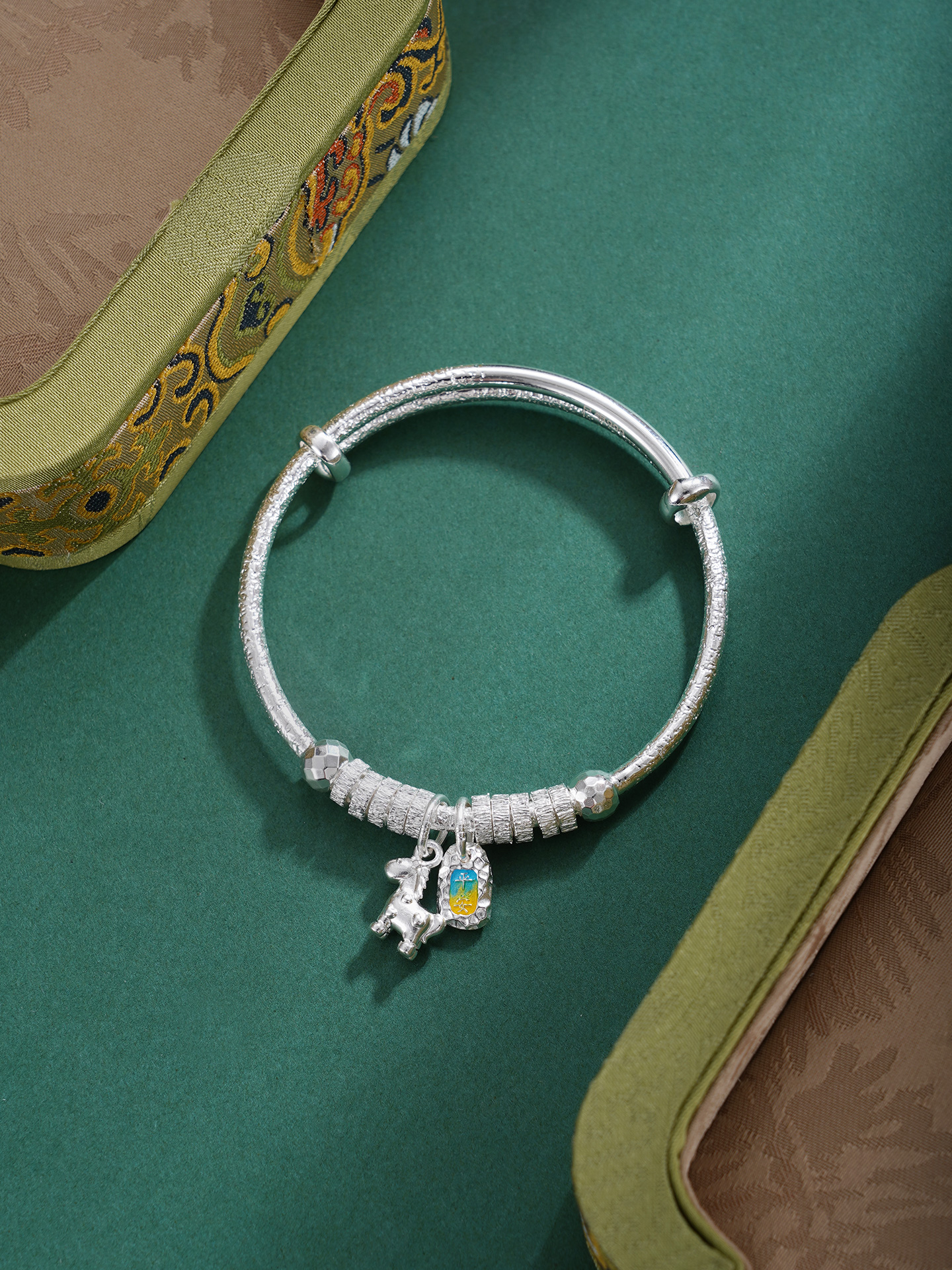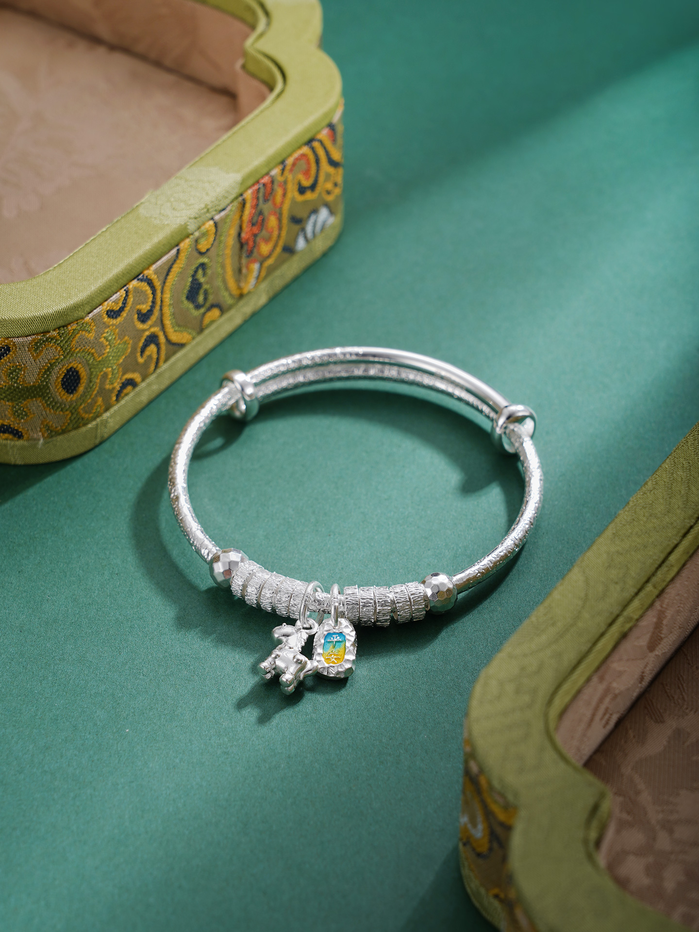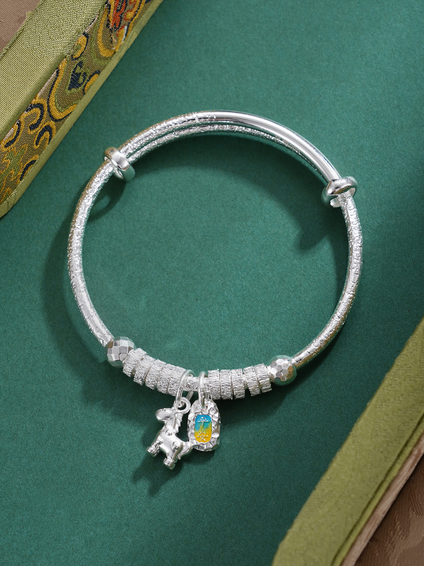 【寓意】:手镯纯银材质,推拉设计,点缀小马与平安坠饰,辅以珐琅彩点染,象征着护佑周全,一生平安顺遂。