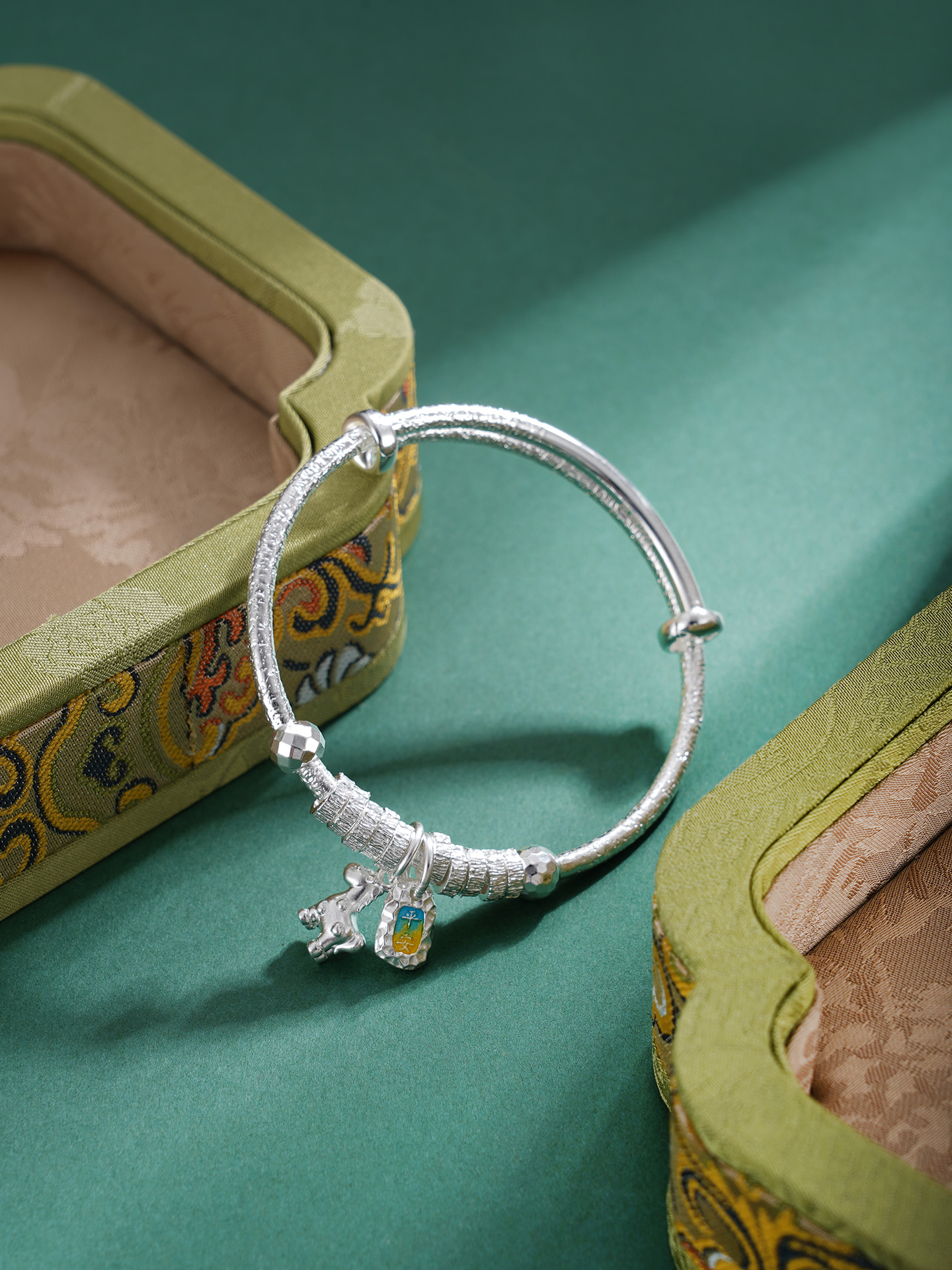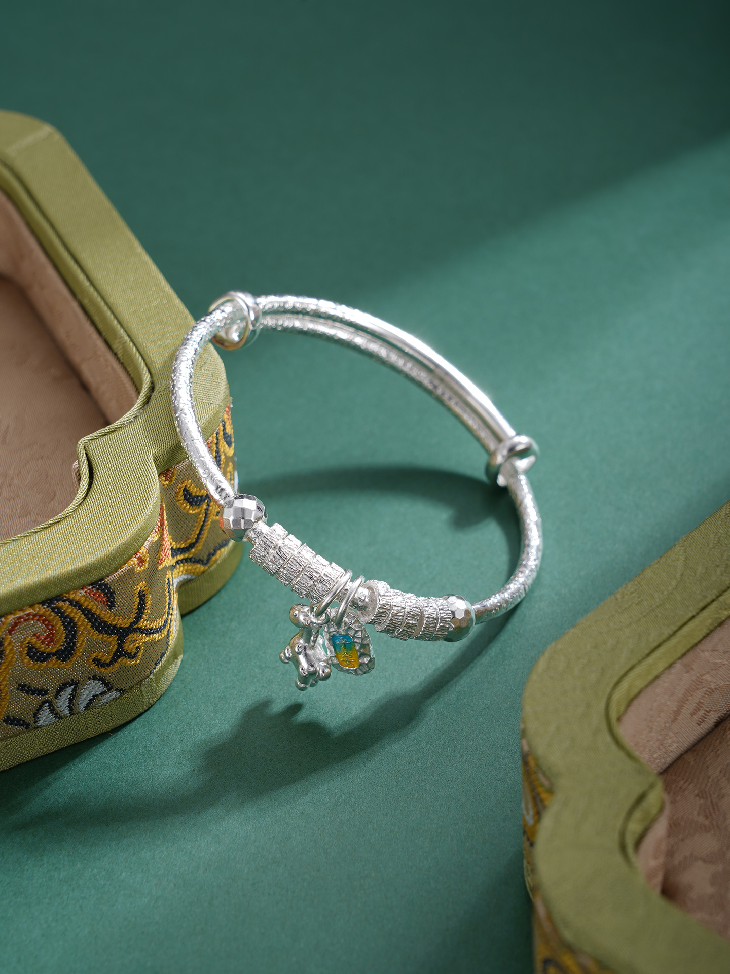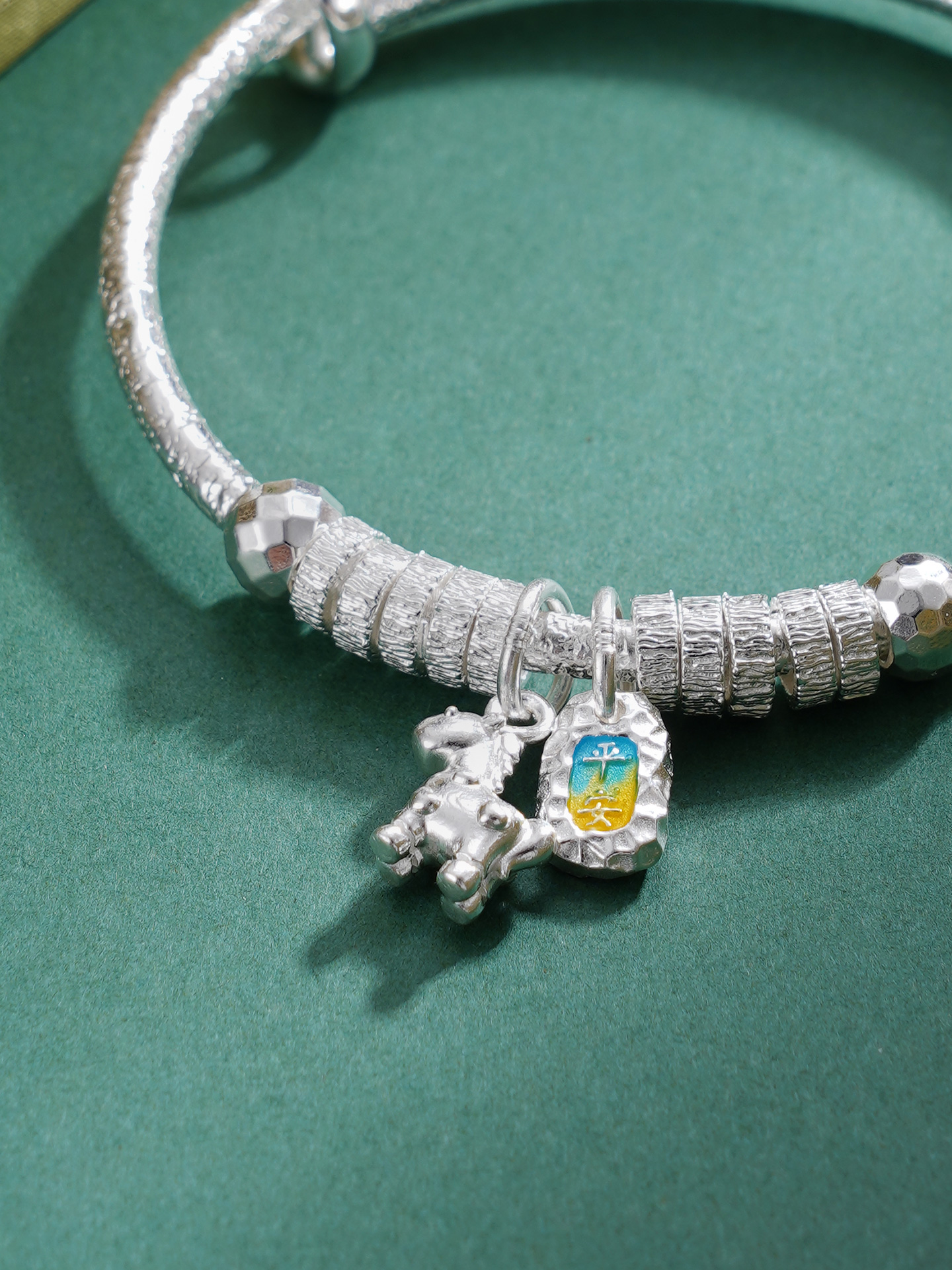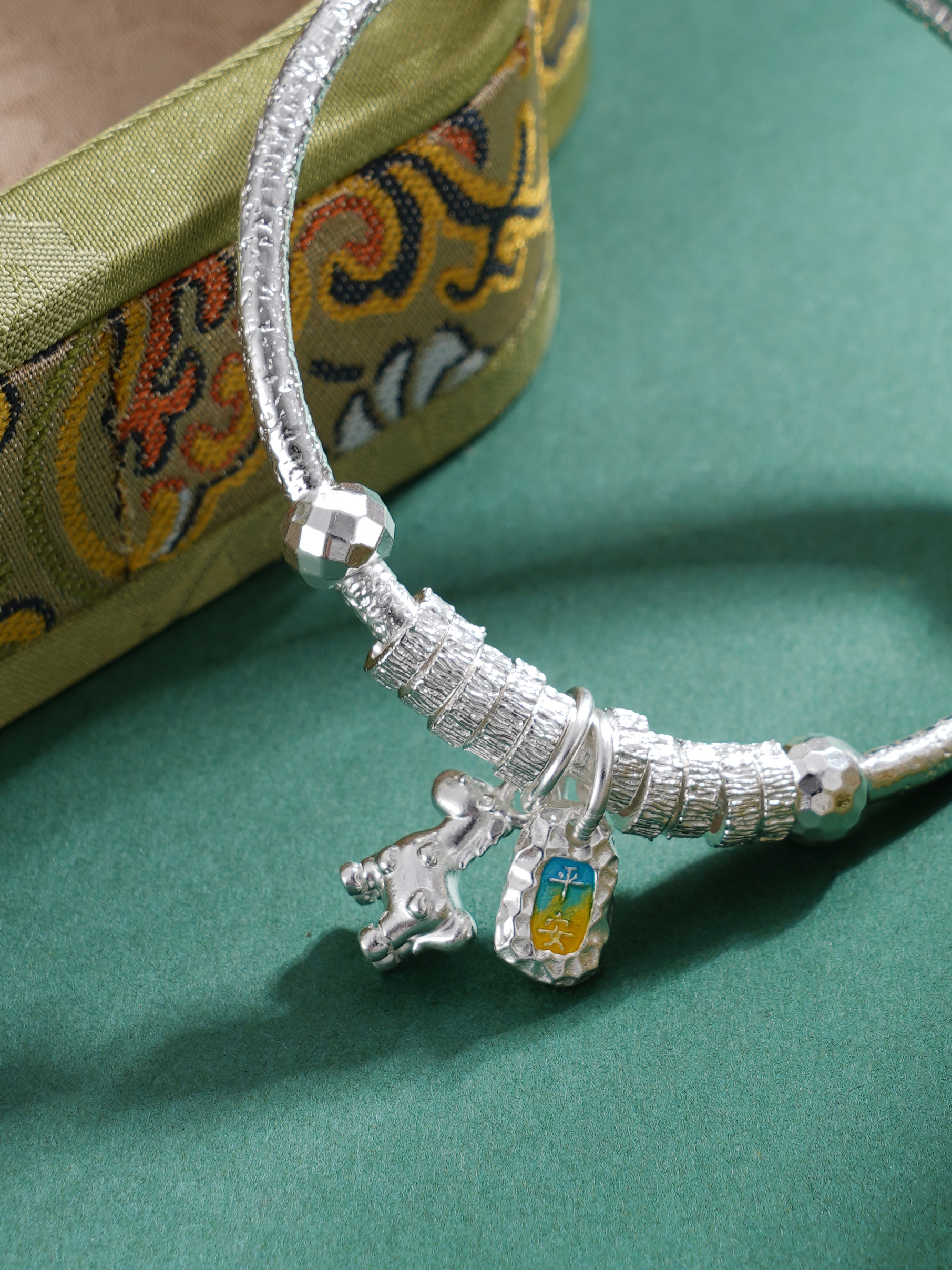 【寓意】:手镯纯银材质,推拉设计,点缀小马与平安坠饰,辅以珐琅彩点染,象征着护佑周全,一生平安顺遂。