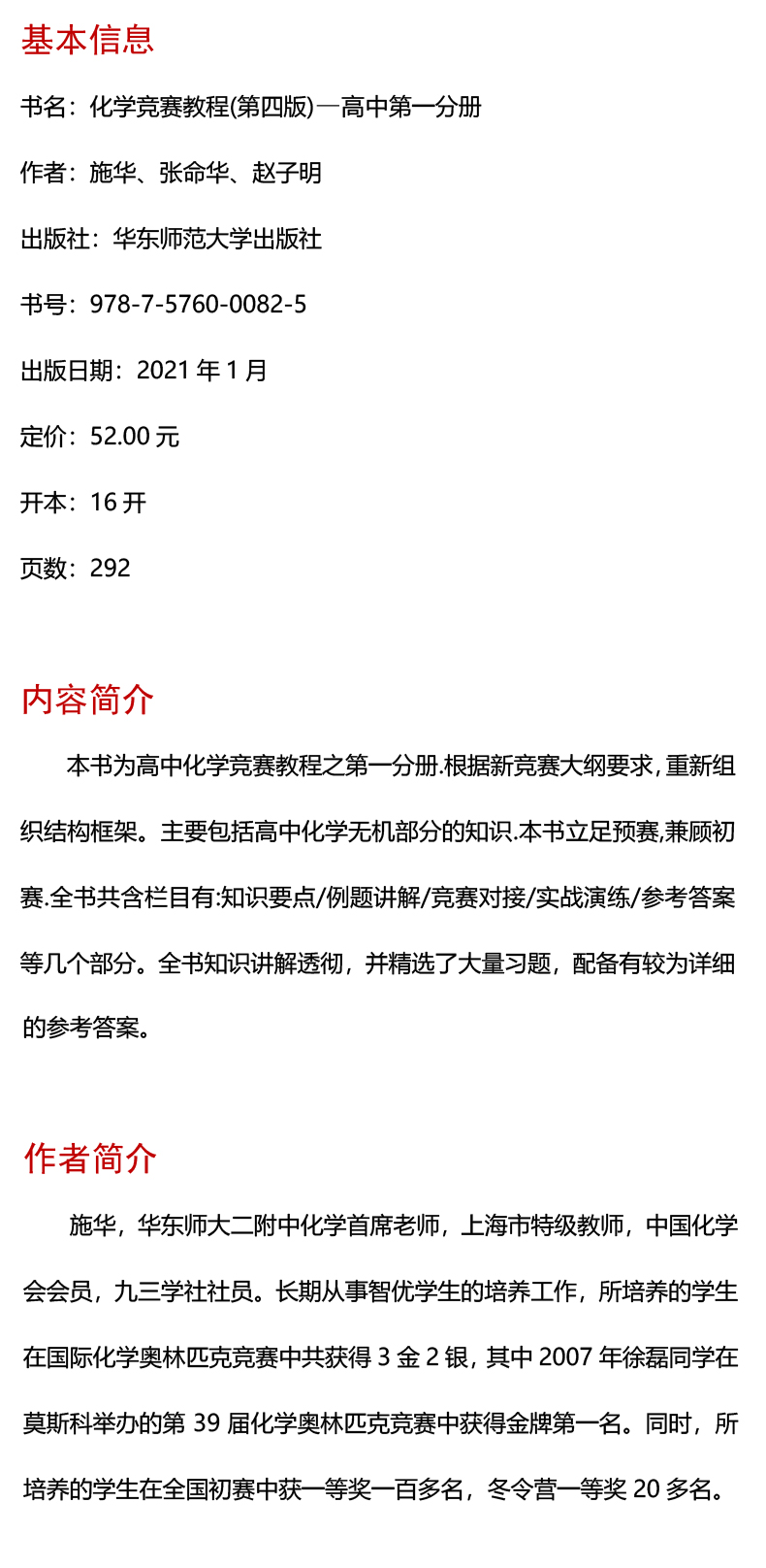 本书为《化学竞赛教程》之——高中第一分册。根据近期新化学竞赛大纲要求,组织知识结构框架。本书立足全国高中化学竞赛。全书共含栏目有:知识要点、例题讲解、竞赛对接、实战演练、参考答案等几个部分。全书知识讲解透彻,并精选了大量习题,配备有较为详细的参考答案。同时,第四版增配了《化学竞赛能力测试》,方便学生在学完竞赛教程的基础上进行自我测评。《化学竞赛能力测试》配详细解答,利于学生自我学习与提升。