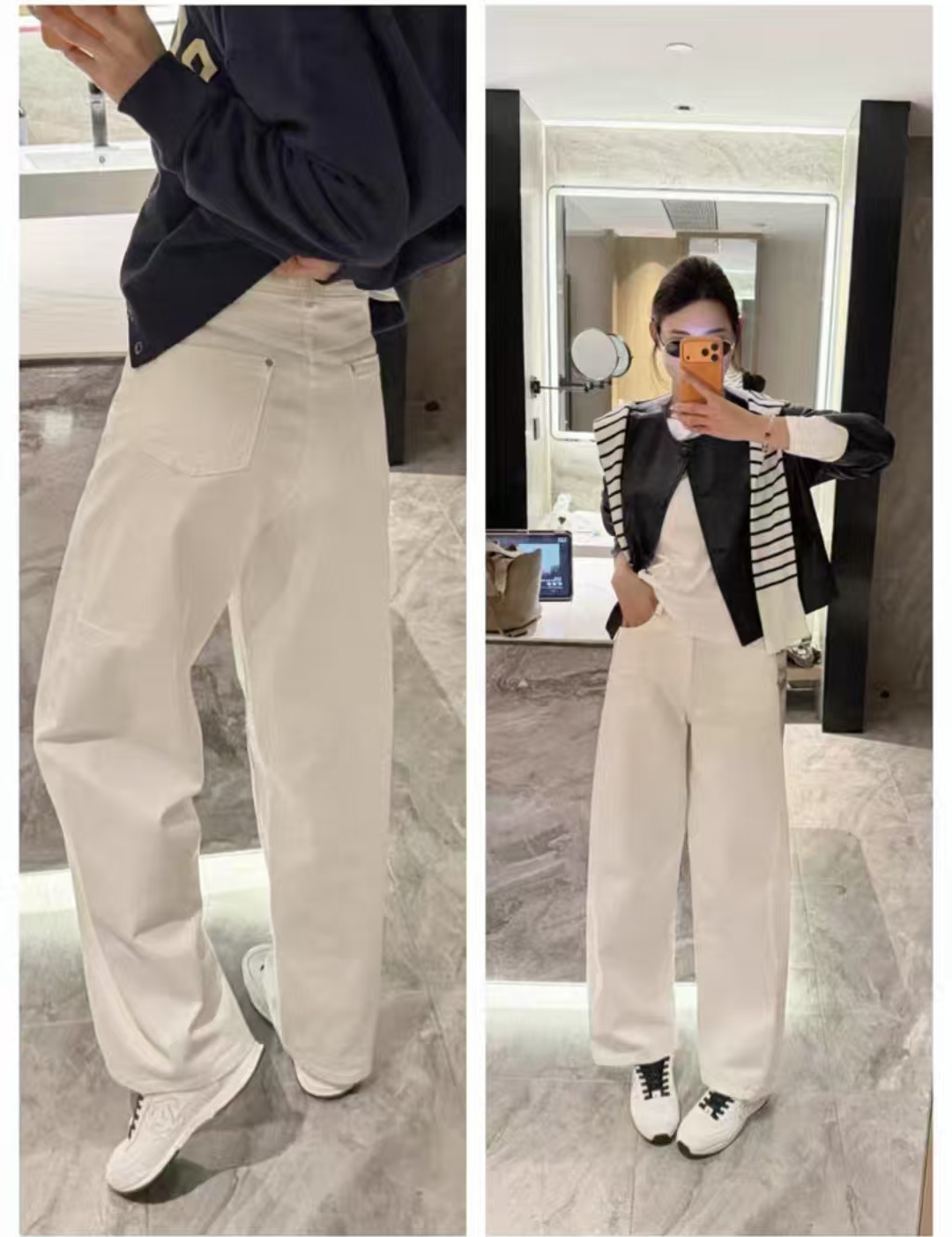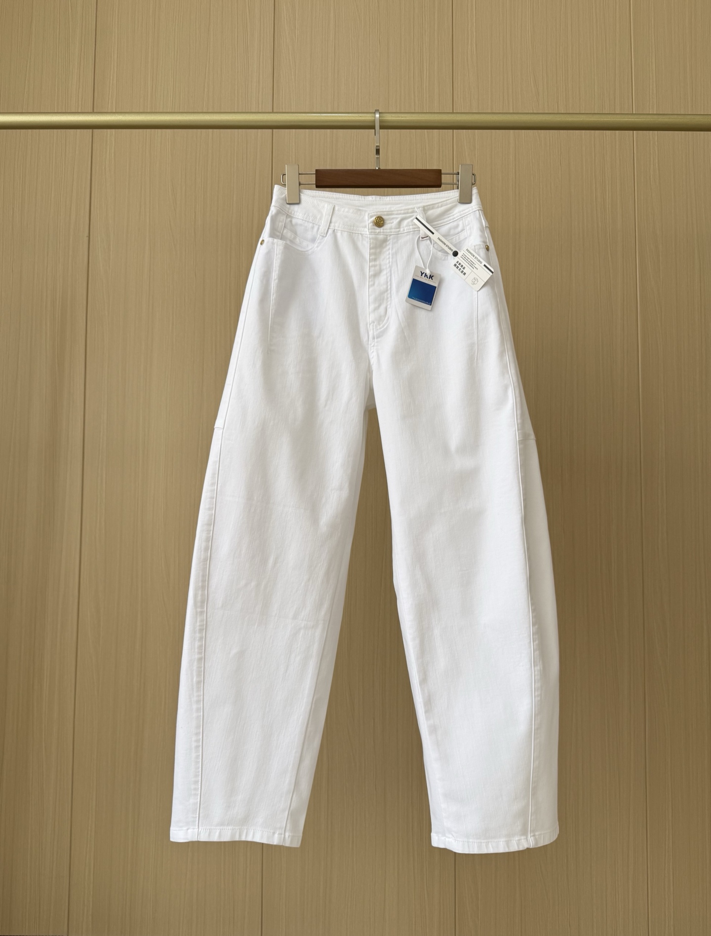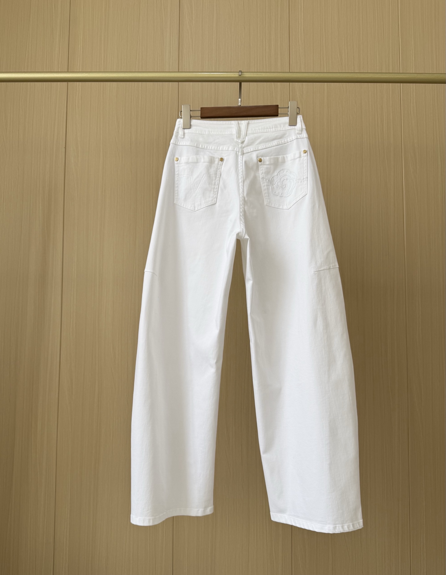 大腿中部放宽,脚踝微收的镰刀廓形,修饰腿型更利落。哑光金牡丹工字扣+高密双车线,简洁干练。