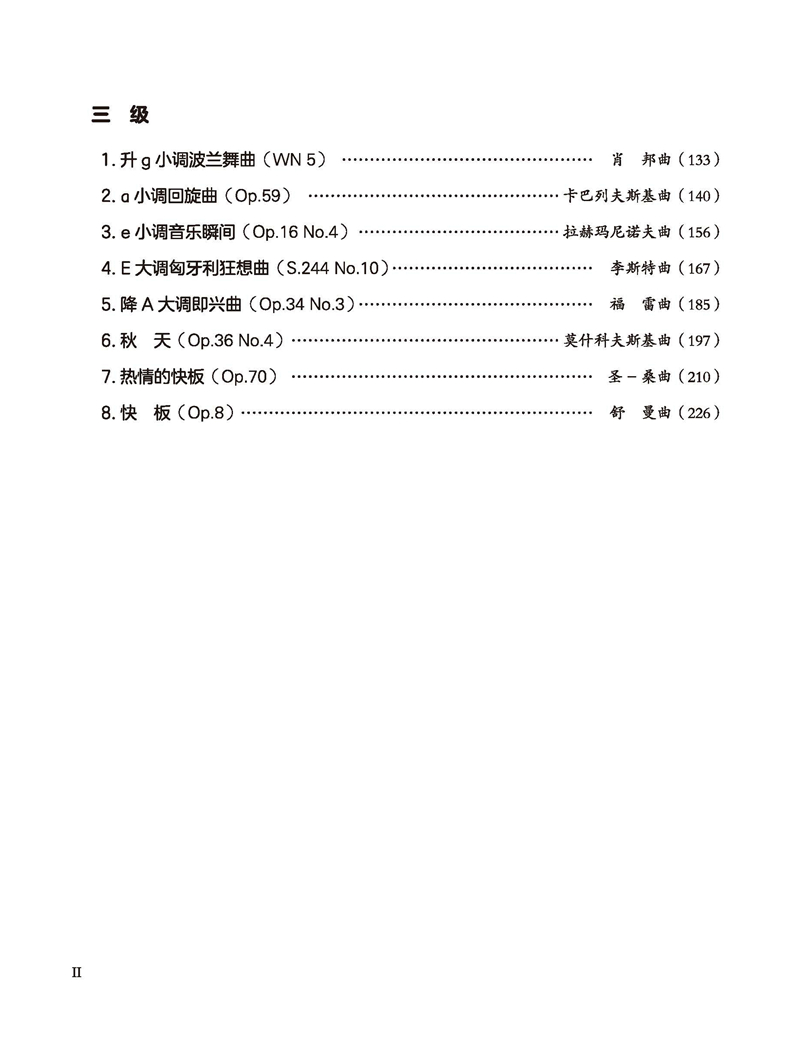 本套钢琴教材由上海音乐学院音教系组织编写,共三册,分别为练习曲卷、乐曲卷、奏鸣曲卷。各卷又按难易程度,分为三个部分,作品选用从巴洛克时期至二十世纪的经典钢琴作品,作曲家包括海顿、莫扎特、贝多芬、舒伯特、门德尔松、肖邦、福雷、拉赫玛尼诺夫等。本书由浅入深、循序渐进,适合中高级别的学生,有很高的练习价值。每首作品的曲末,均加上了作品介绍和结构分析,供学习者演奏参考。此外,这套教材还可作为考级的辅助用书。