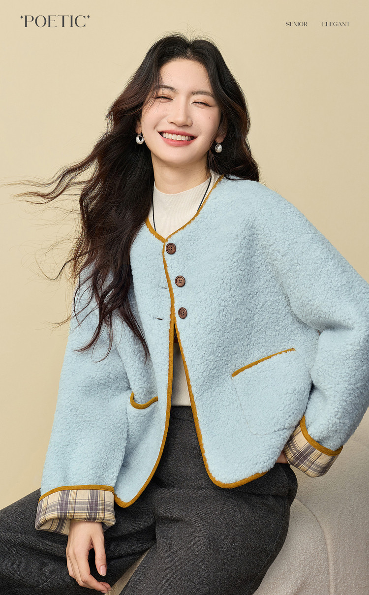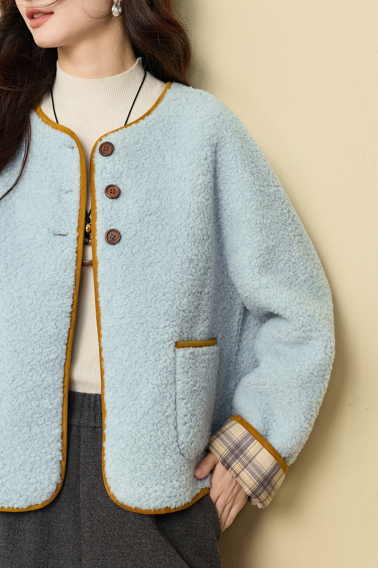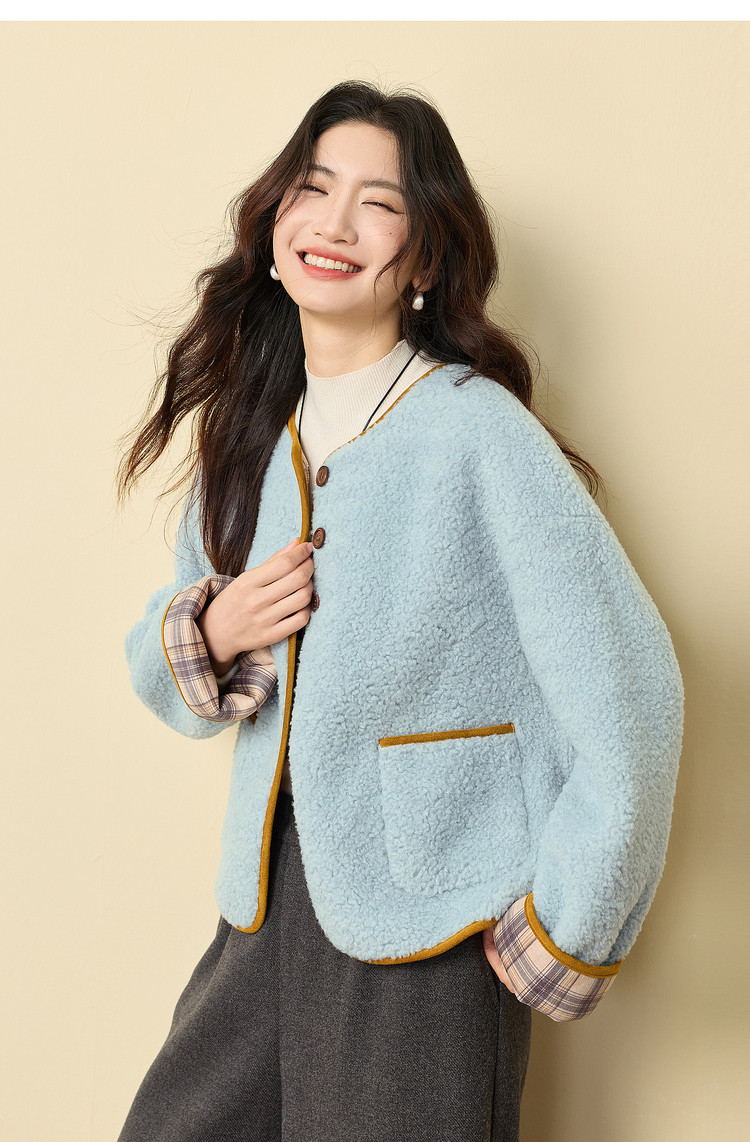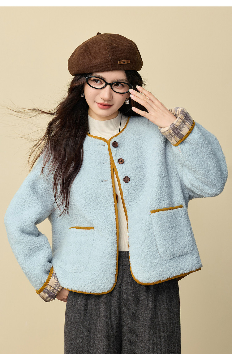 【12/24新品6.5折】熙世界小香风毛绒短外套女秋冬仿皮草小众不撞款蓝色皮毛一体上衣