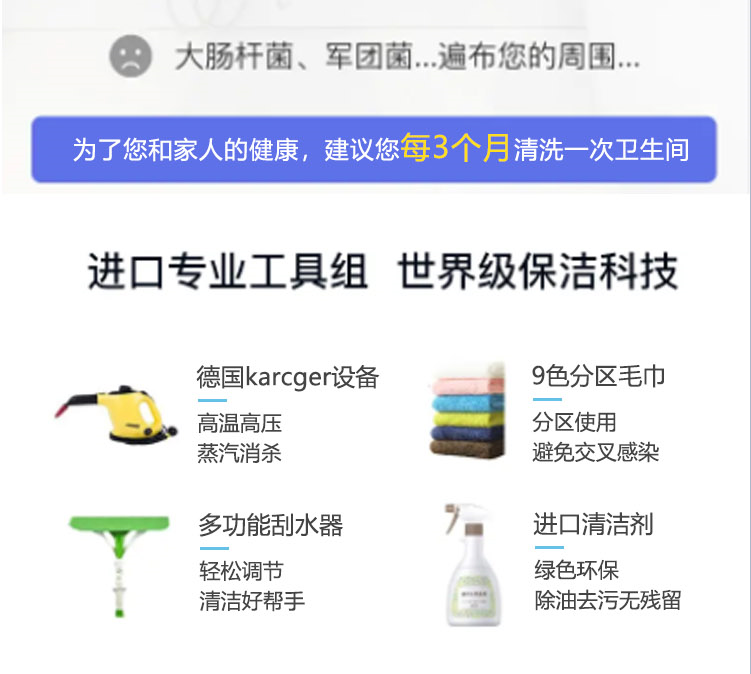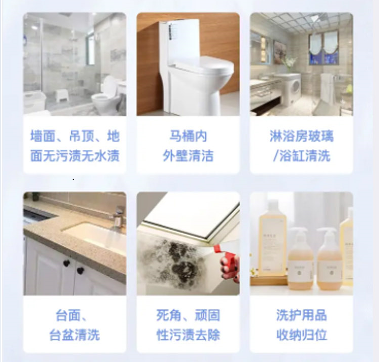 由经过专项培训的保洁师傅为您提供服务。包括表面清洁、浴室高温蒸洗、淋浴房玻璃除水垢、马桶除尿垢等服务。