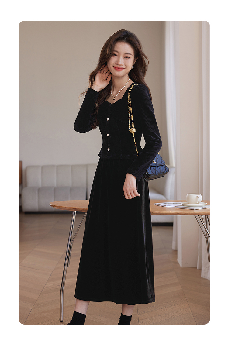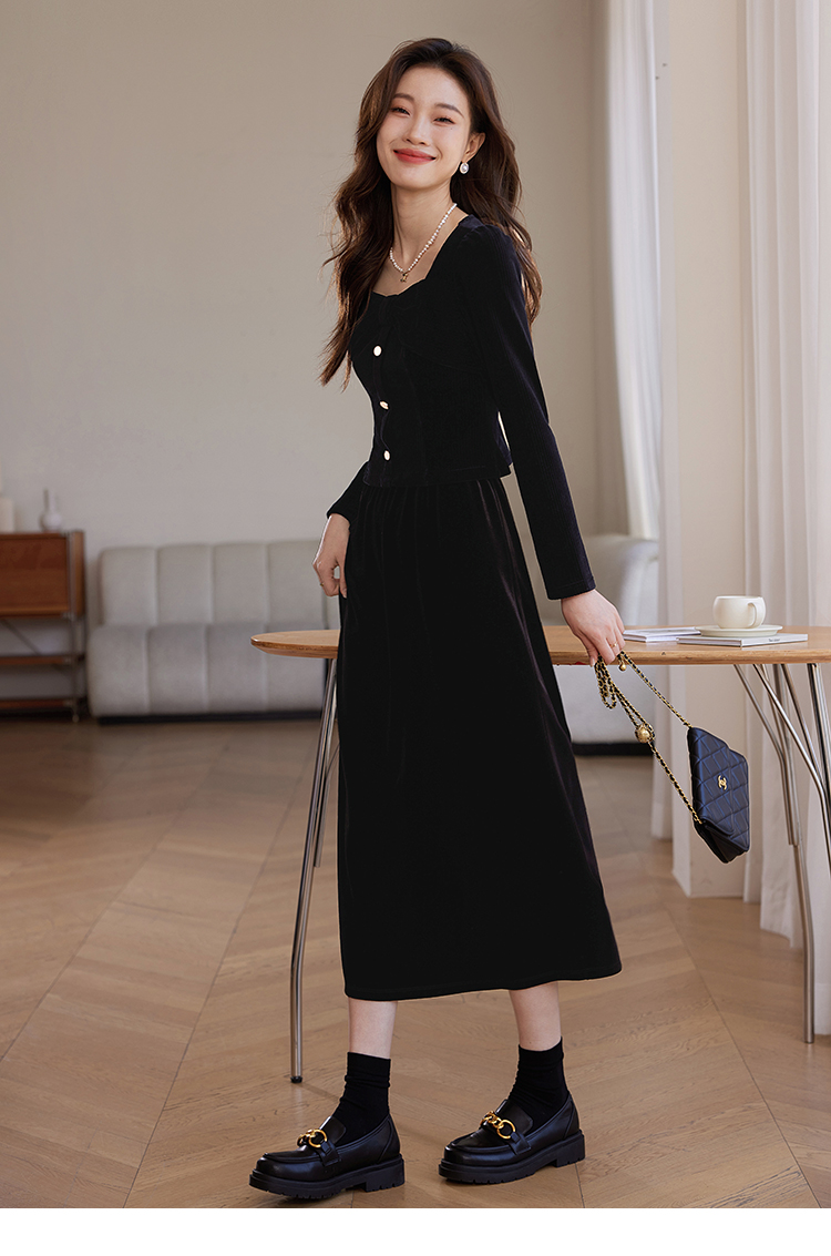 【专属特惠】熙世界跨年套装女秋冬黑色千金小香风灯芯绒半身裙连衣裙两件套装