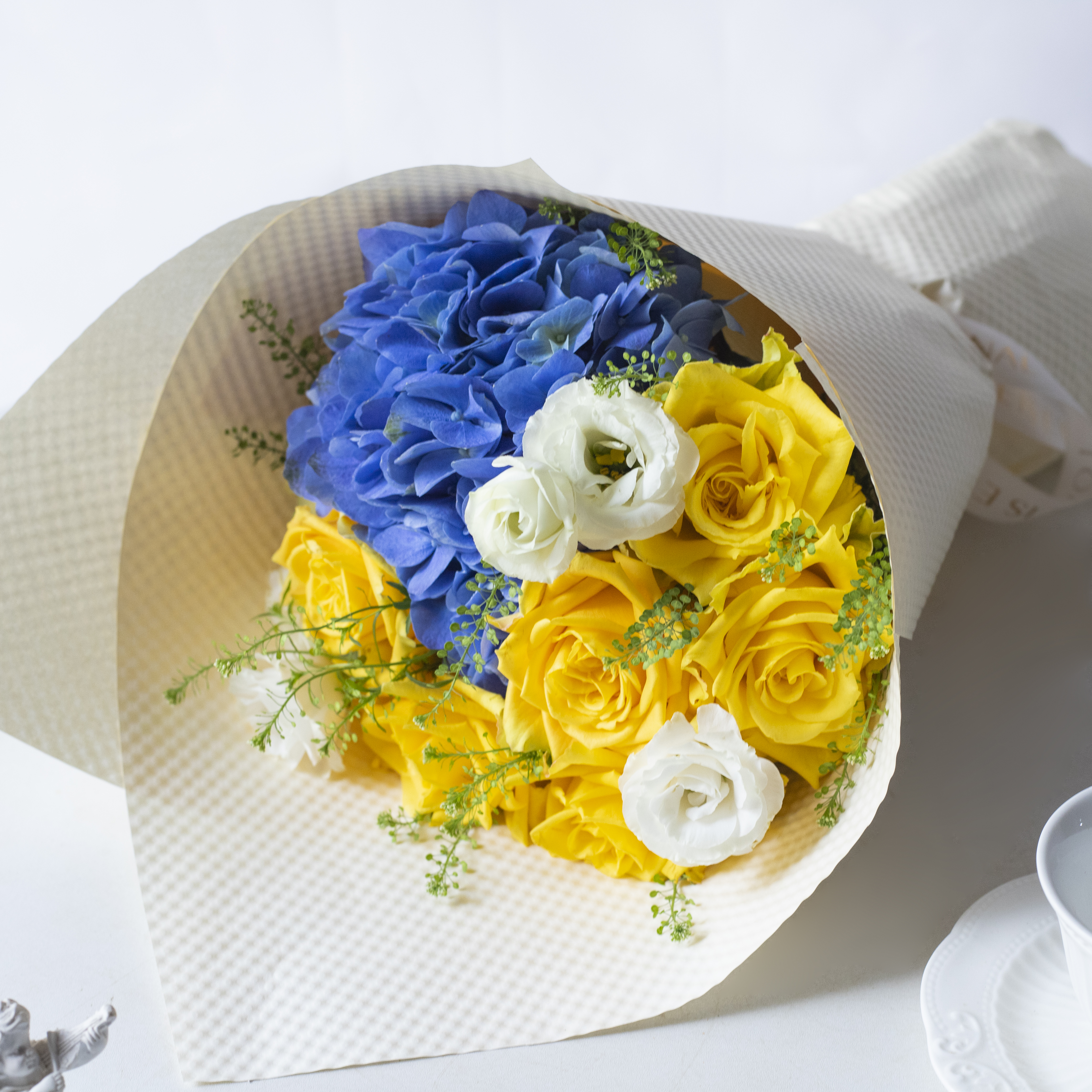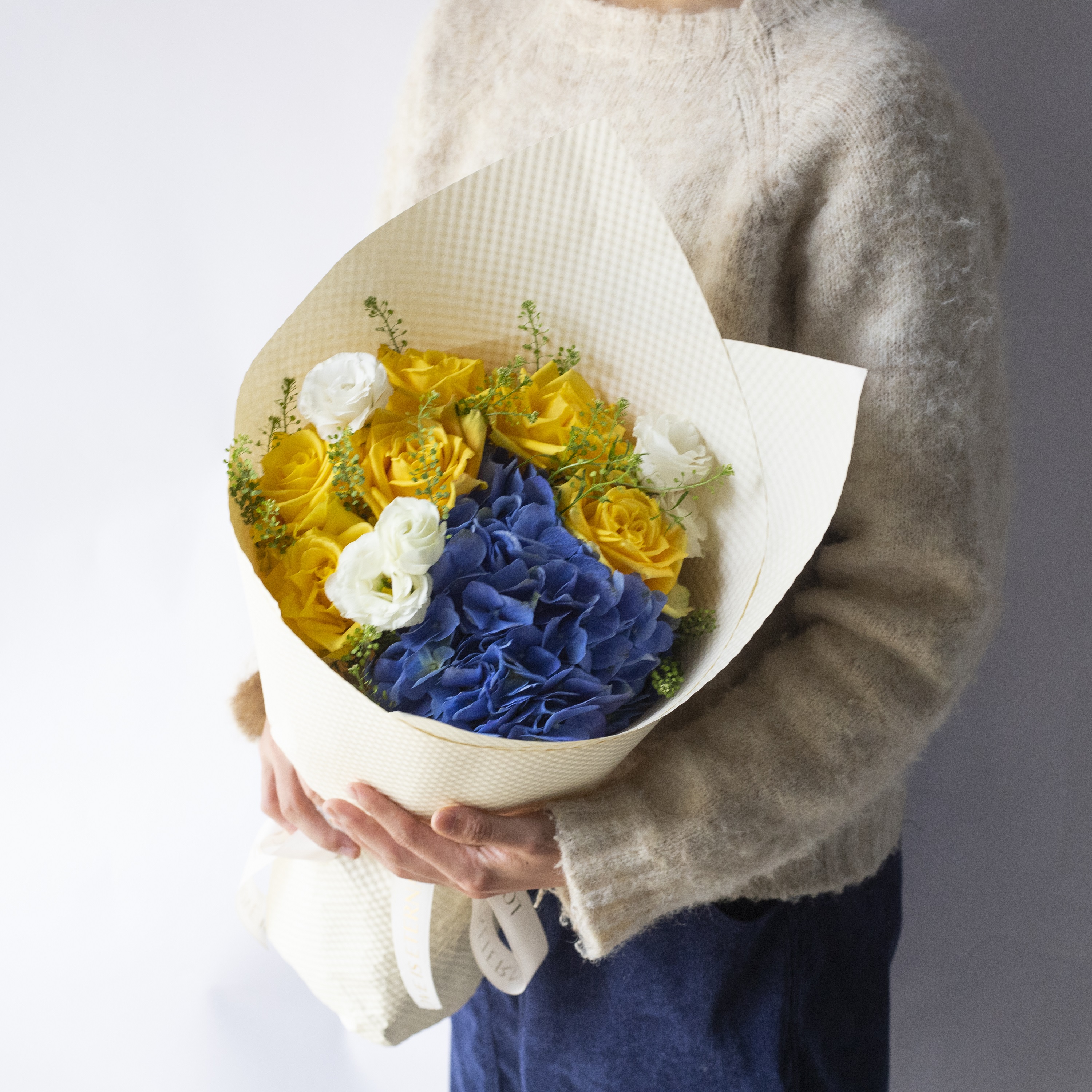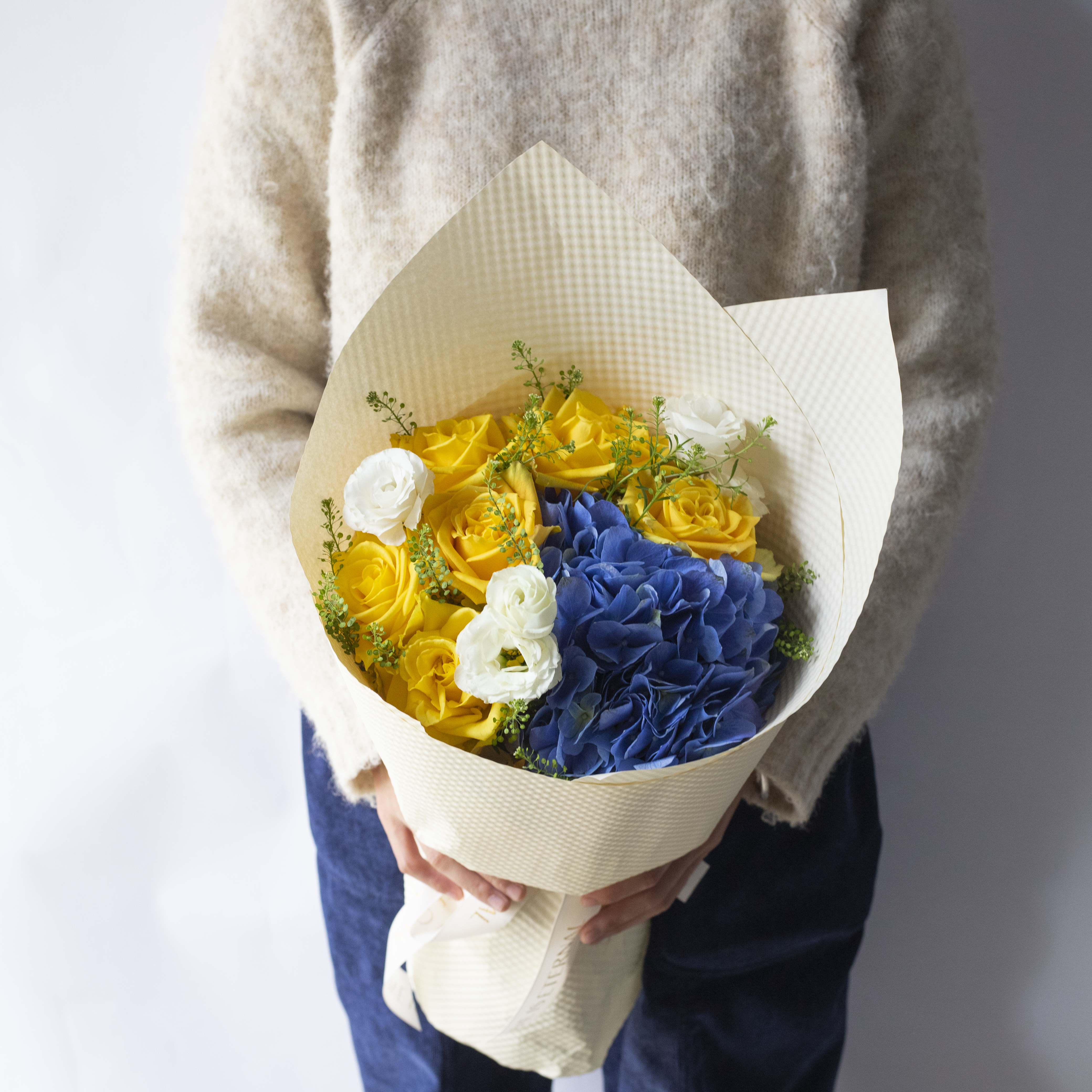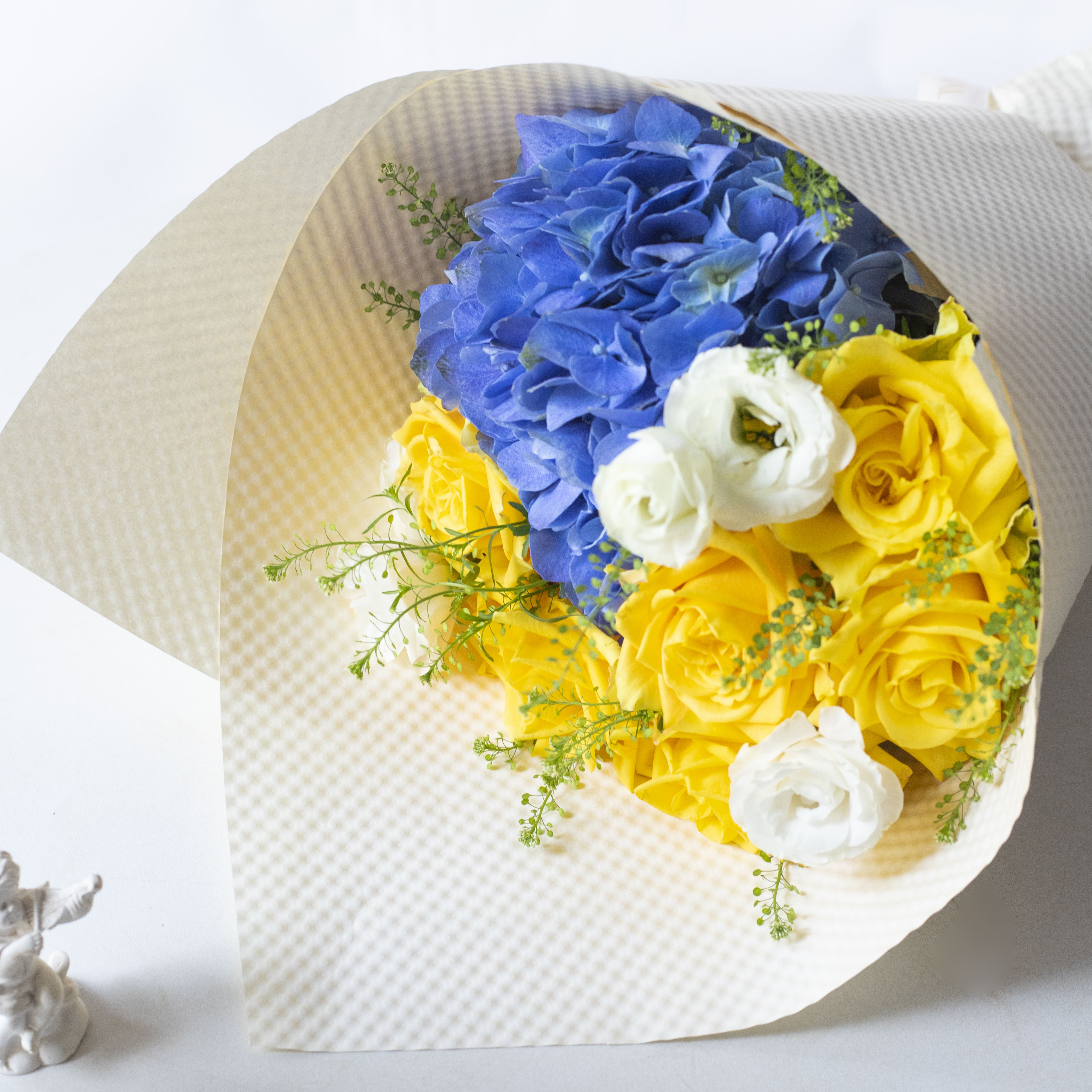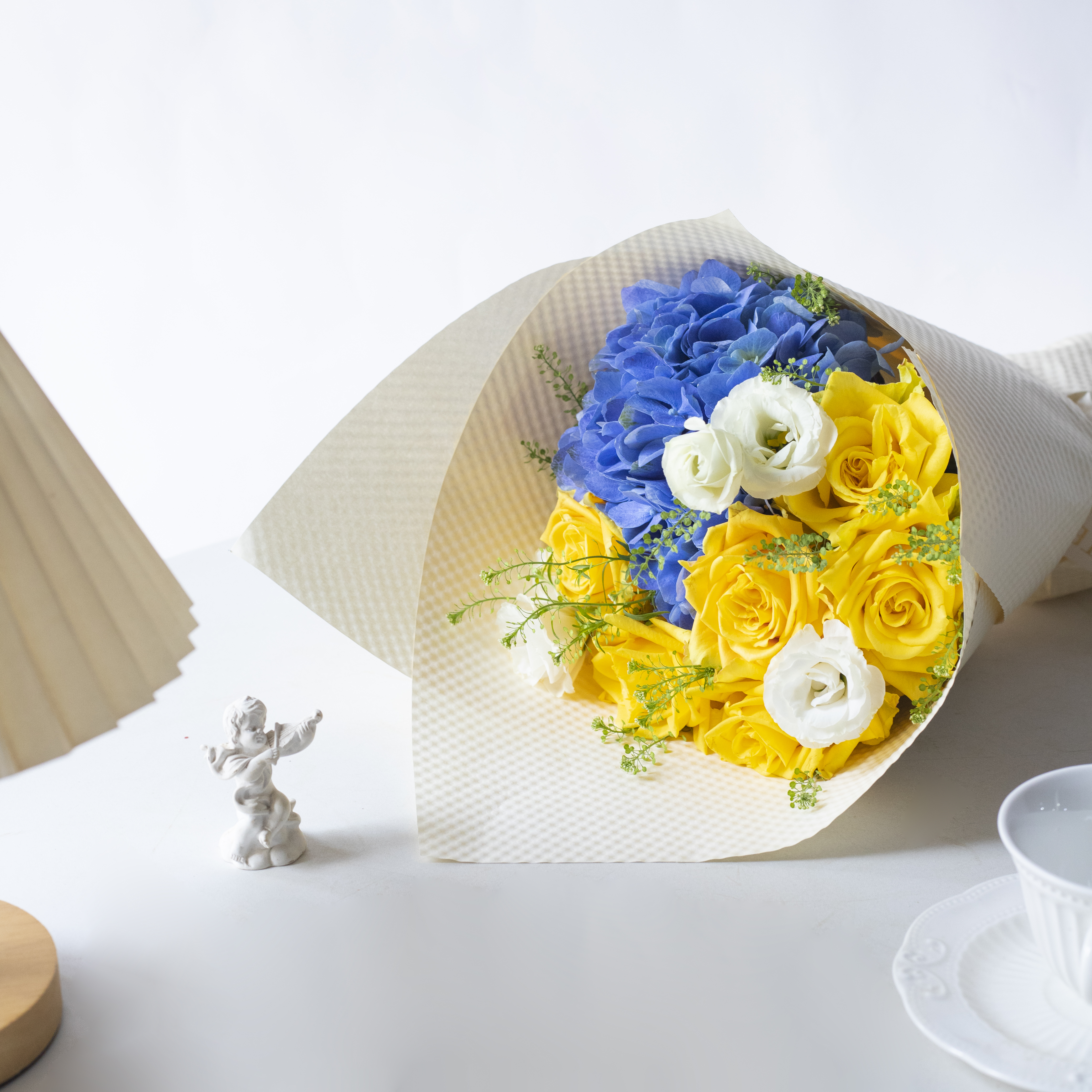 简包装花束内容:中小蓝色绣球1支+黄玫瑰9支+白桔梗2支+绿铃草1支