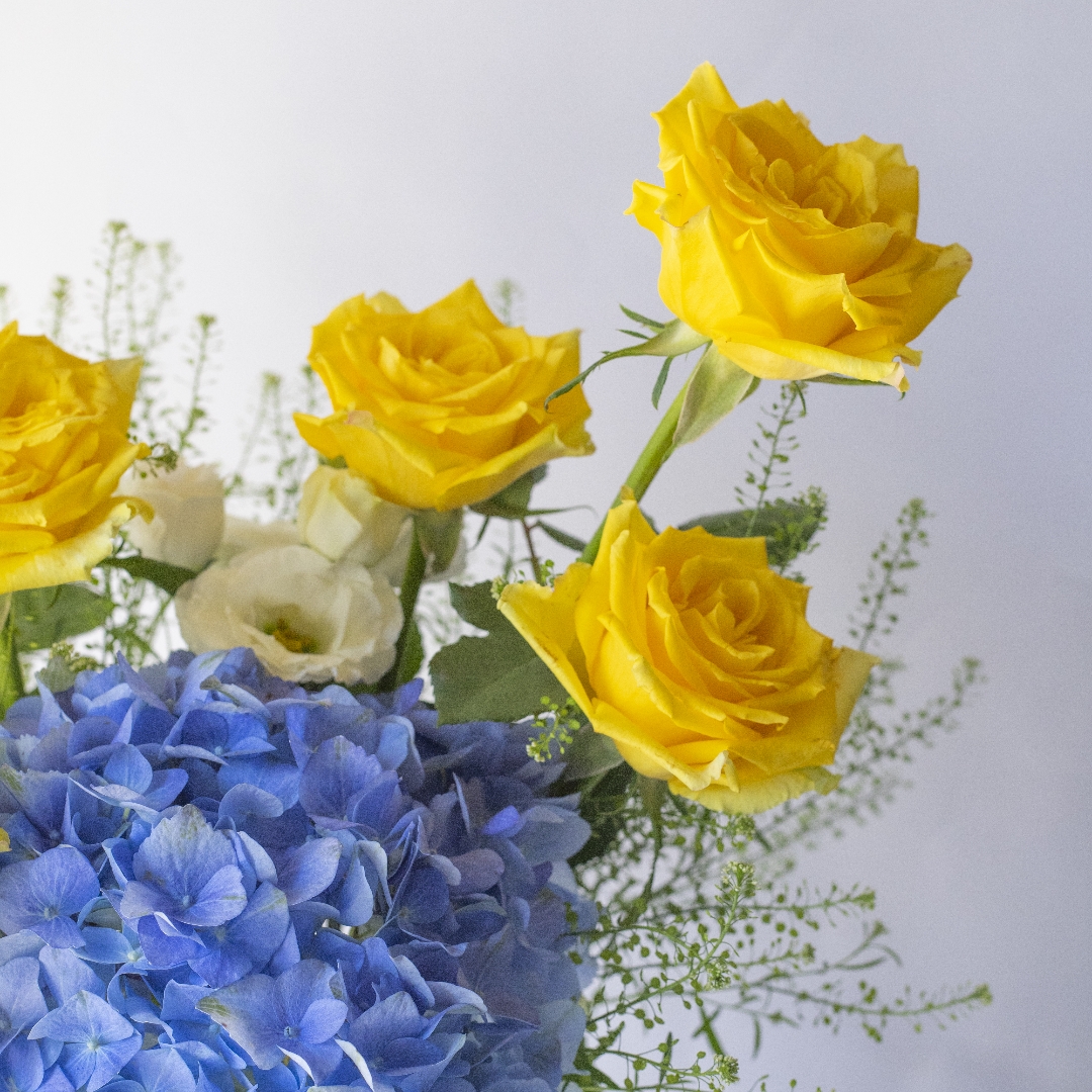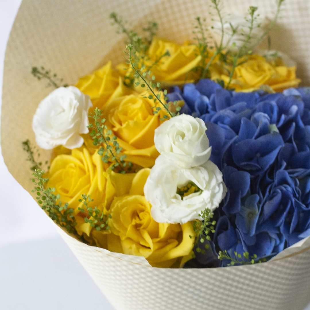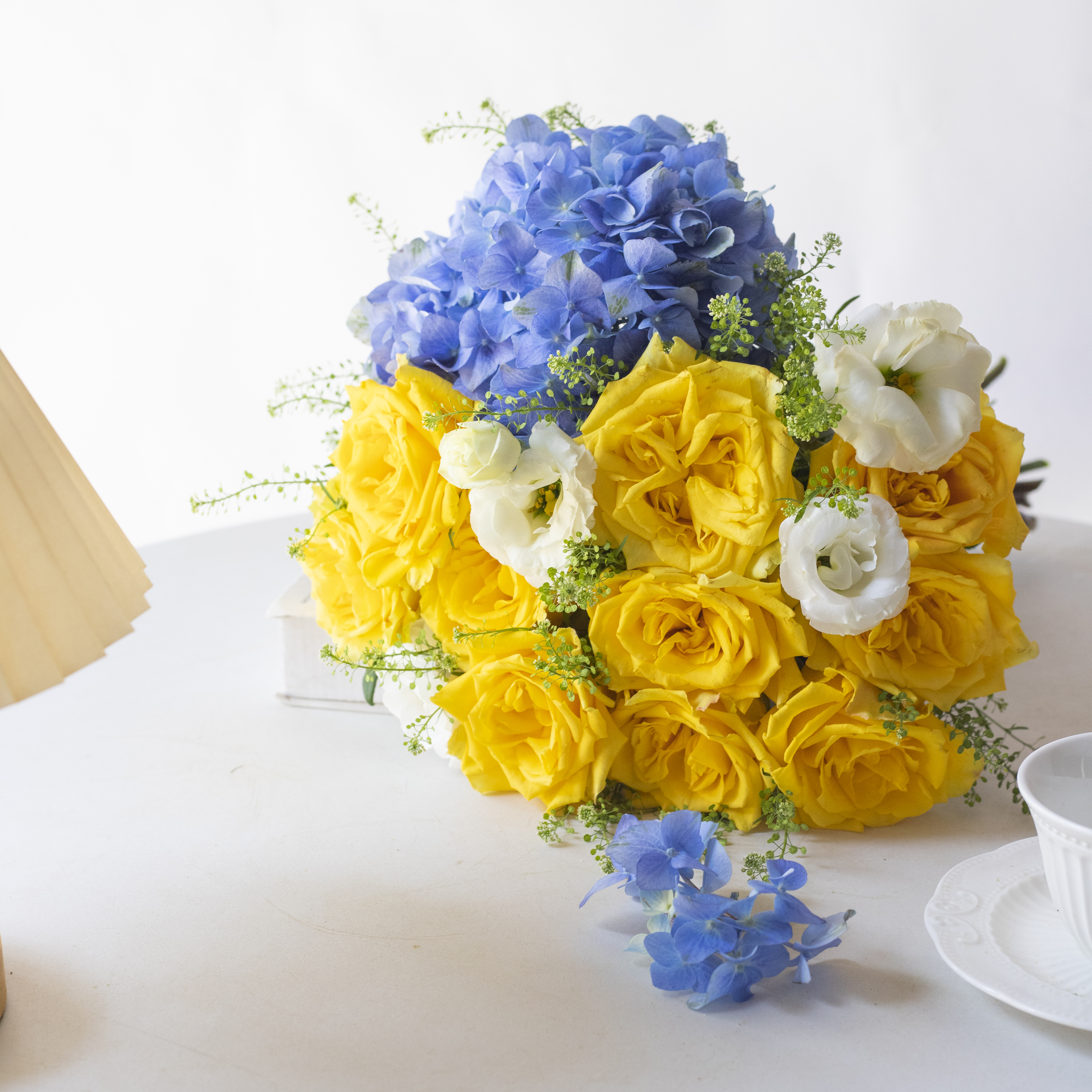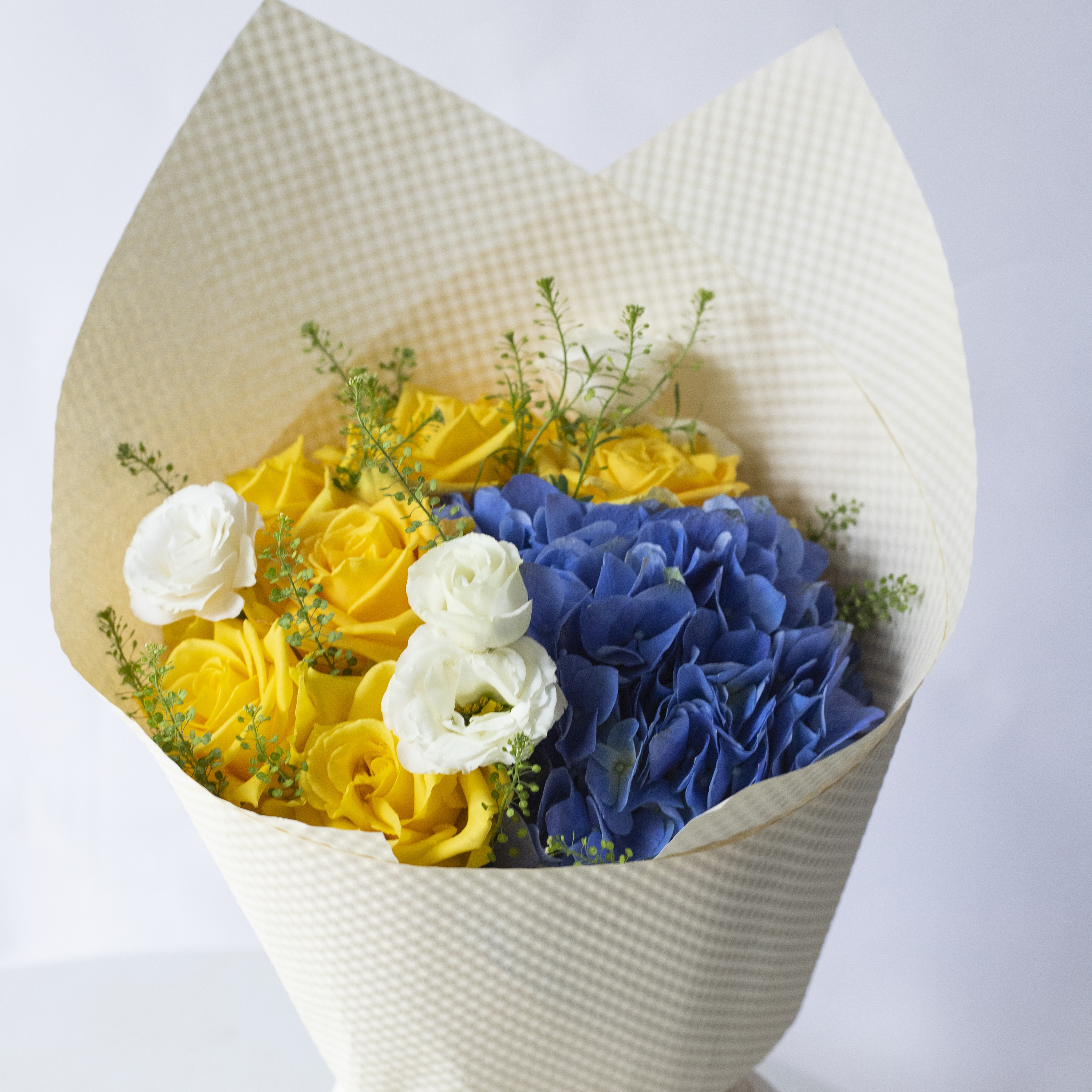 简包装花束内容:中小蓝色绣球1支+黄玫瑰9支+白桔梗2支+绿铃草1支