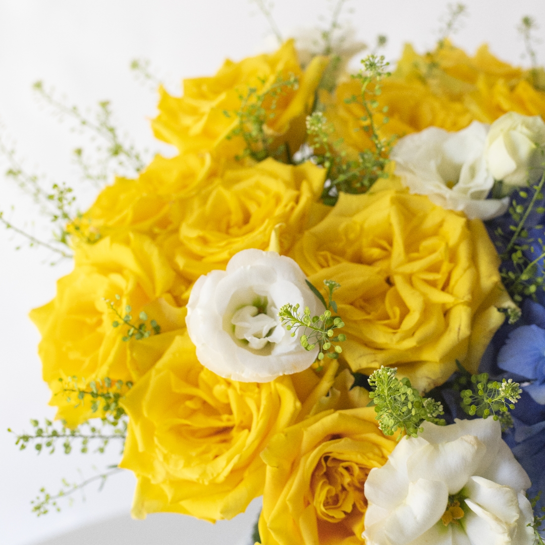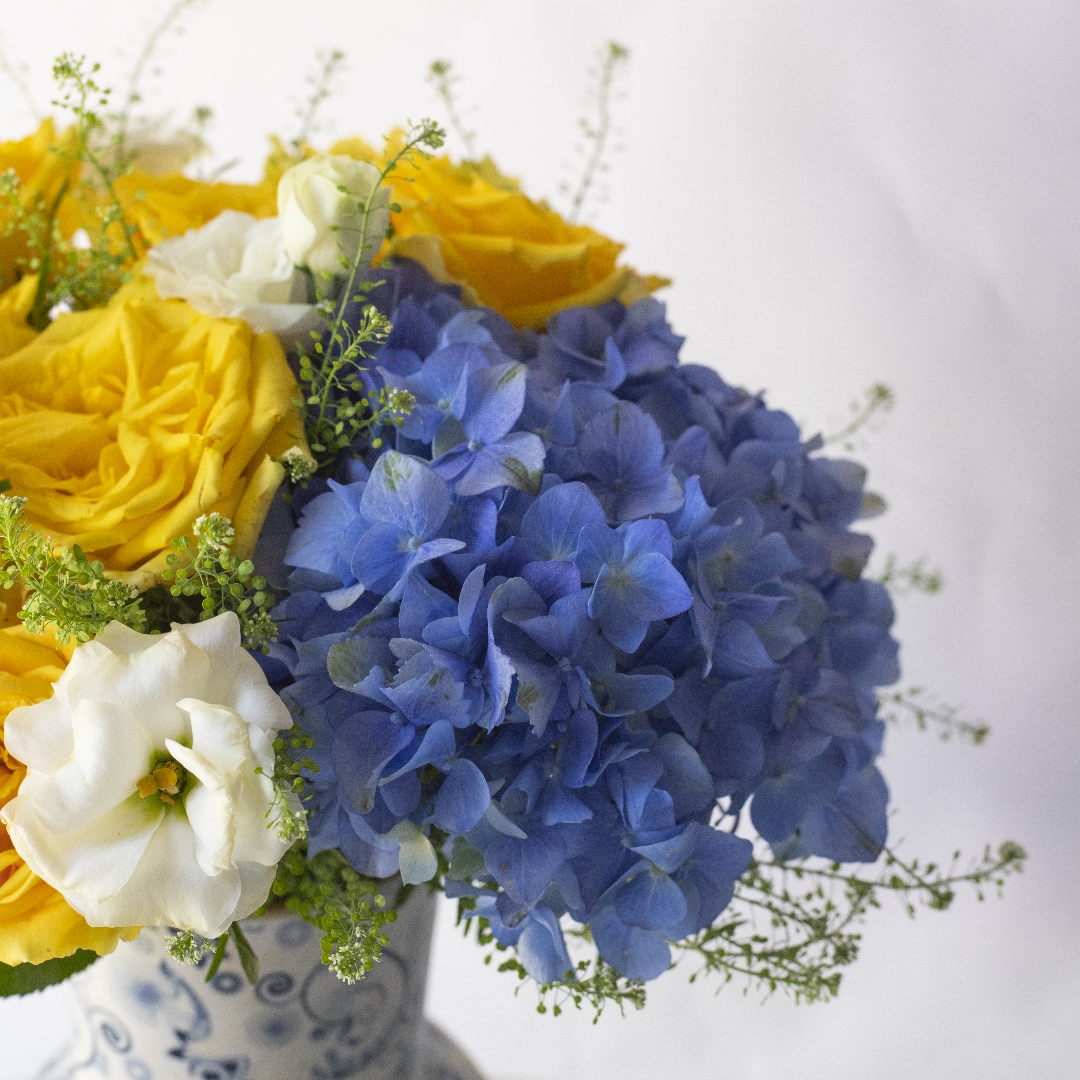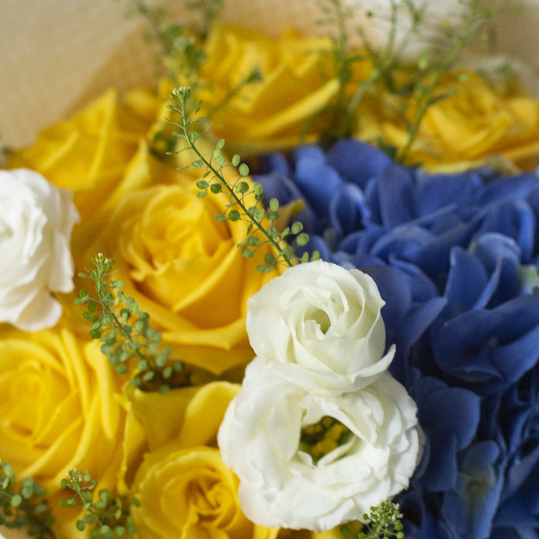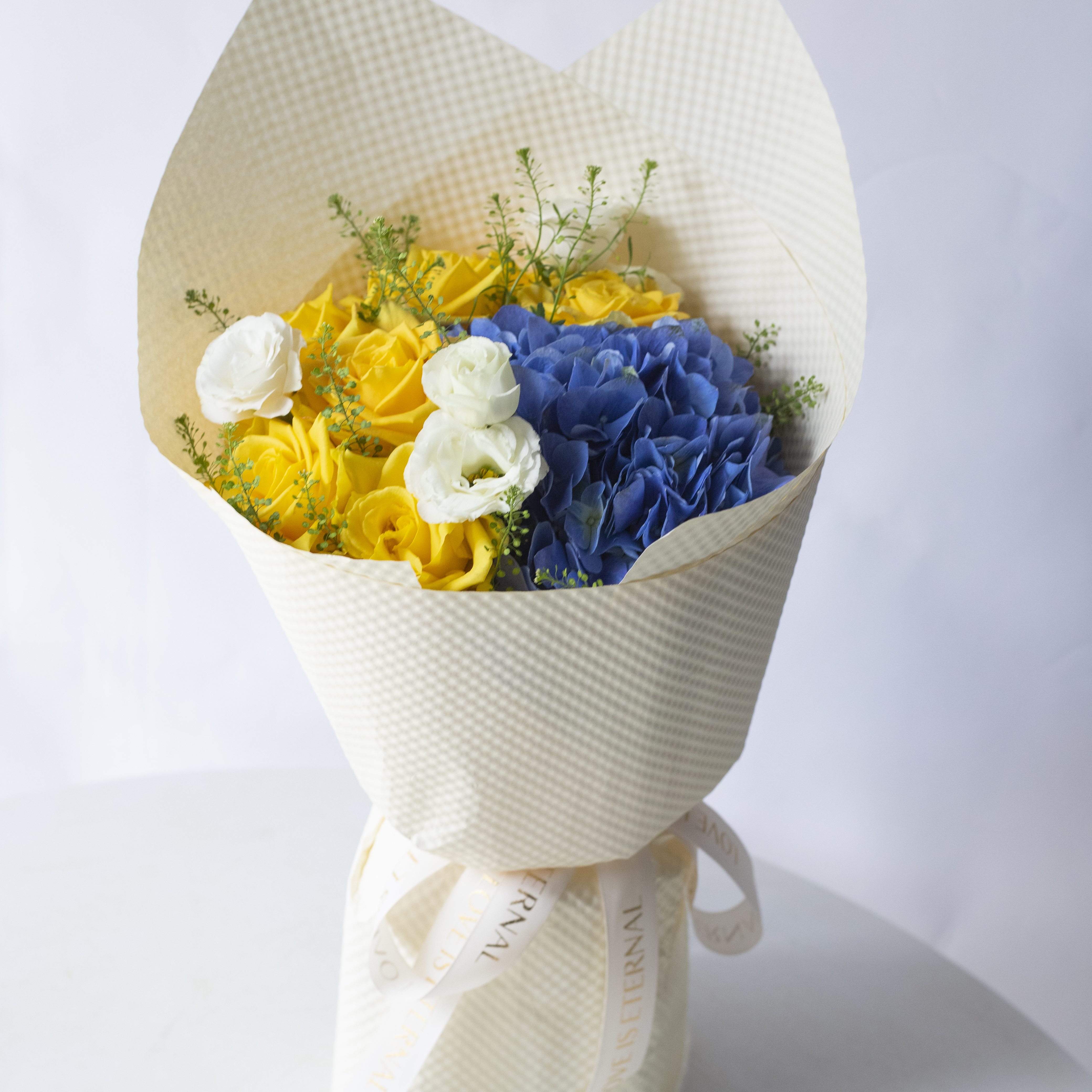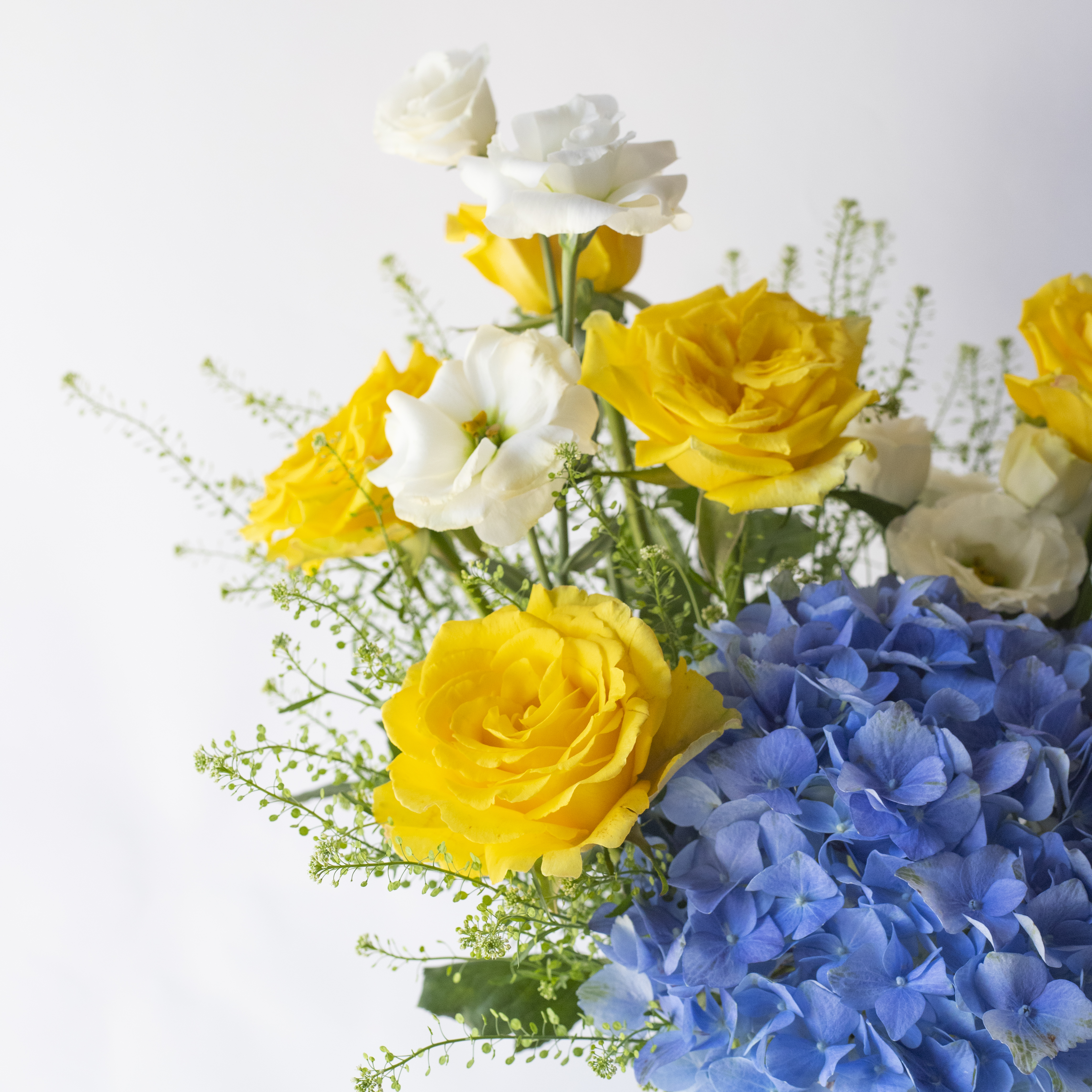 简包装花束内容:中小蓝色绣球1支+黄玫瑰9支+白桔梗2支+绿铃草1支