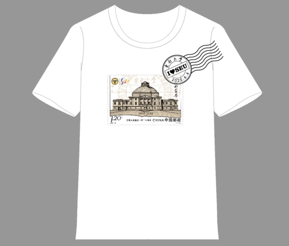 产品介绍:东南大学建校120周年手绘T恤,画面为东南大学校庆画面+东南大学建校120周年邮票图案,颜色为白色。