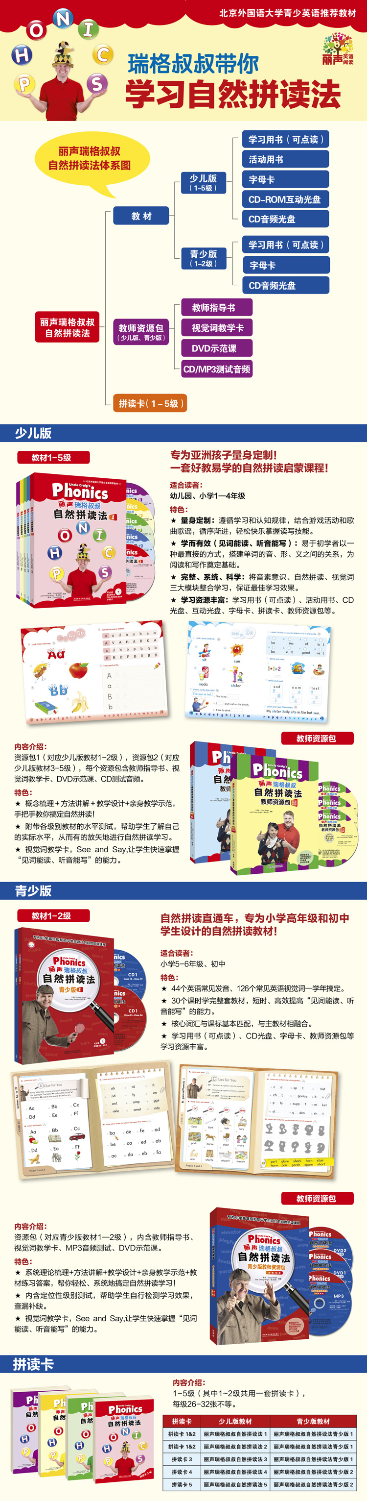 丽声瑞格叔叔自然拼读法1-5套装(点读版)(配光盘)专为亚洲孩子量身定制,一套好教易学的自然拼读英语启蒙课程!
