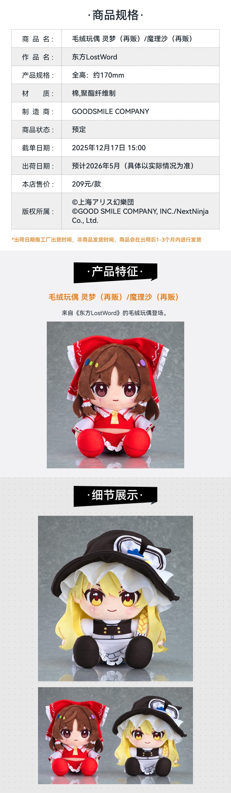 【GSC预售定金】毛绒玩偶 灵梦/魔理沙 东方LostWord 手办模玩