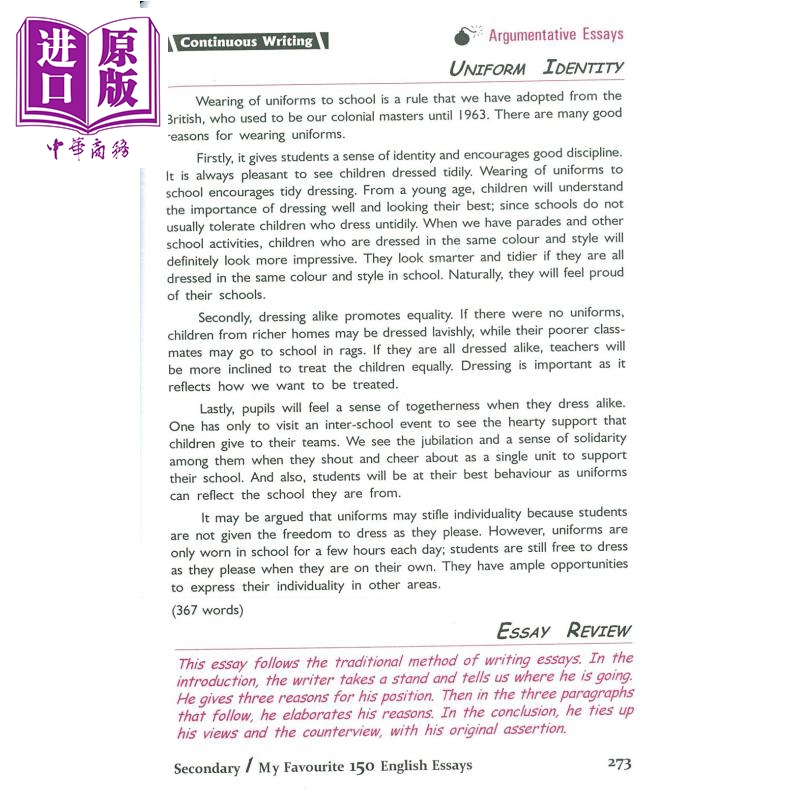 From Secondary 1, students have started to learn how to write Continuous and Situational Essays. These two types of essay writing will be tested in the English examinations from Secondary 1 to Secondary 4. In this book, the authors have put together a collection of these two kinds of essays for students to understand what makes a good essay. To help students get the best out of them, the book begins each essay with a ‘Suggested Approach’ on how the essay could be tackled. In the margin of each essay, the authors have provided an ‘Essay Review’ pointing out why the essay is well-written. Using this book as a guide, students should be able to master the correct skills of essay writing. Once mastered, they will be able to deal with English examinations confidently throughout their secondary school duration.