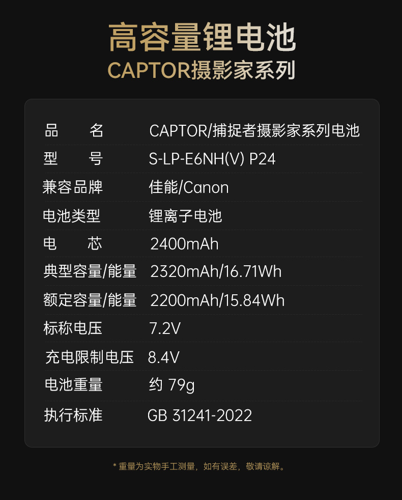 狼族优选|CAPTOR 摄影家系列单反无反微单相机电池 高容量 耐低温