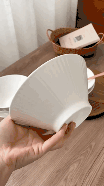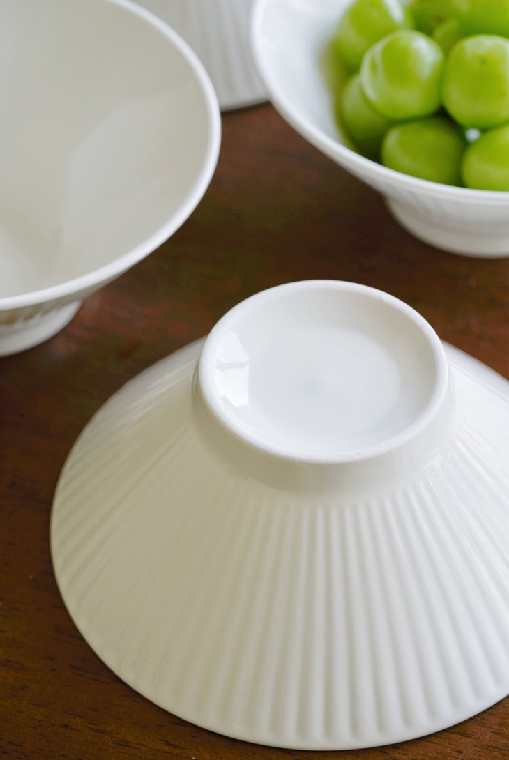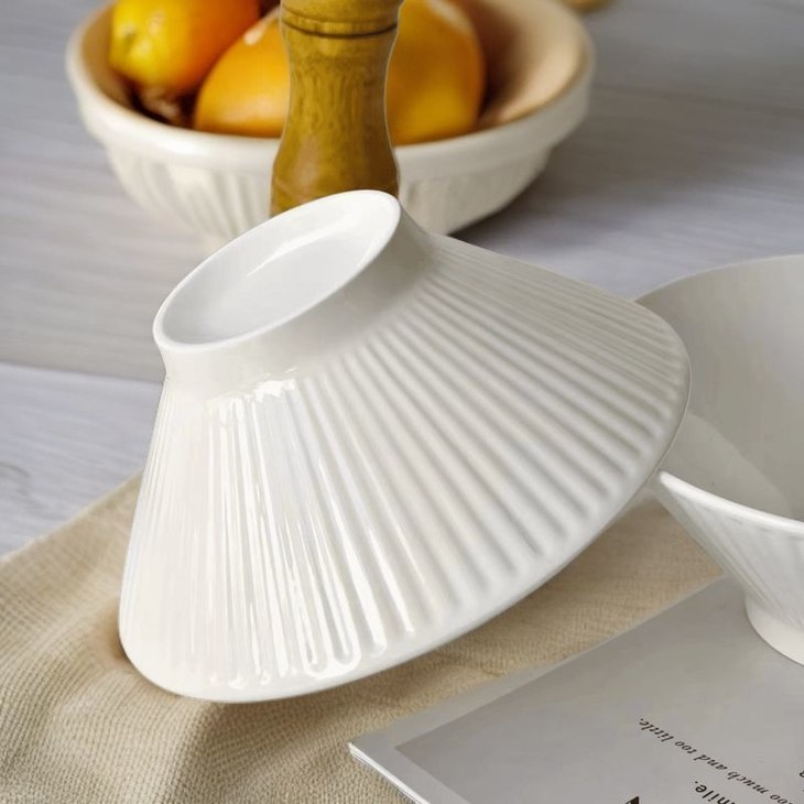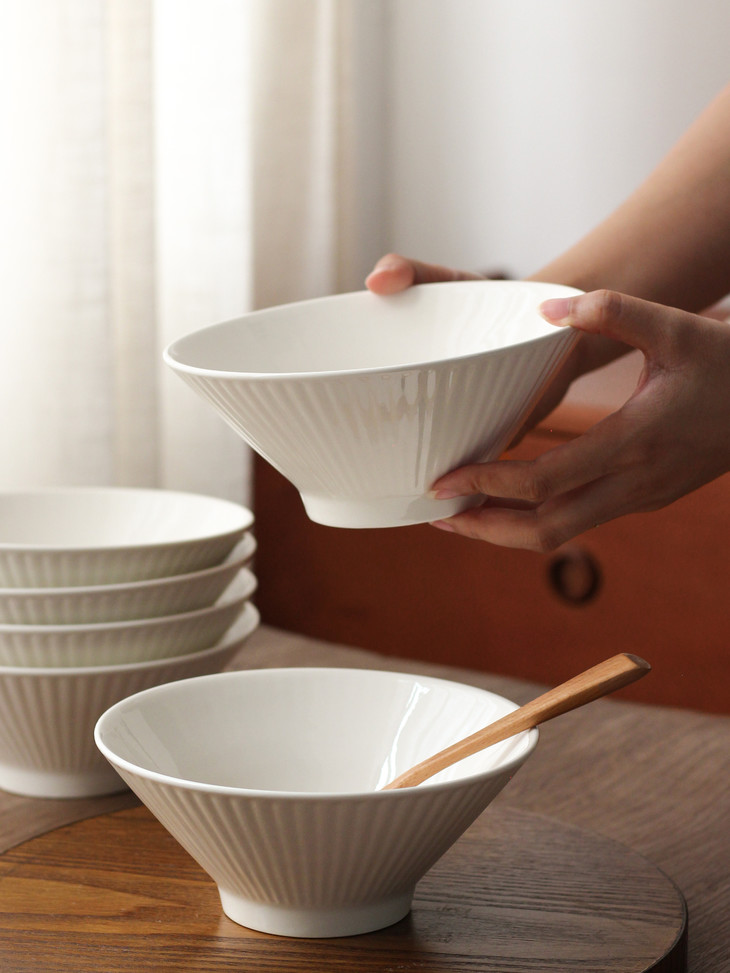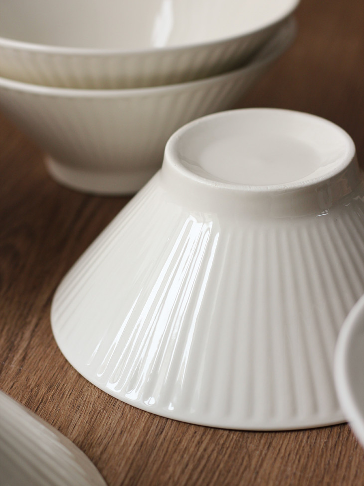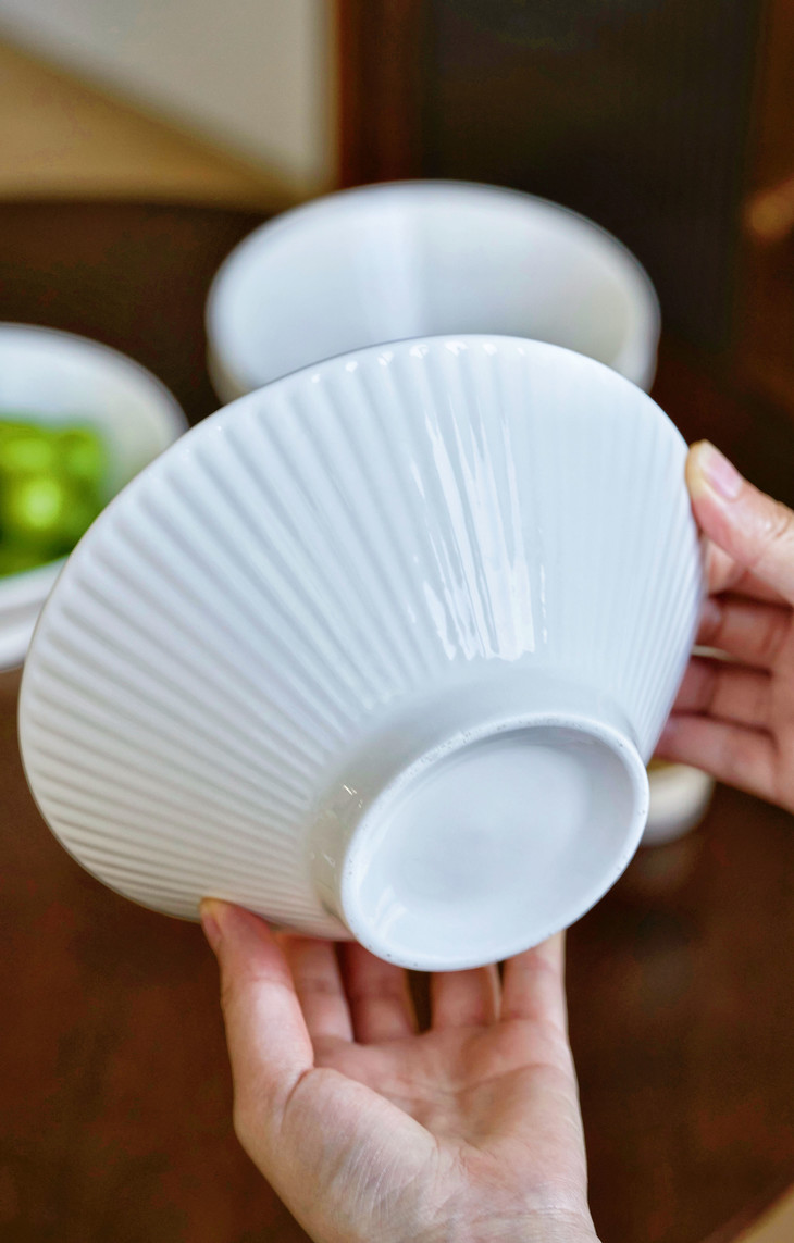 ✅简约造型,贴心的做工 白色是一直都很流行的颜色 美学中的简约主义 🔺碗外侧条纹浮雕工艺 高脚斗笠造型 防滑、防烫,手感舒适 🔺加厚的陶瓷边沿 更耐磕碰,坚固耐用 🔺抛光细腻,耐低温、耐煮、不易碎 很容易清洗 🔺盘底防滑设计 为防滑考虑,底部未上釉 不影响正常使用