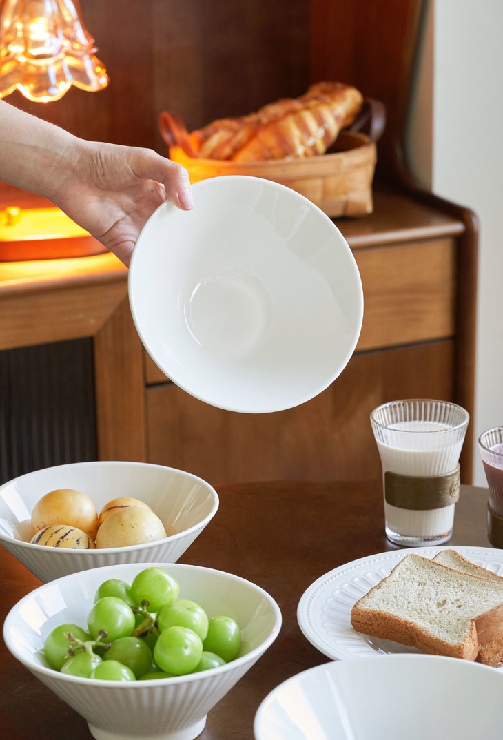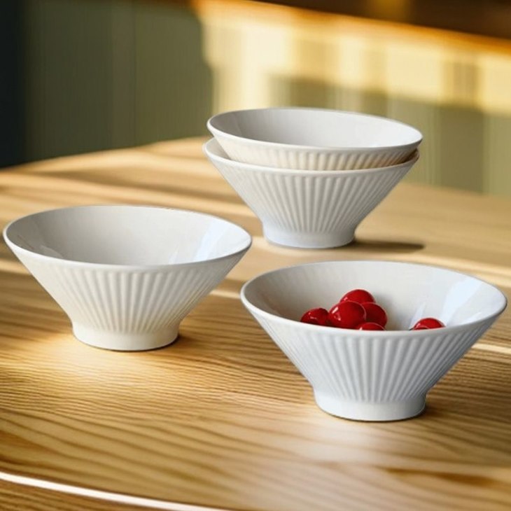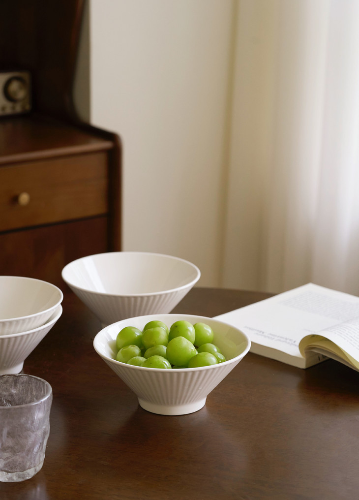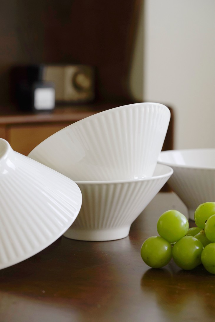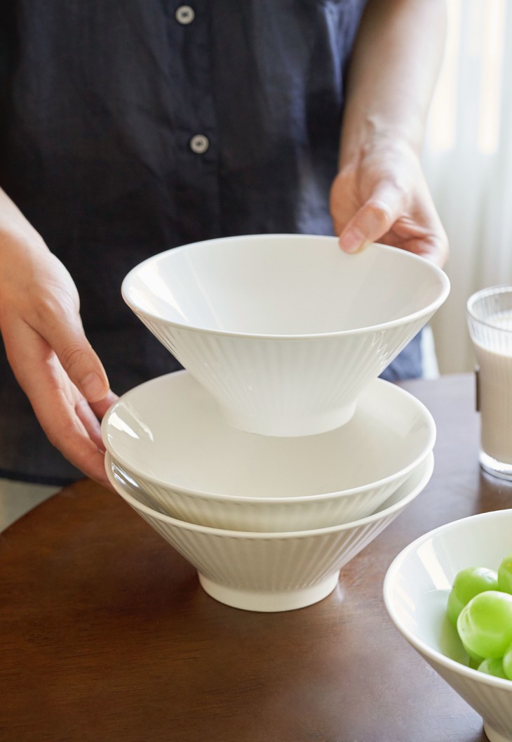 ✅简约造型,贴心的做工 白色是一直都很流行的颜色 美学中的简约主义 🔺碗外侧条纹浮雕工艺 高脚斗笠造型 防滑、防烫,手感舒适 🔺加厚的陶瓷边沿 更耐磕碰,坚固耐用 🔺抛光细腻,耐低温、耐煮、不易碎 很容易清洗 🔺盘底防滑设计 为防滑考虑,底部未上釉 不影响正常使用