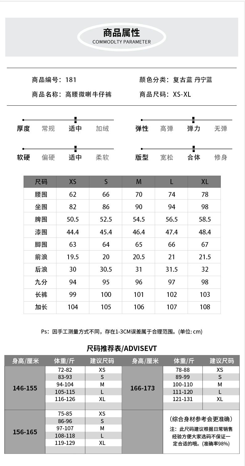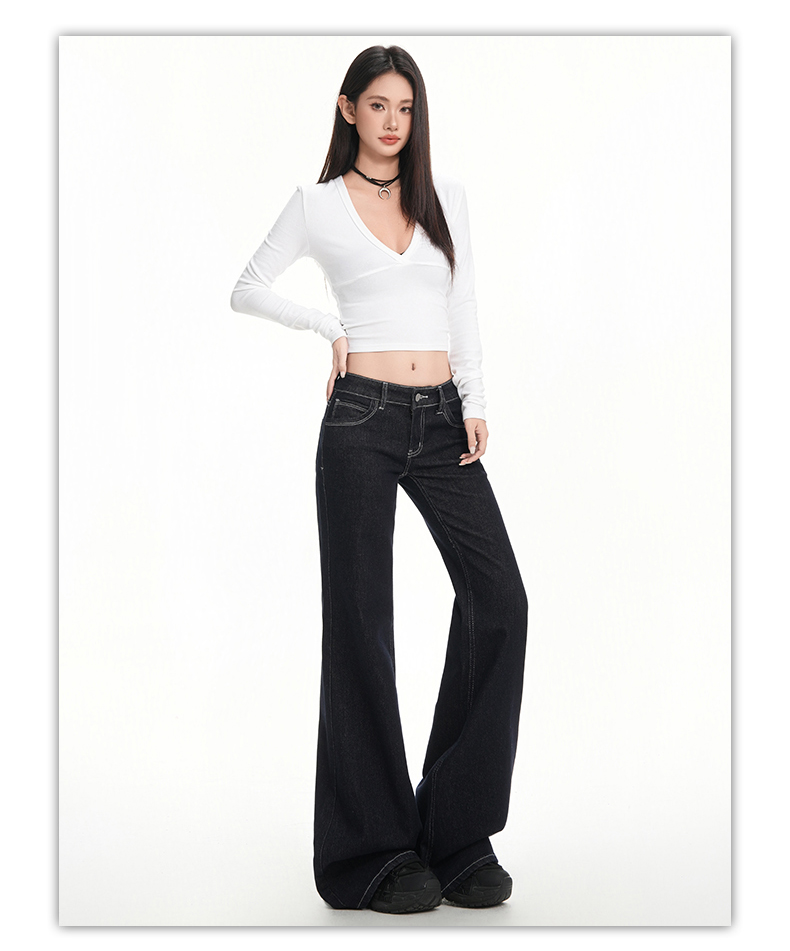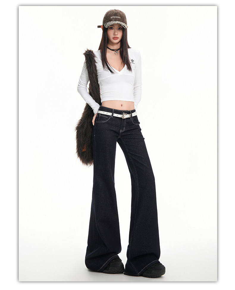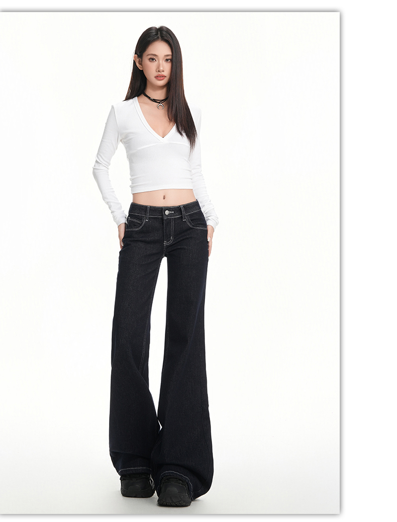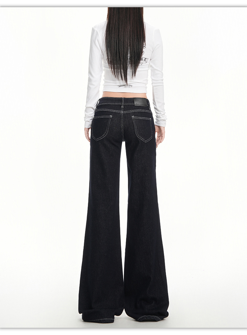 罗蒙女士春秋款复古蓝微喇直筒高腰百搭显瘦宽松喇叭不贴腿拖地长裤子