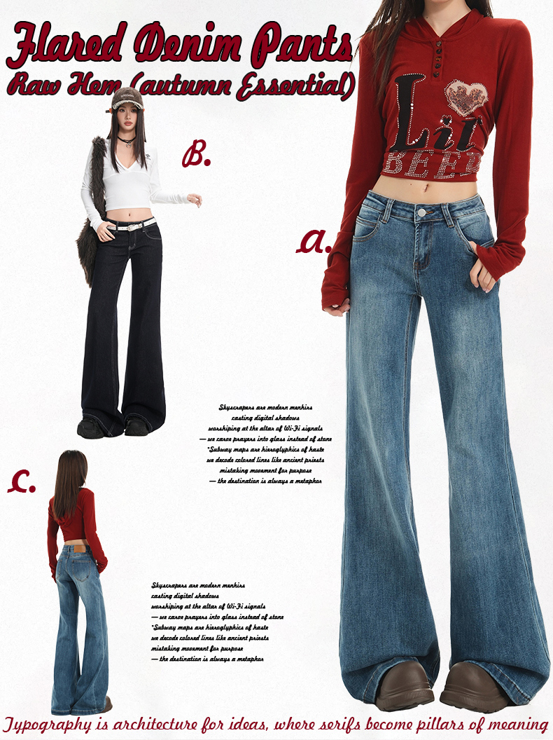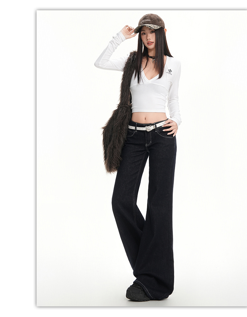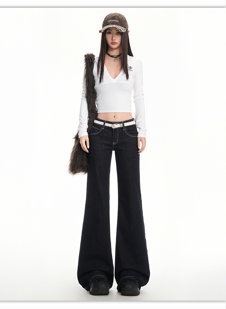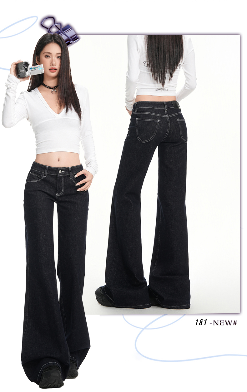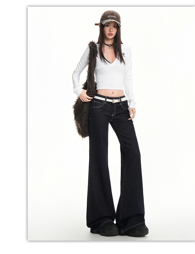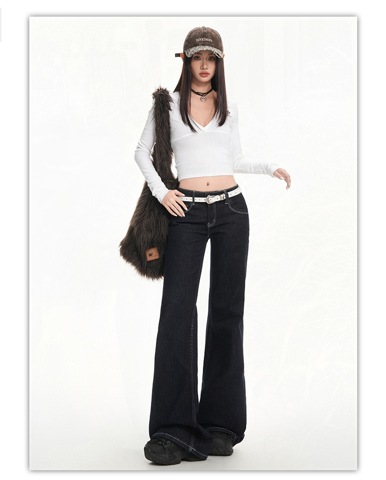 罗蒙女士春秋款复古蓝微喇直筒高腰百搭显瘦宽松喇叭不贴腿拖地长裤子