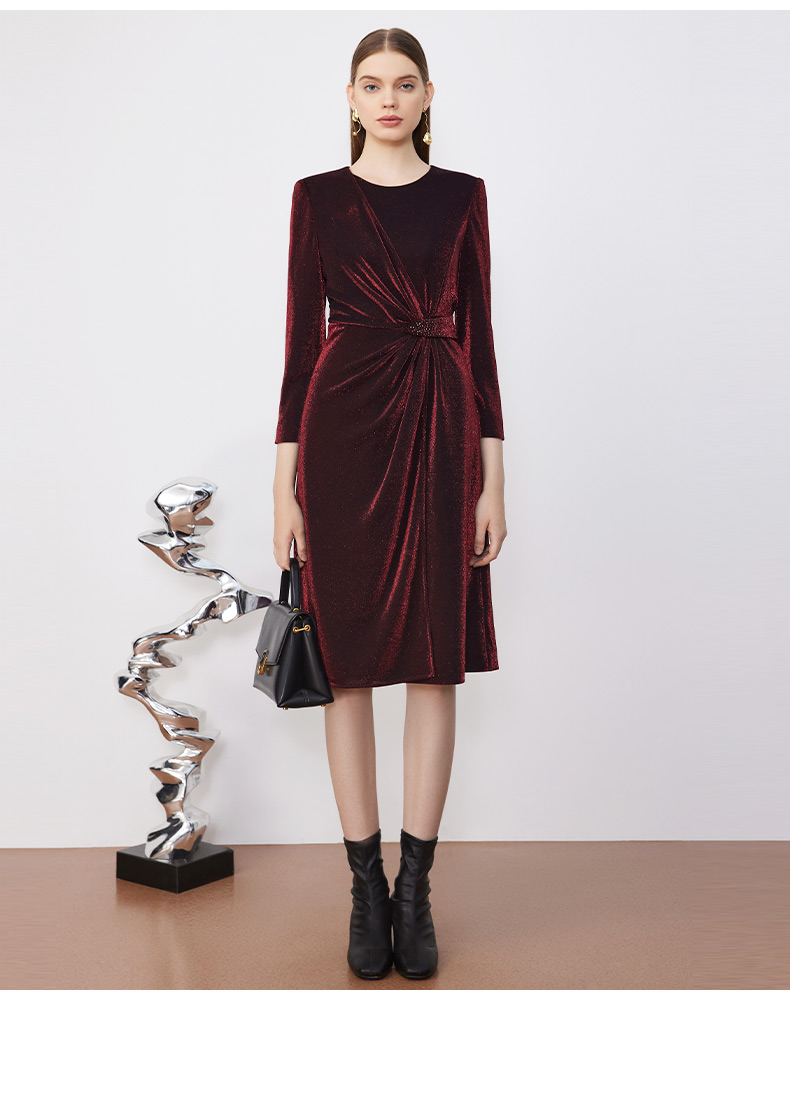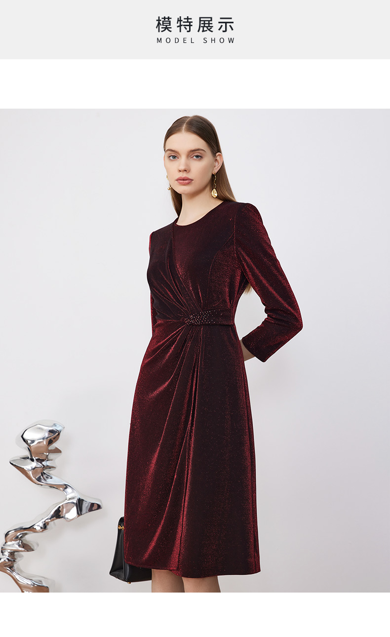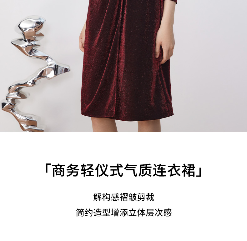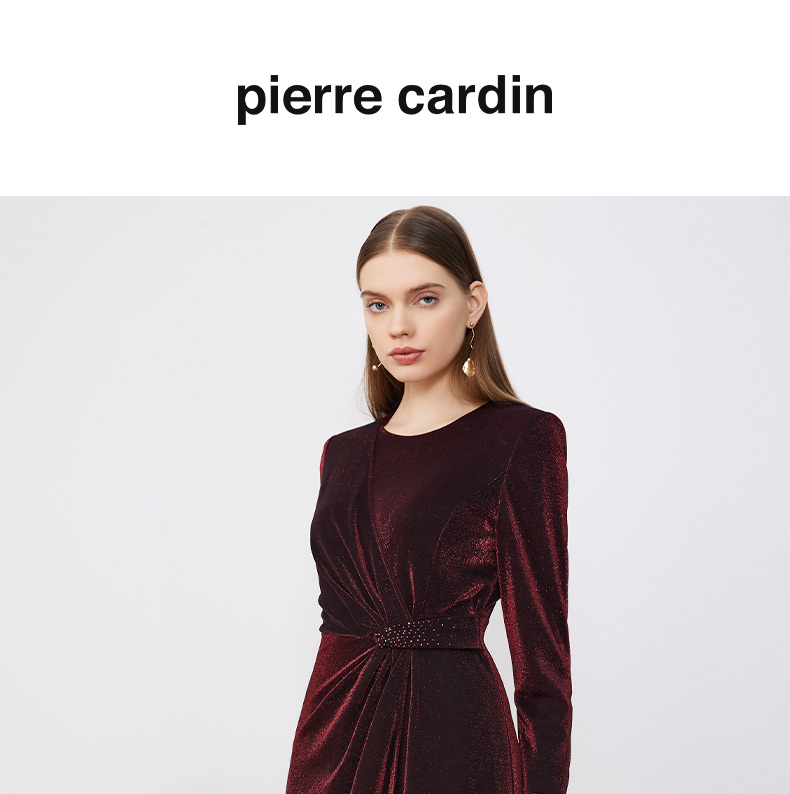 皮尔卡丹女装连衣裙气质时尚修身通勤宴会褶皱连衣裙P3341E3876T0