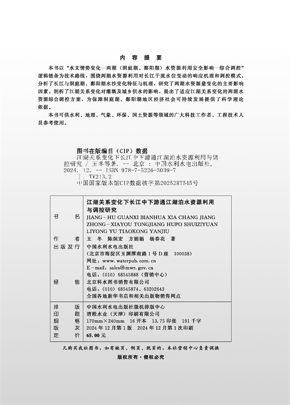 "本书以“水文情势变化-两湖水资源利用安全影响-综合调控”逻辑链条为技术路线,围绕两湖水资源利用对长江干流水位变动的响应机理和调控模式,分析了长江—洞庭湖、鄱阳湖水沙变化特征与机理,研究了两湖水资源量变化的主要影响因素,剖析了江湖关系变化对灌溉及城乡供水的影响,提出了适应江湖关系变化的两湖水资源综合调控方案,为保障洞庭湖、鄱阳湖经济社会可持续发展提供科学理论依据。