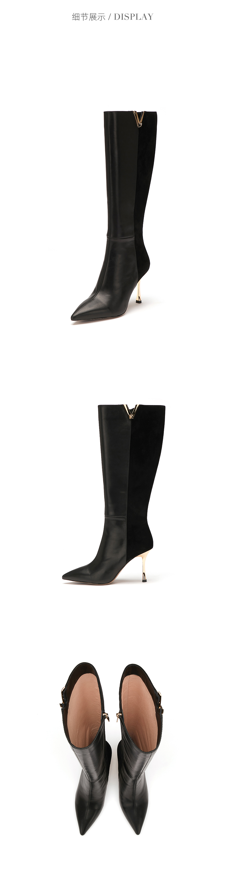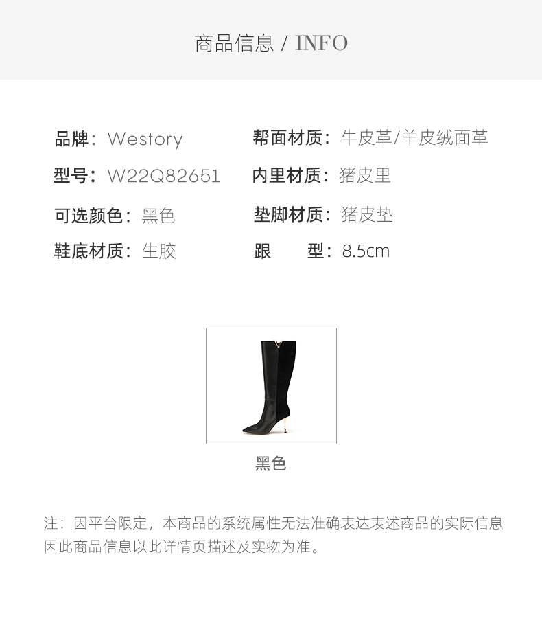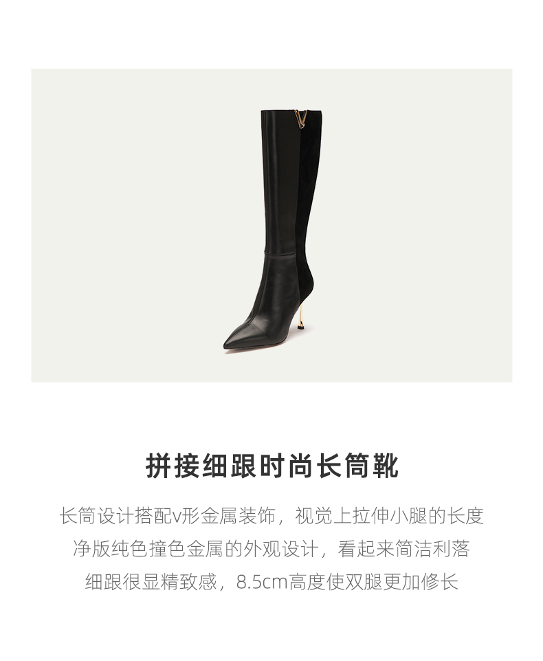 westory2022秋冬新款金属v口长筒粗腿真皮拼接细高跟长靴82651