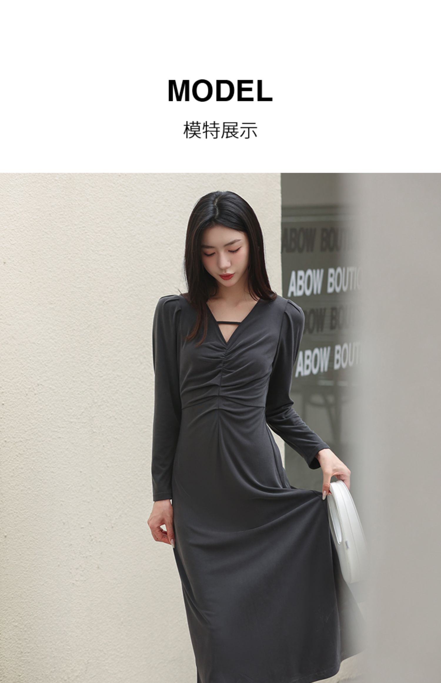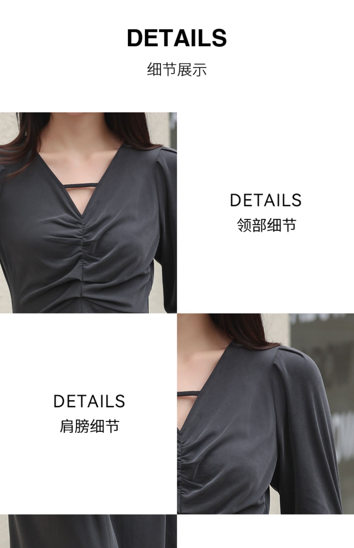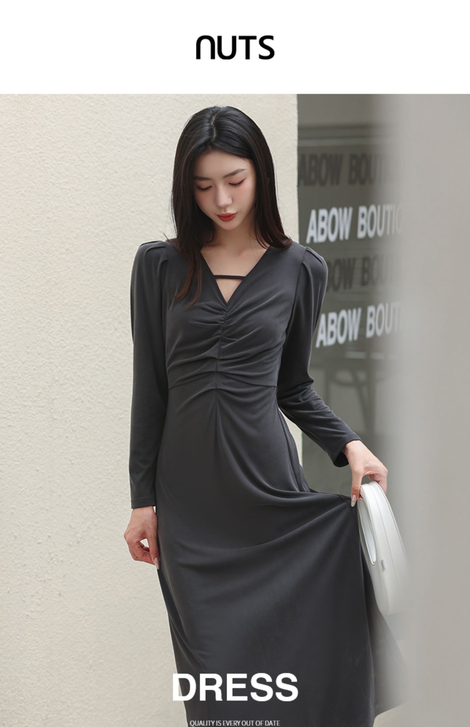 NUTS2023秋季新款V领泡泡袖连衣裙女高级感褶皱显身材4351001A1