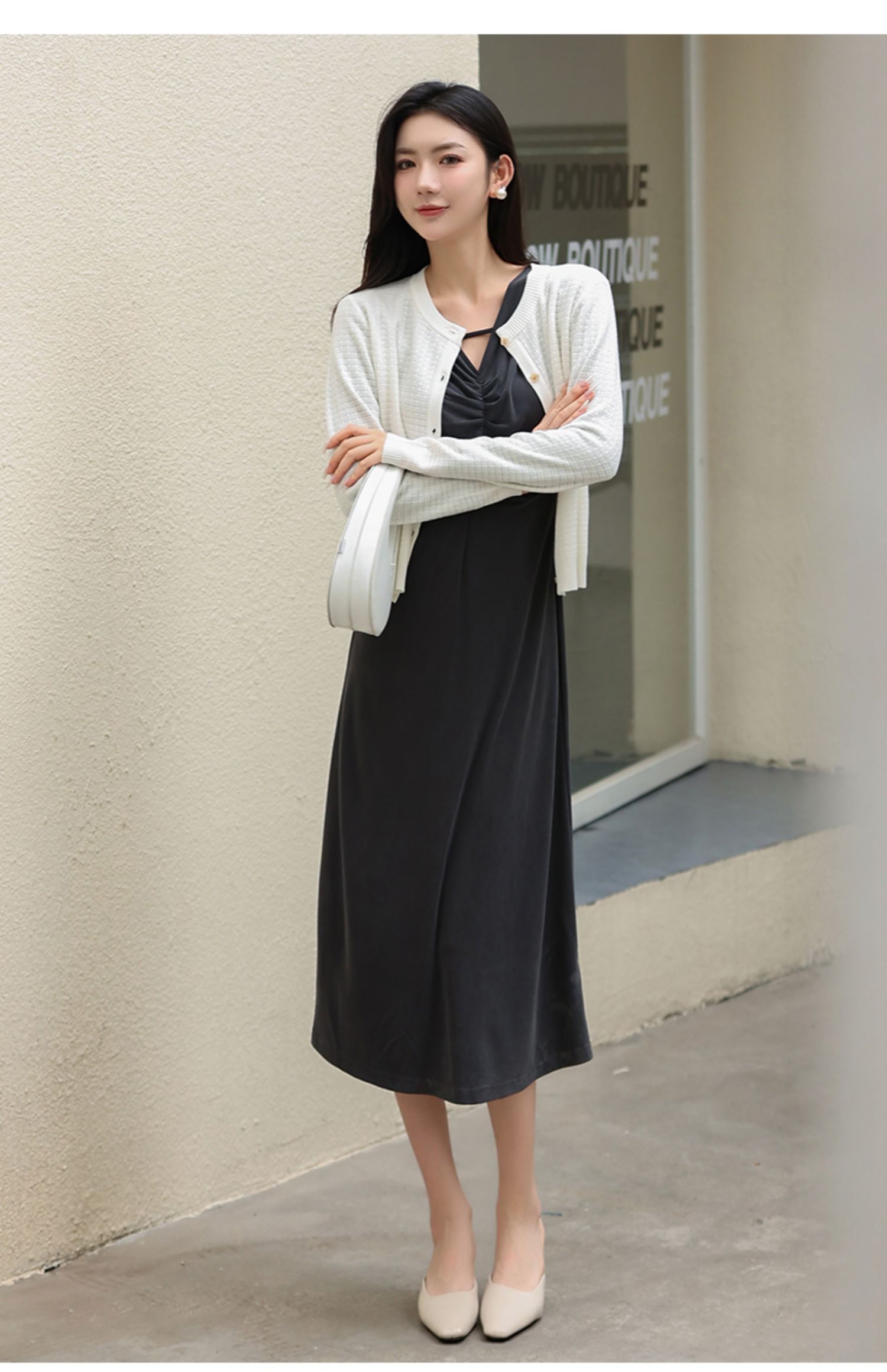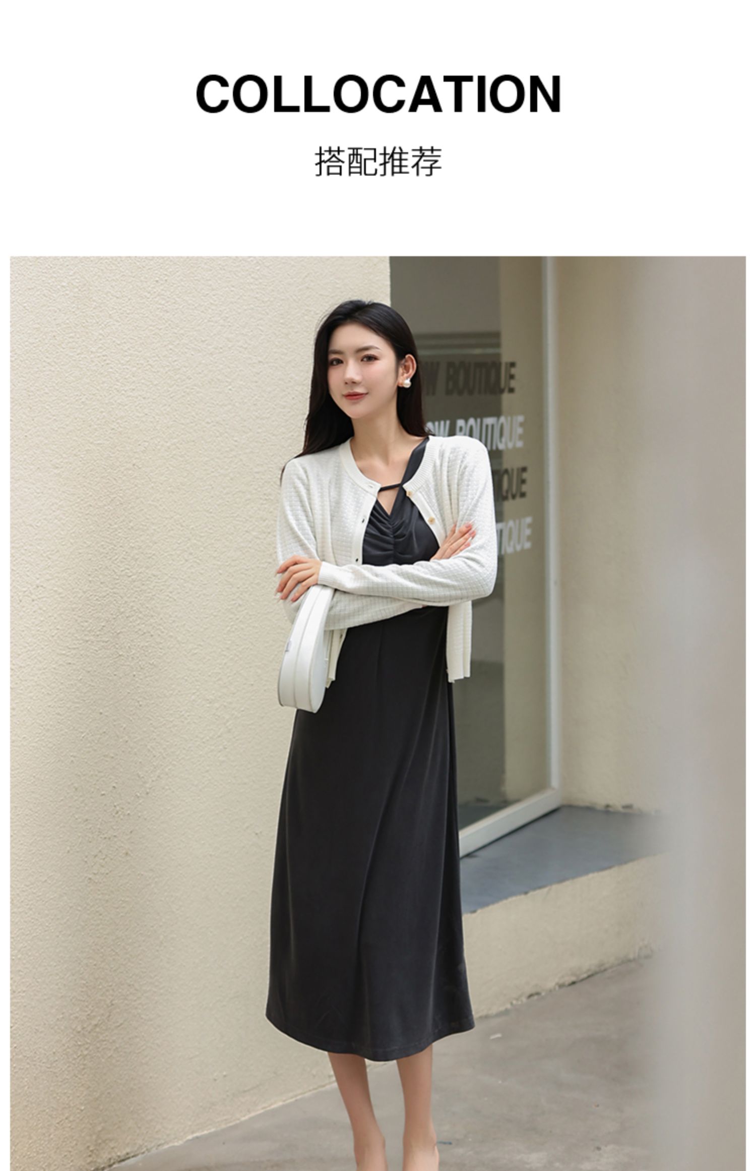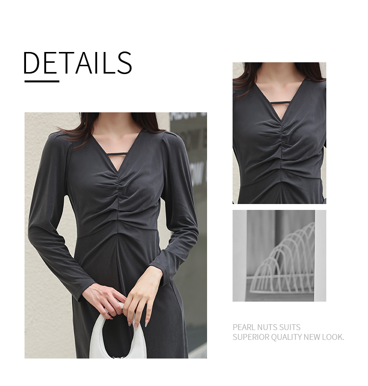 NUTS2023秋季新款V领泡泡袖连衣裙女高级感褶皱显身材4351001A1