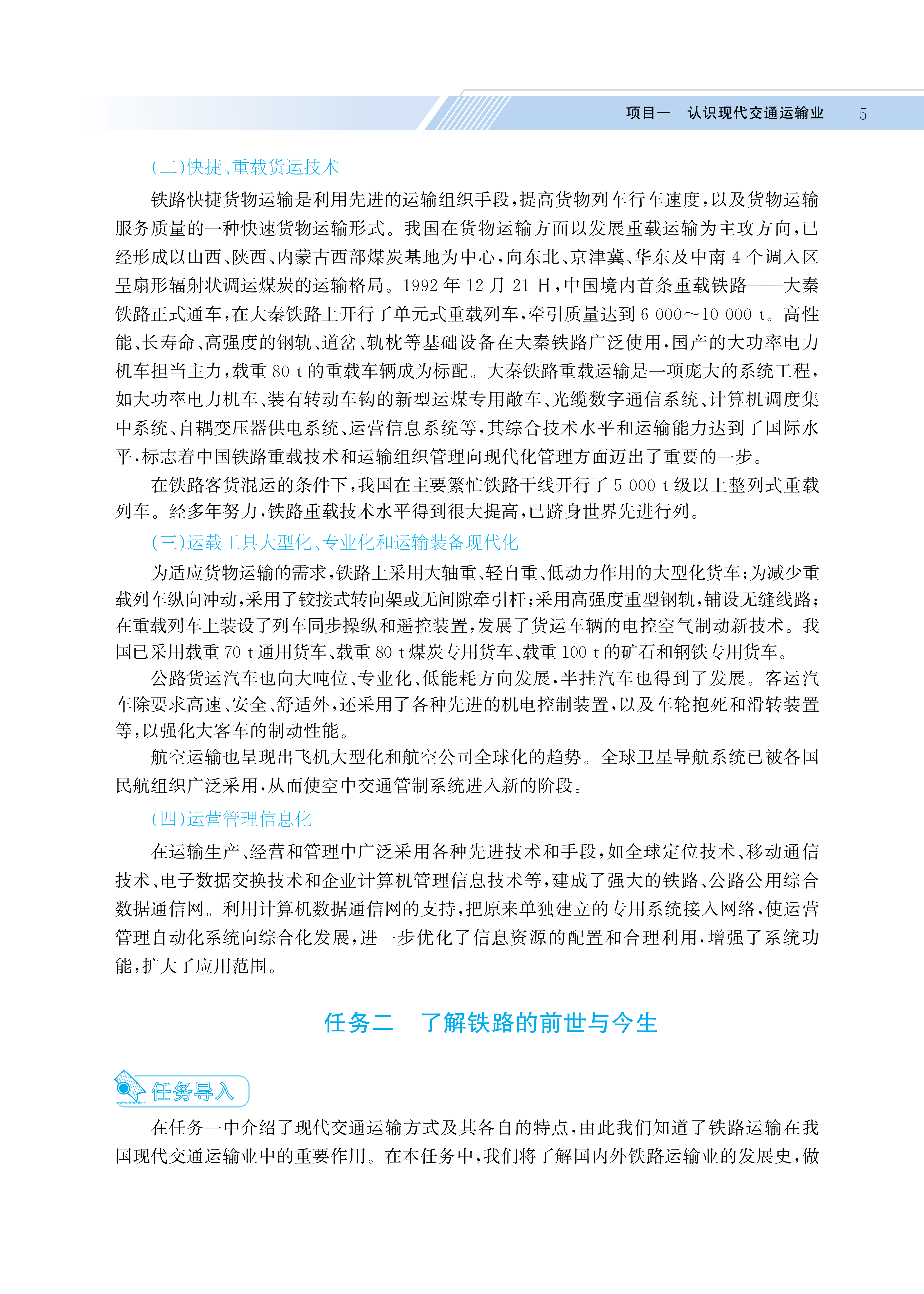 “铁道概论”是高等职业院校铁路相关专业开设的一门专业基础课,通过本书的学习可以为学生后续课程的学习奠定基础,提高学生对铁路的认识,增强学习的主动性。本书包含现代交通运输业、铁路线路、铁路车辆、铁路机车、动车组、铁路牵引供电系统、铁路信号、铁路车站、高速铁路与重载铁路等内容。本书可作为高等职业院校铁道类相关专业教材,也可作为铁路企业管理人员、专业技术人员、技能人员岗位培训和业务学习的参考用书。