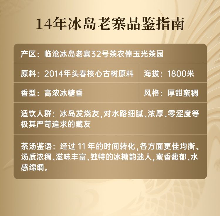 【11年陈老生茶】【老寨核心 茶界高奢】2014年临沧冰岛老寨核心资源古树纯料;严选老寨茶农俸玉光老哥私藏原料;品质收藏级;357g/饼 5饼/提