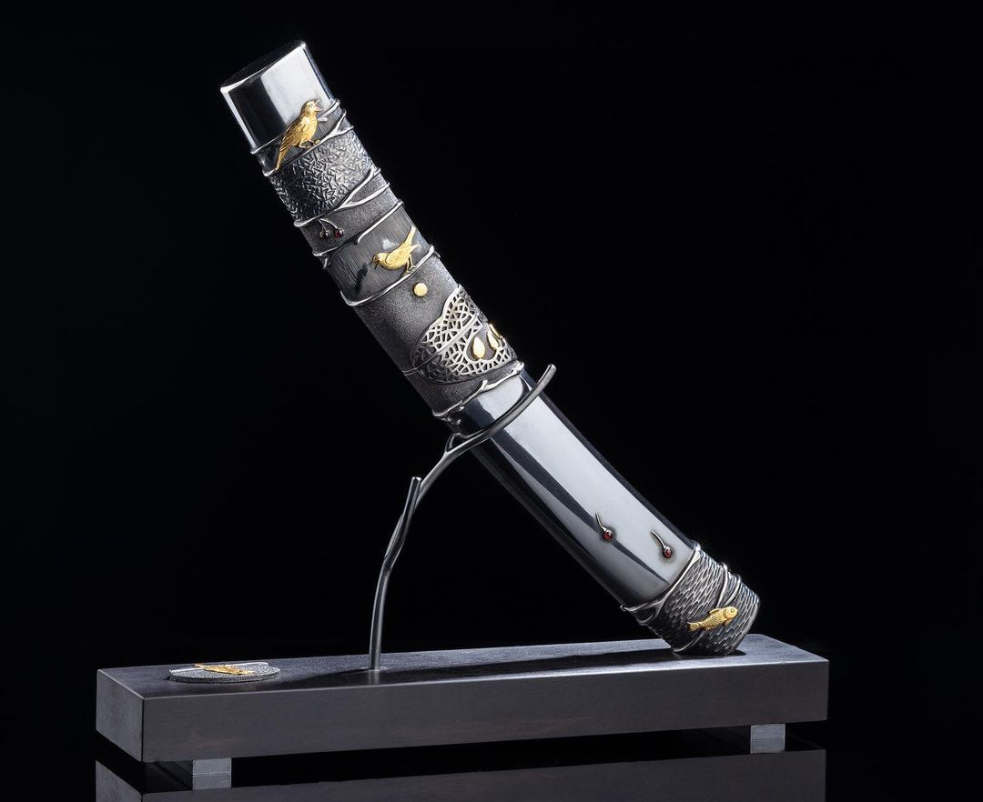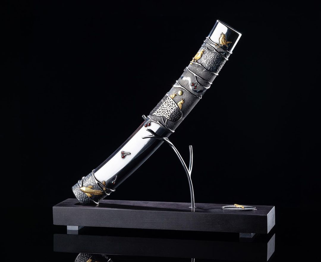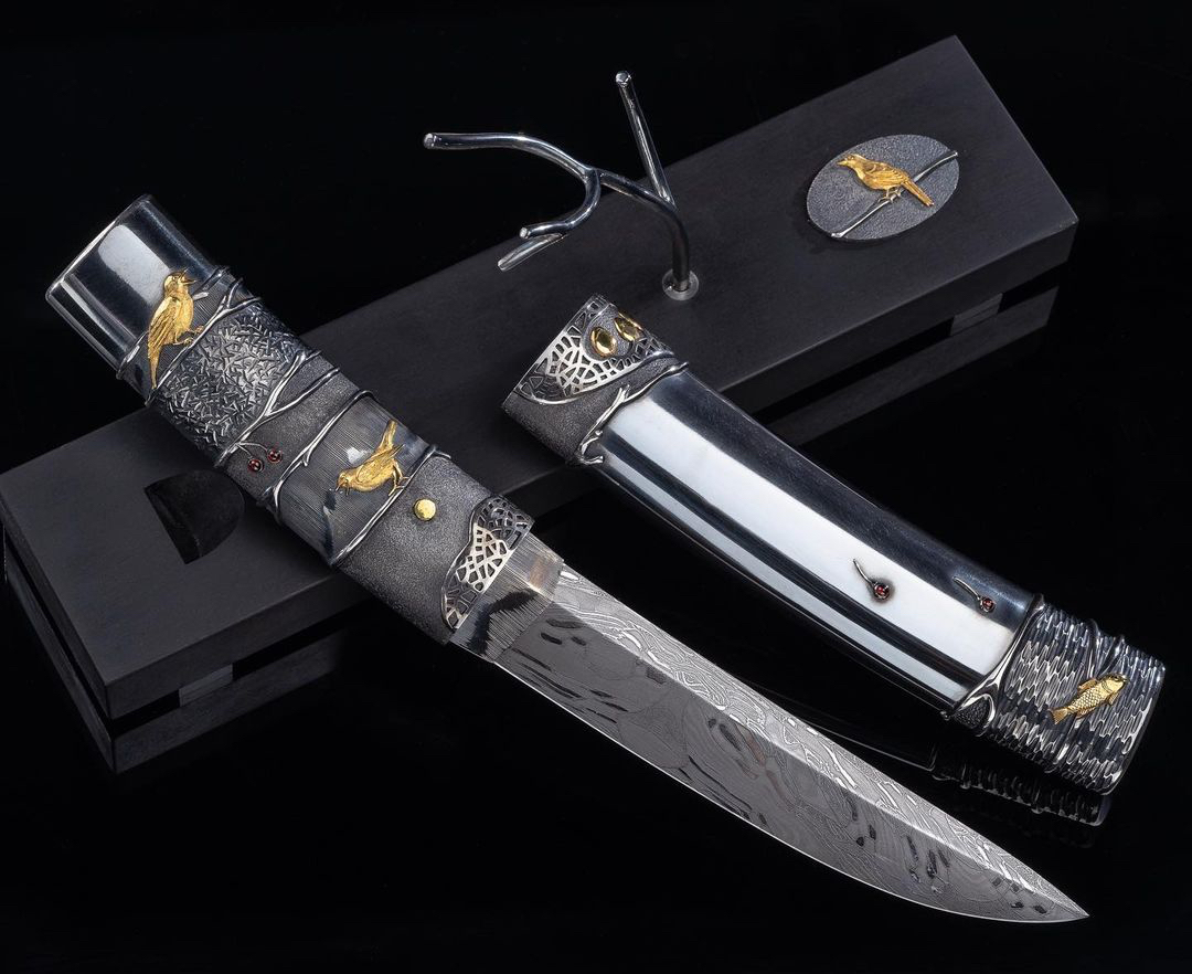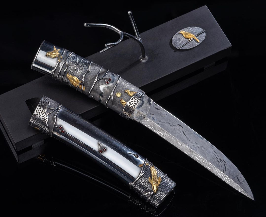 鸟儿筑巢主题,柄和鞘都是纯银手工雕刻的,图案十分生动,错金银工艺镶嵌24k纯金吊坠了几颗宝石,手锻大马士革钢