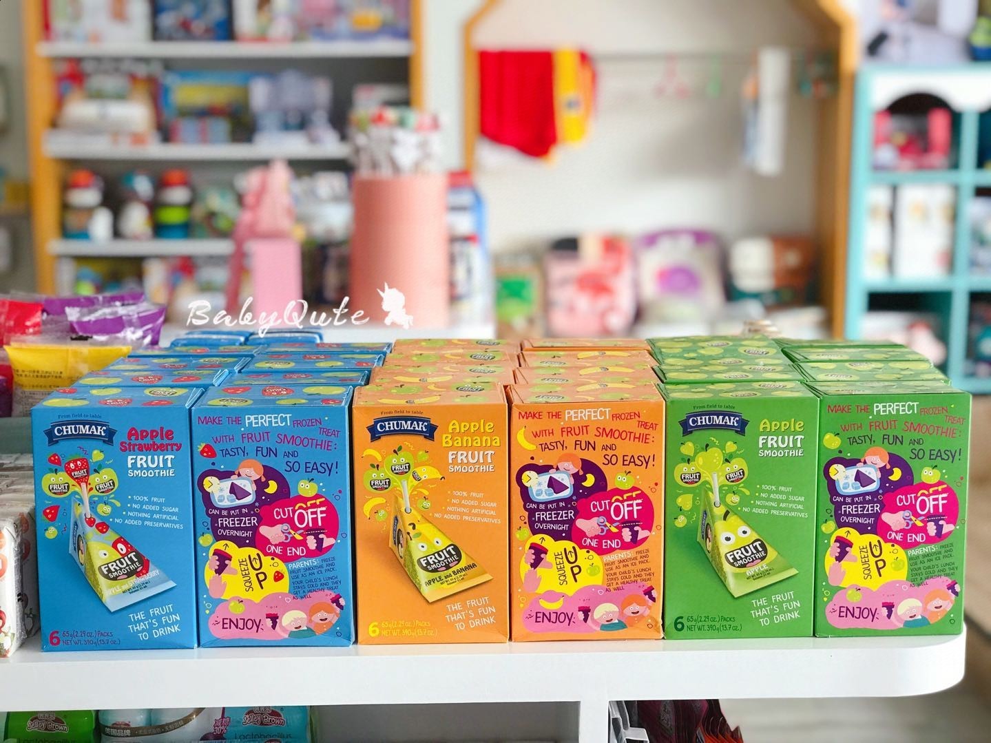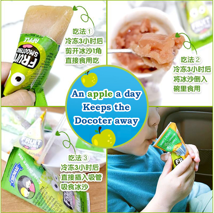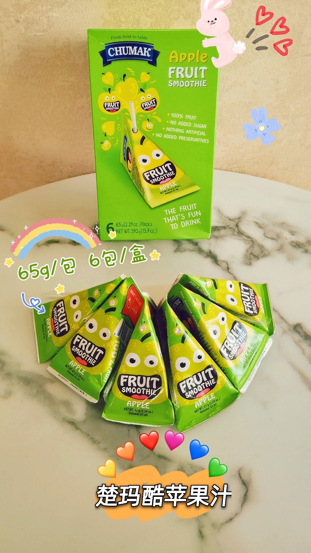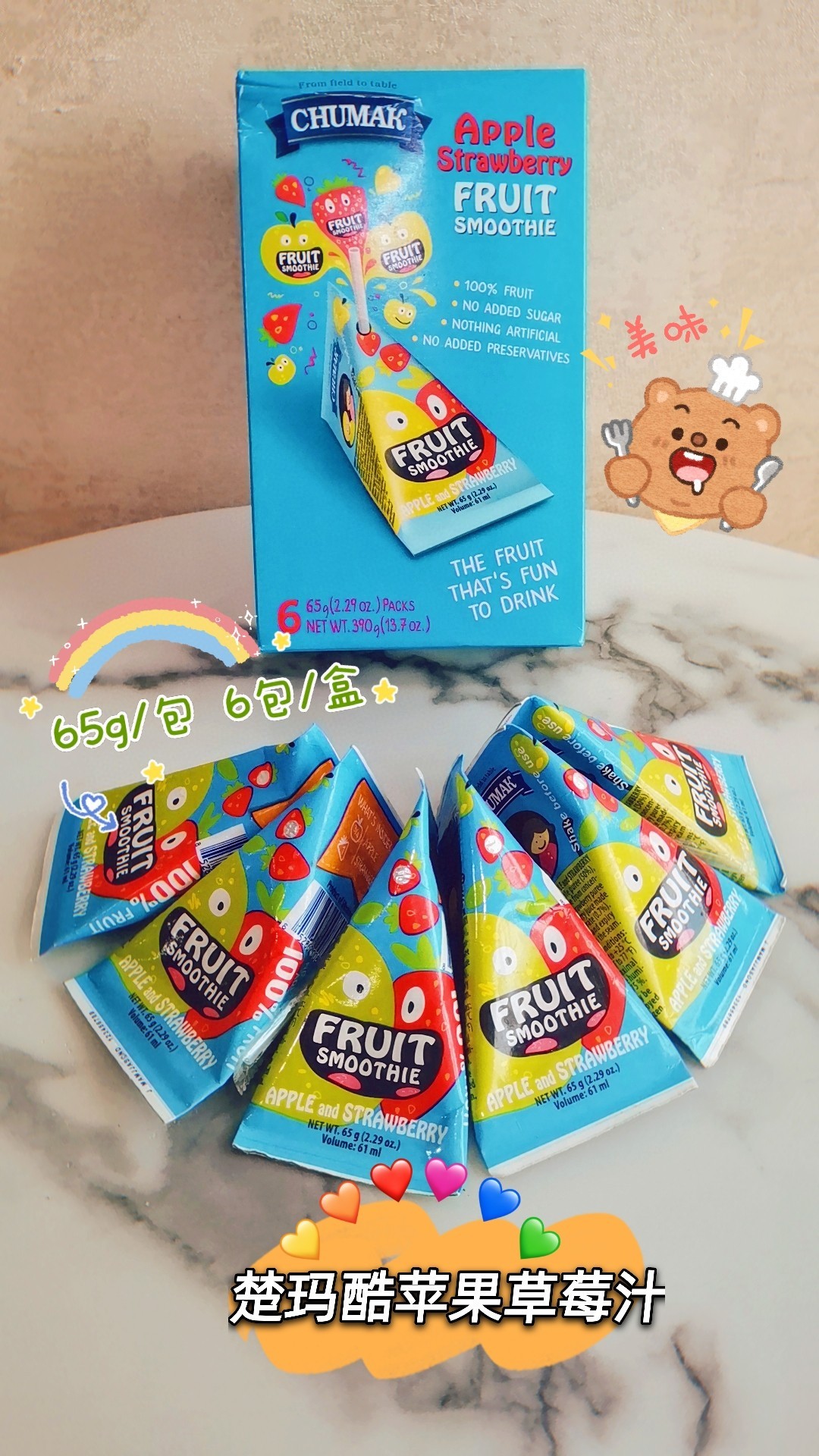 1包苹果味=1个🍎 1包苹果草莓味=3/4🍎+1/4🍓 1包香蕉苹果味=3/4🍎+1/4🍌 孩子们会拒绝吃水果 但不会拒绝楚玛酷! 酸酸甜甜很天然– 适合儿童饮用 🍊富含维生素C 🍉低钠 🍍富含铁元素