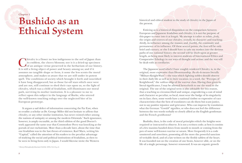 武士道是武士遵循的骑士道德准则:正直、勇敢、仁慈、尊重、诚实、荣誉和忠诚。受儒家思想等的影响,它以智慧和宁静来缓和武士的暴力。与《孙子兵法》和马基雅维利的《君主论》一样,稻造的这本书在那些寻求管理下属和战胜对手之道的军事和企业领导者中产生了深远的影响。